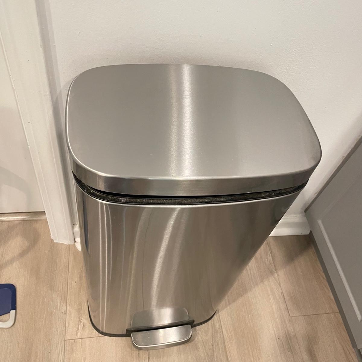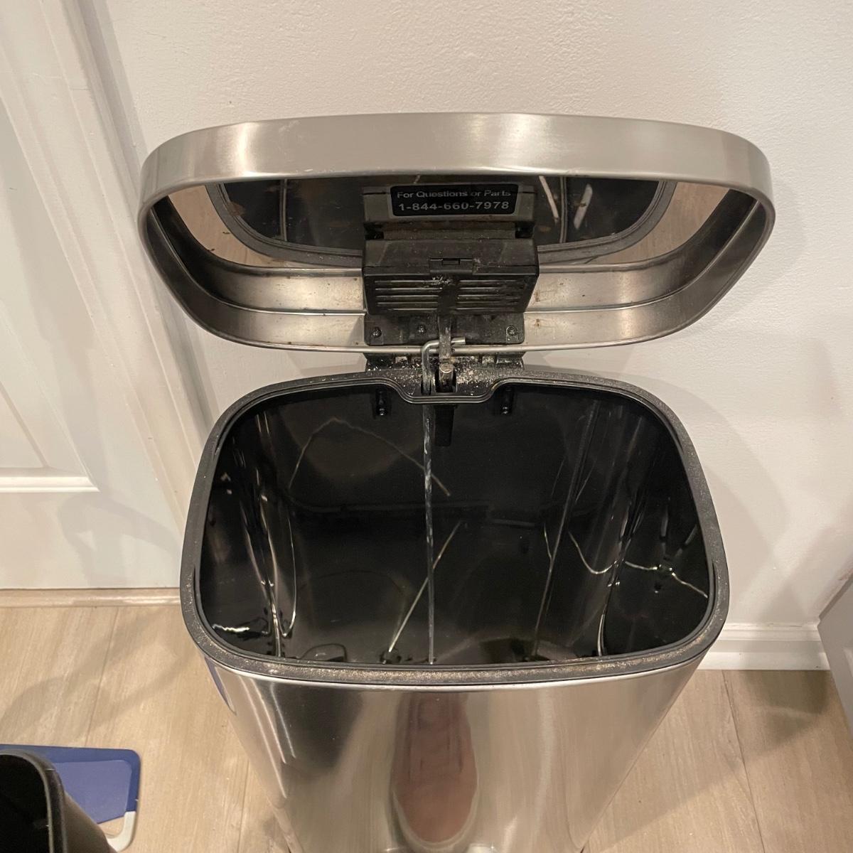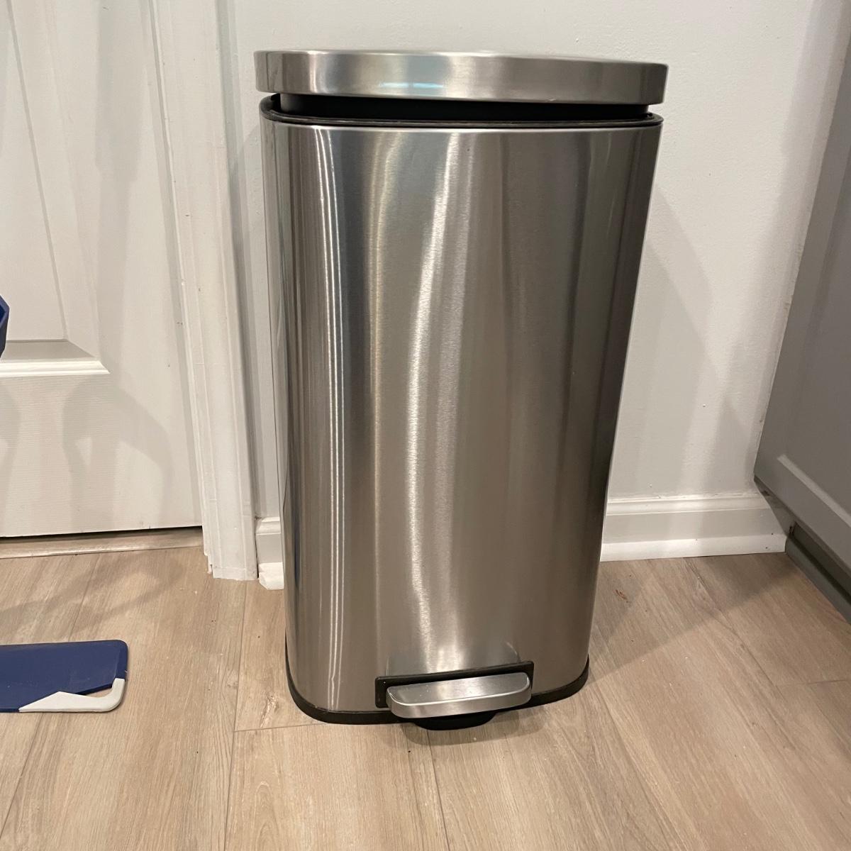 Everyday necessities here! A metal trash can with foot pedal measures 13.5” x 11” x 25”H. Lot also includes a Bona mop with five pads, a 12.5” high folding foot stool and a plastic sink draining mat. An opened Bona cleaning solution bottle is included if buyer wishes, we cannot verify the contents of the bottle. See images. Local pick up only.