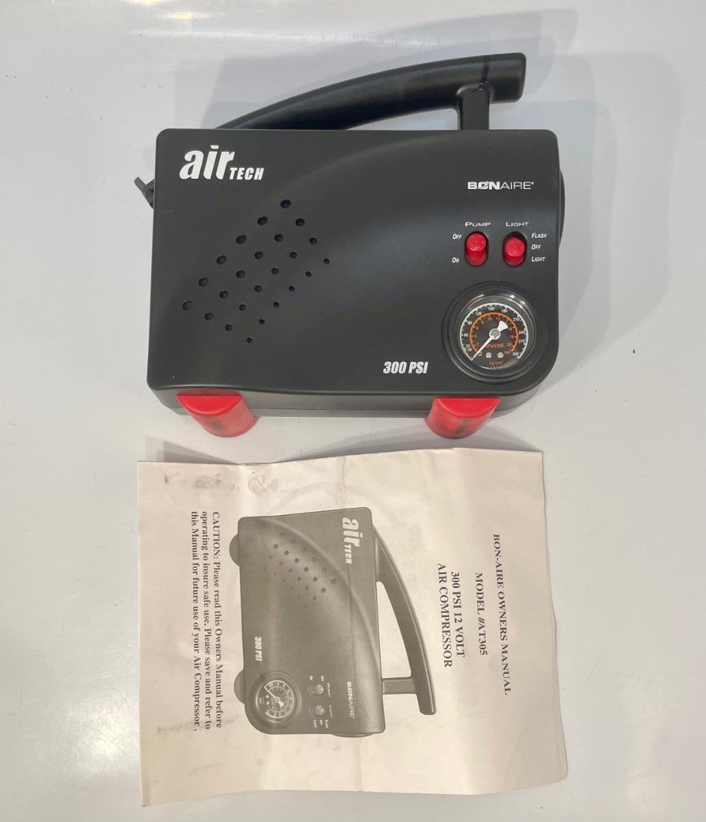 Bon-Aire 300 PSI 12-Volt Air Compressor. Plugs into auto cigarette lighter. Has built-in light and pressure gauge.