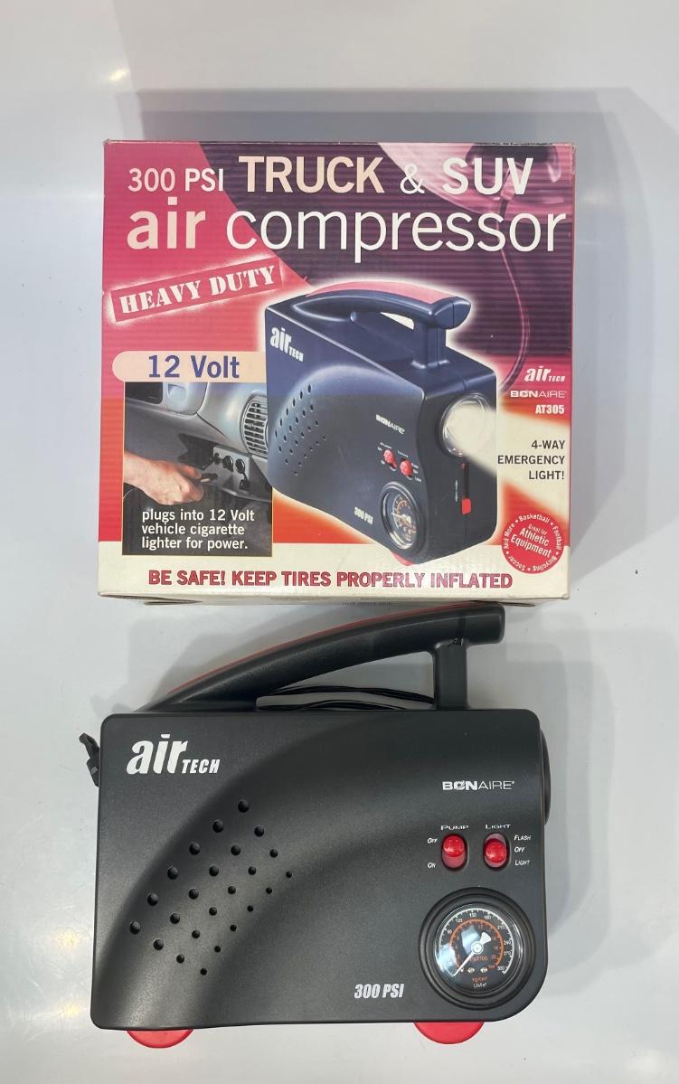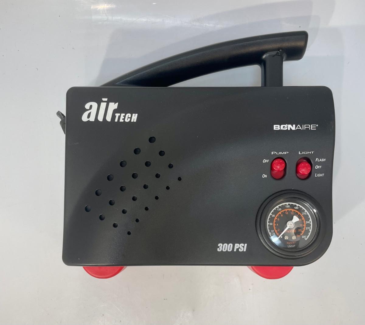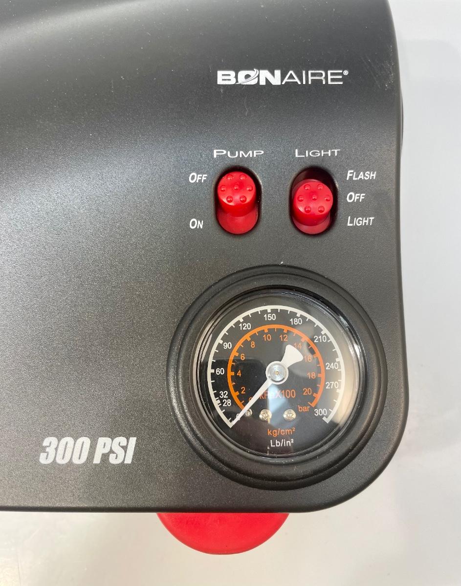 Bon-Aire 300 PSI 12-Volt Air Compressor. Plugs into auto cigarette lighter. Has built-in light and pressure gauge.