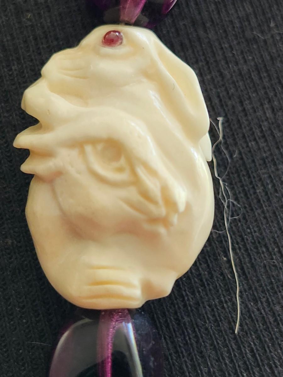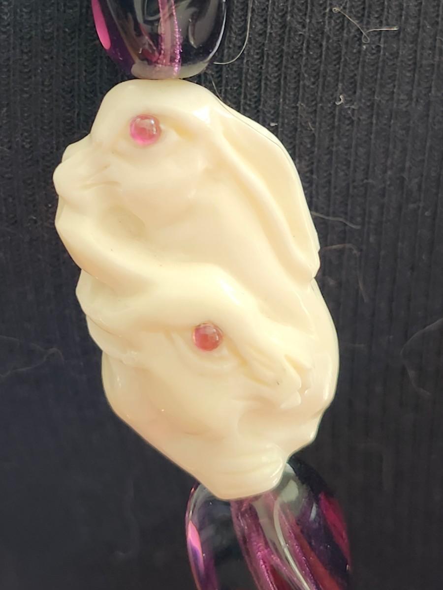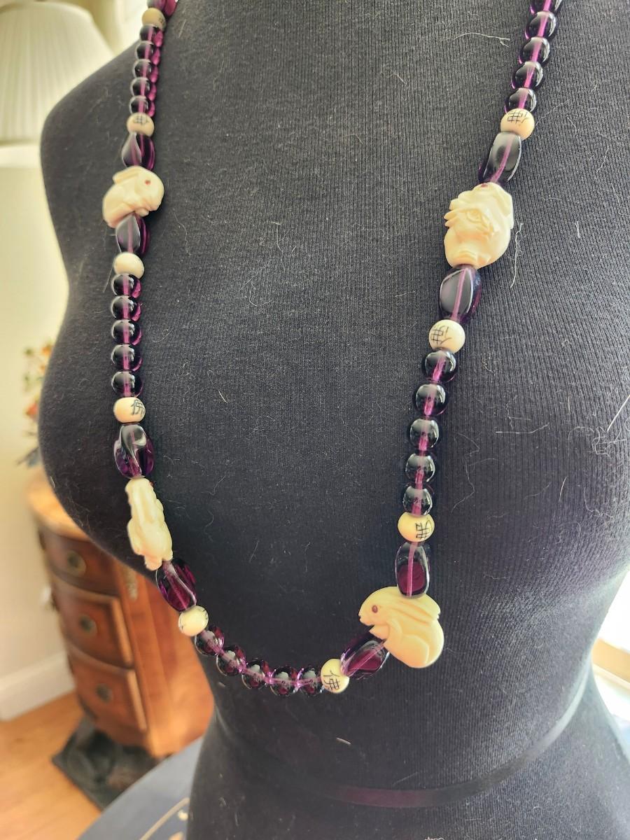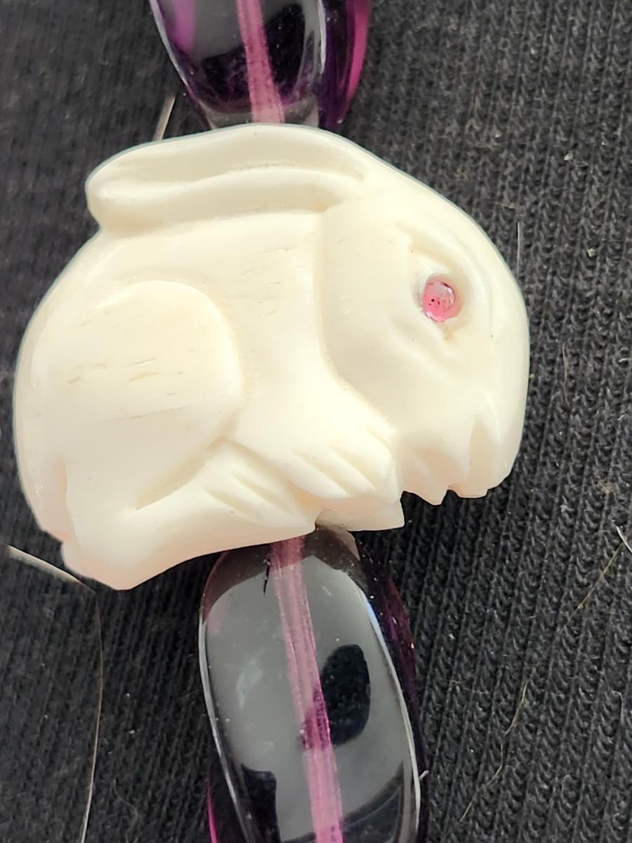 This is a unique piece, with the bunnies carved from water buffalo bone. The purple beads are glass.