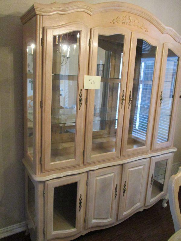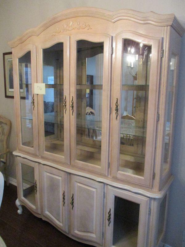 Bone dining room china cabinet. Approx 85 in tall. 64 in width. 16 inches deep. Separates in 2 pieces.