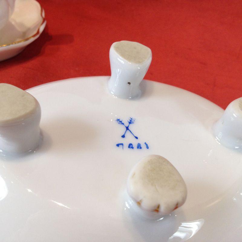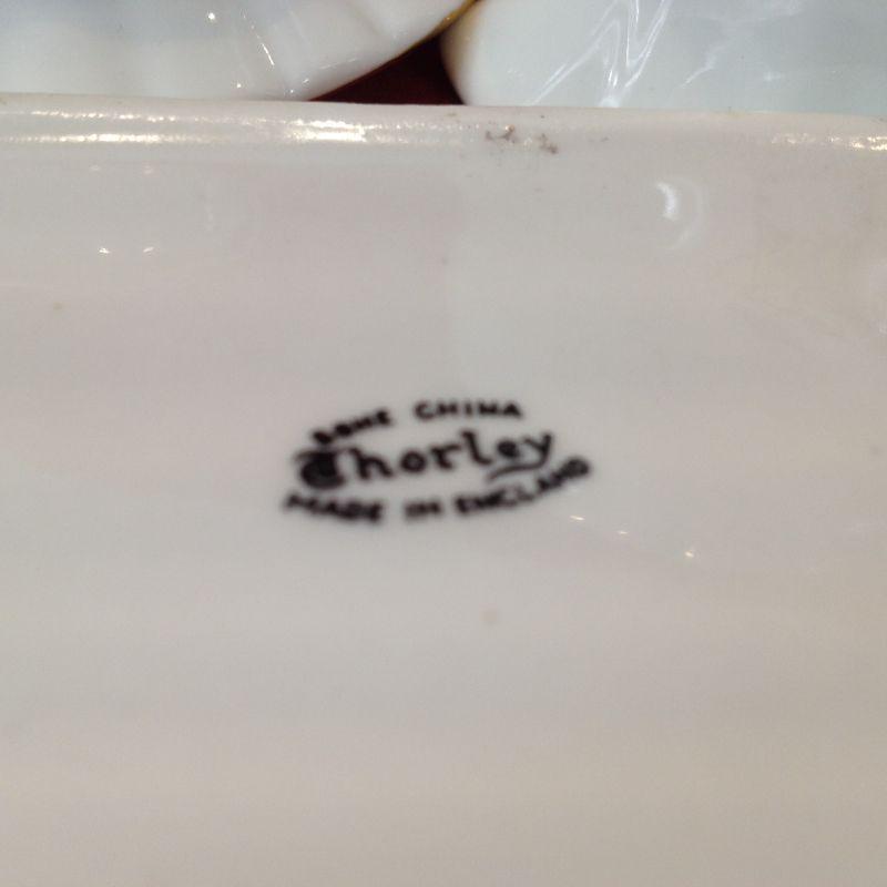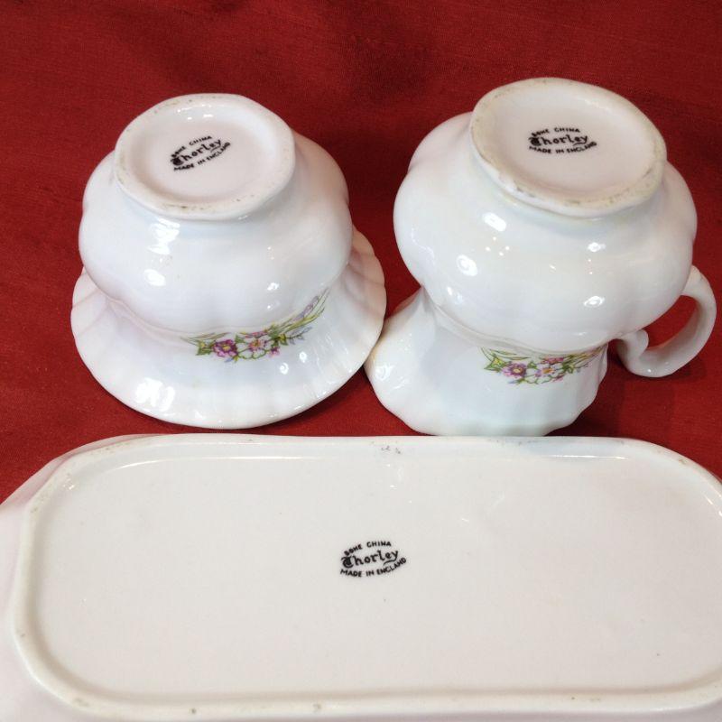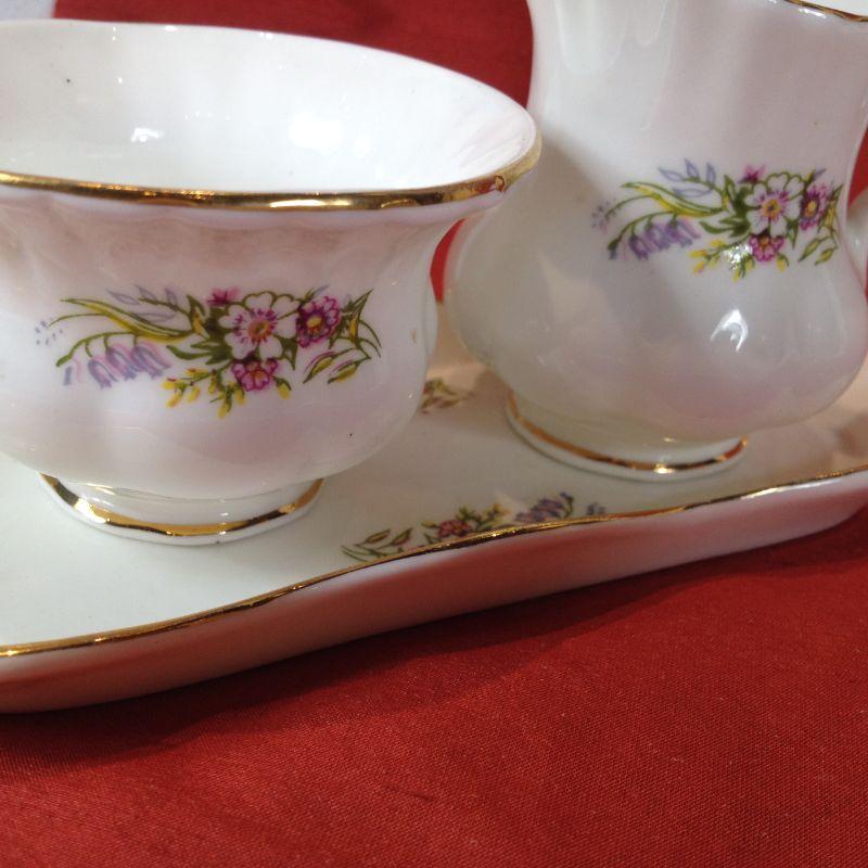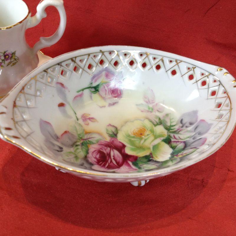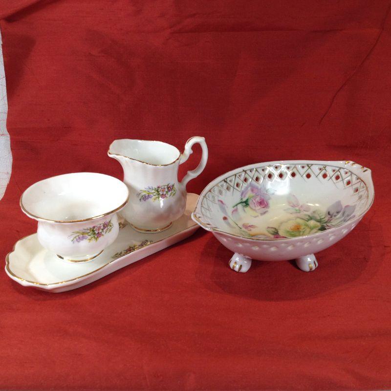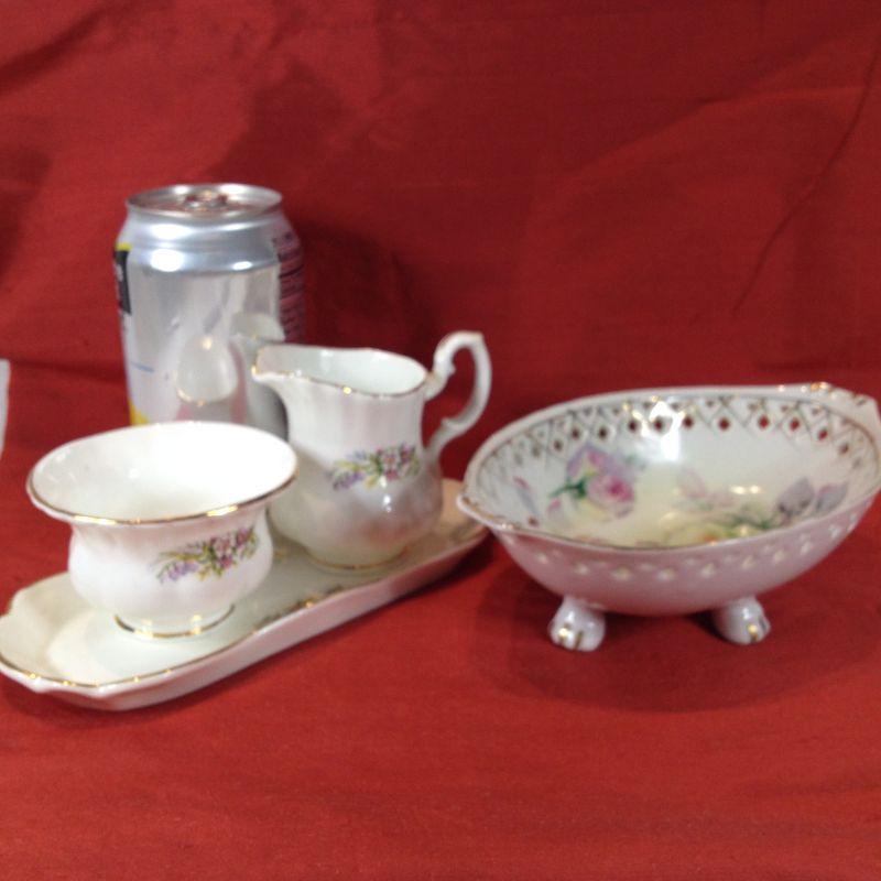 This lot includes a small English Sugar and Creamer on matching serving tray. The tray measures 7 1/2-inches long. Also included is a lovely hand-painted, footed, pierced oval bowl. It measures 6 1/2-inches long. All are in very good condition.