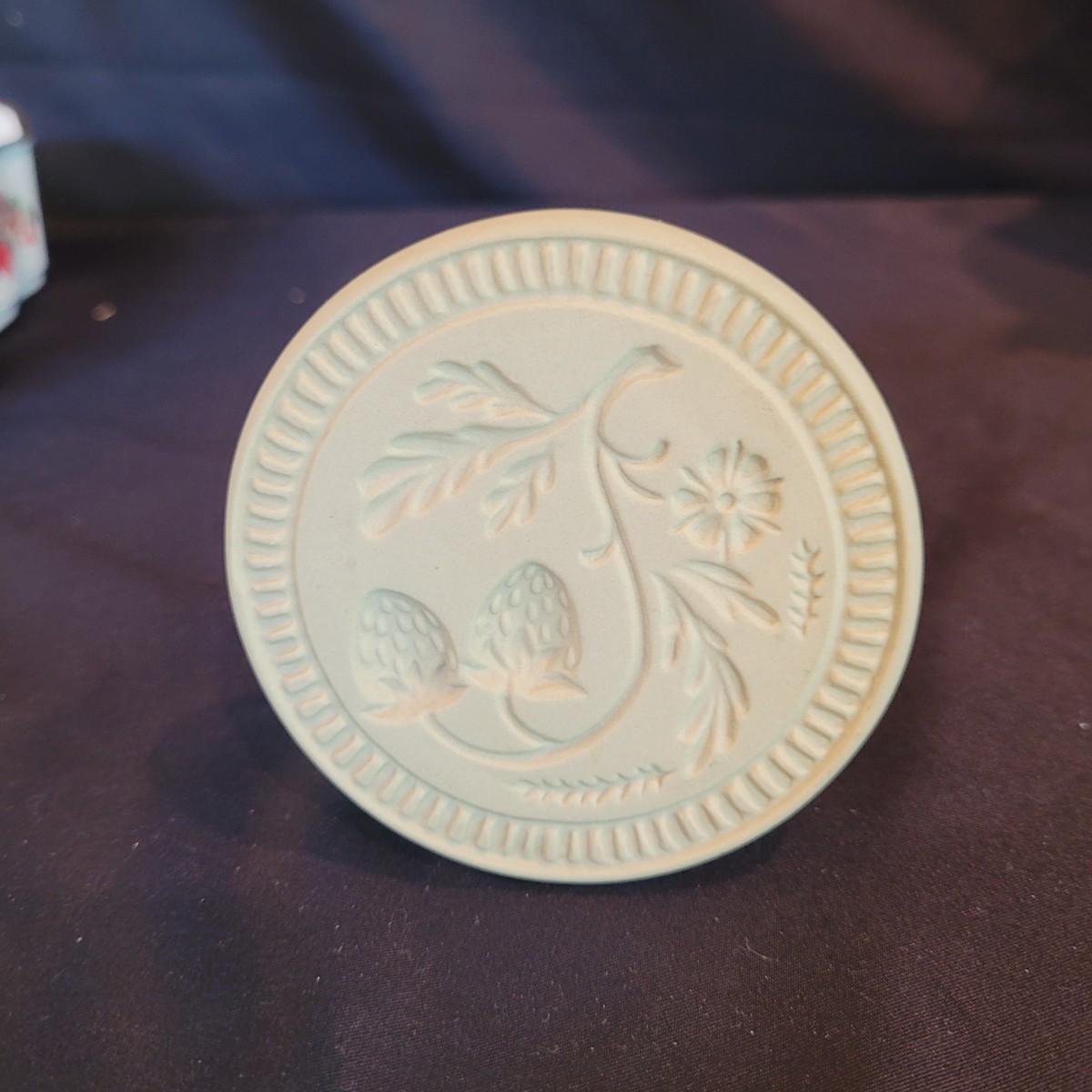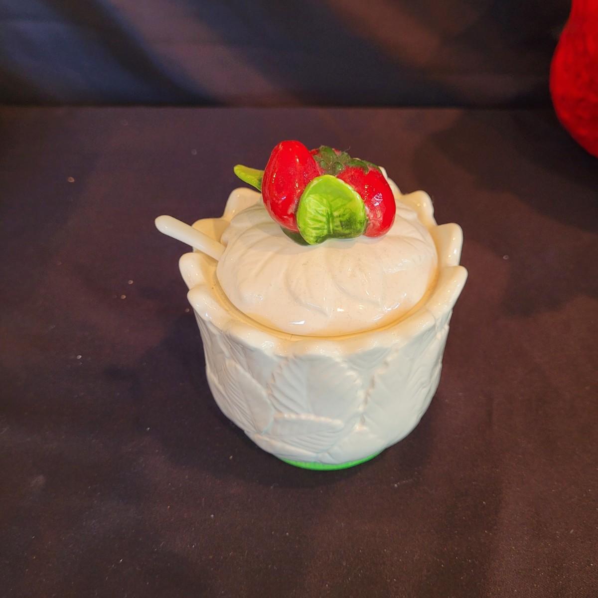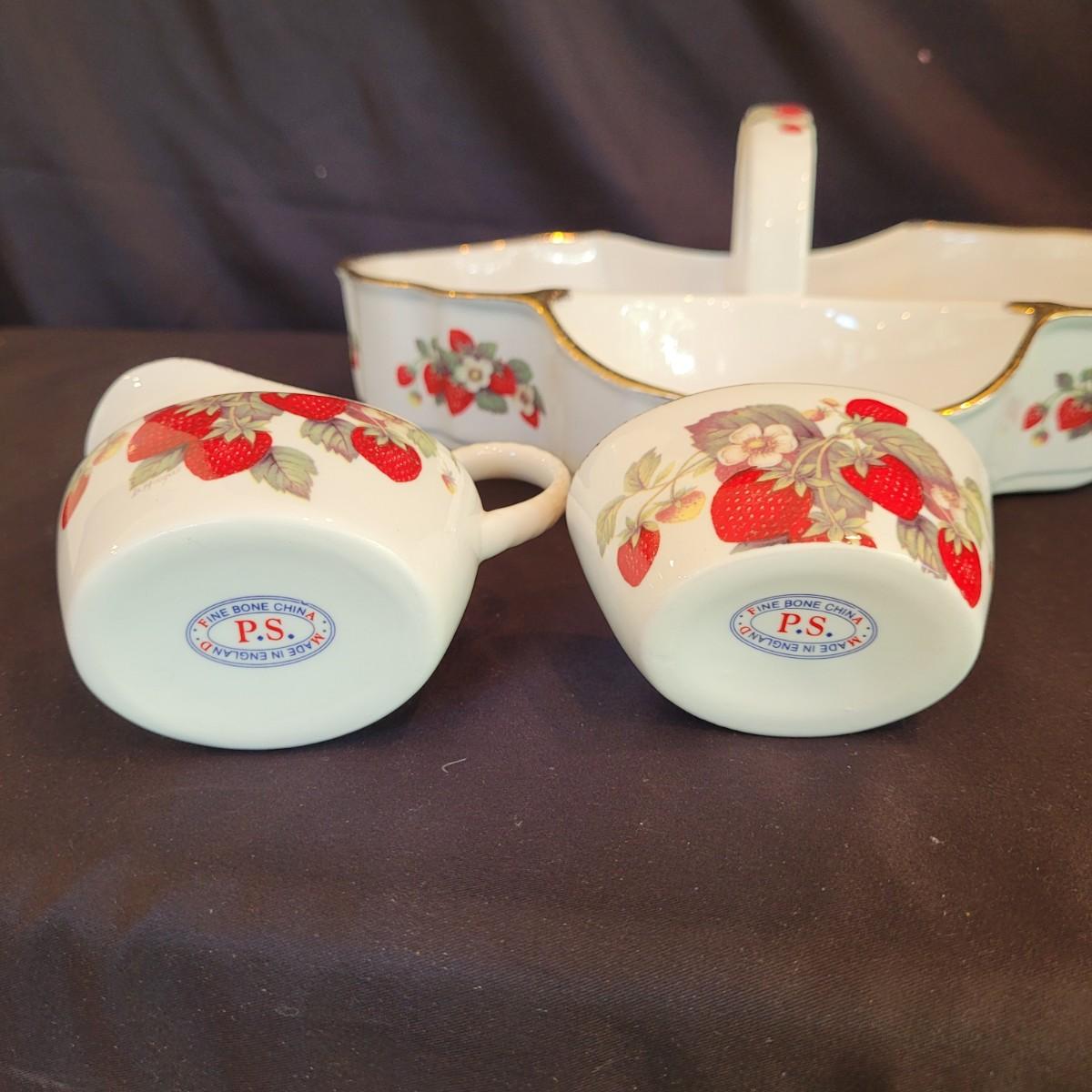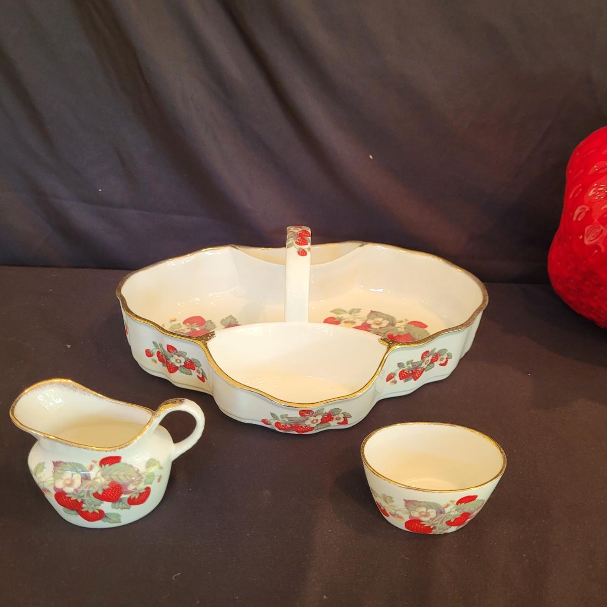 English fine bone china serveware set includes a strawberry themed tray with a handle and creamer and sugar bowls. Also included is a larger sugar bowl, a strawberry cookie press, The large lidded strawberry jar which appears to be ceramic. Tray measures approximately 12” x 10” x 4”H. Shipping available.