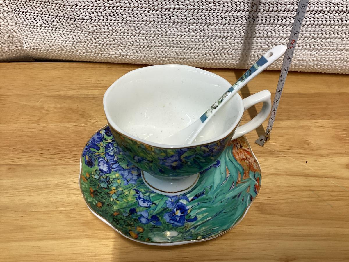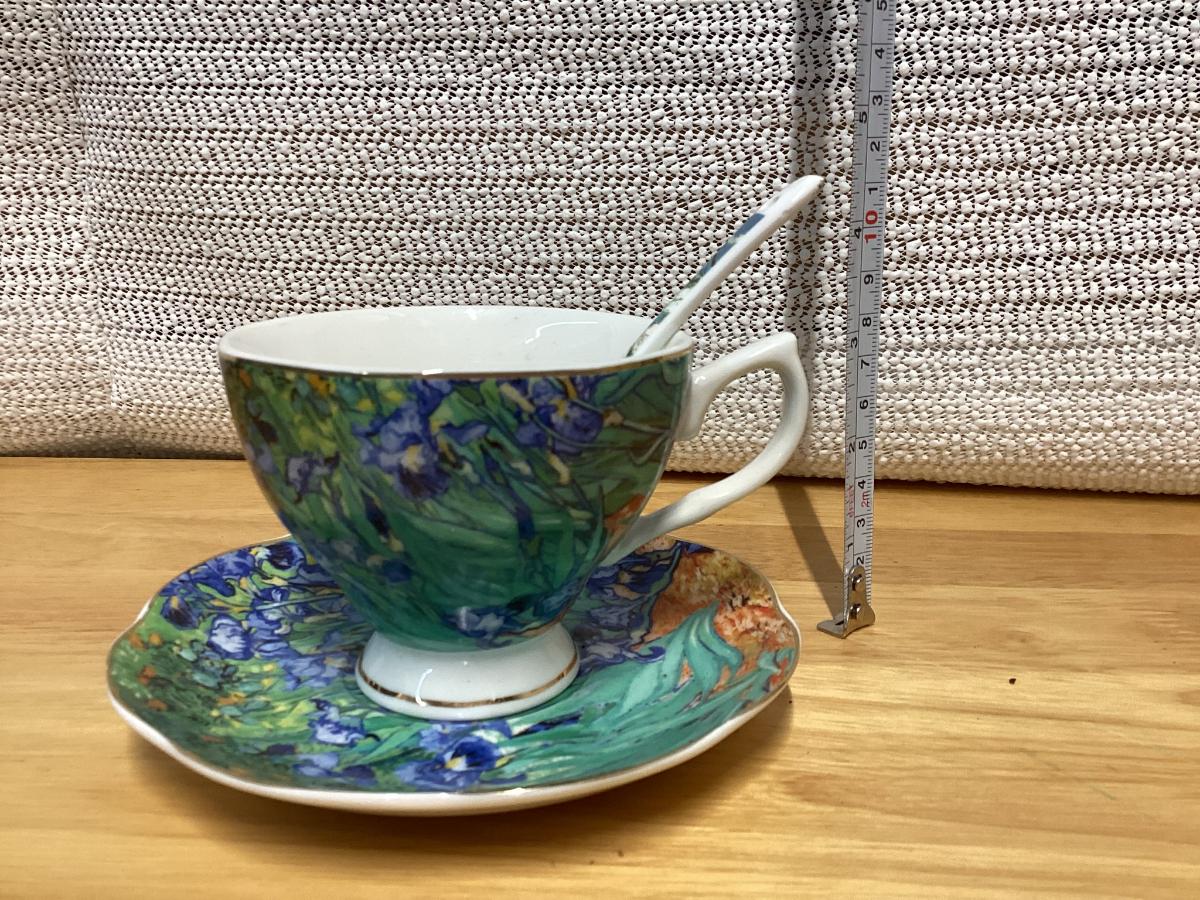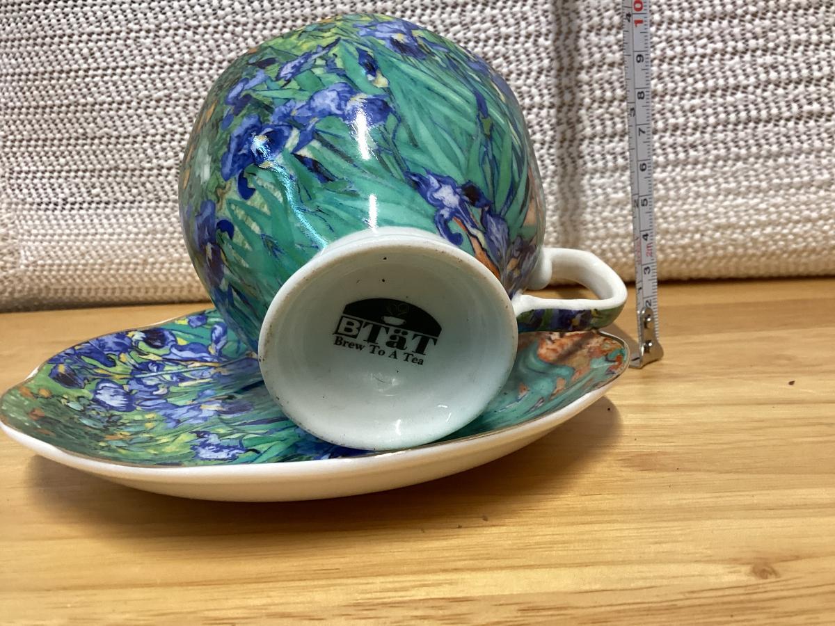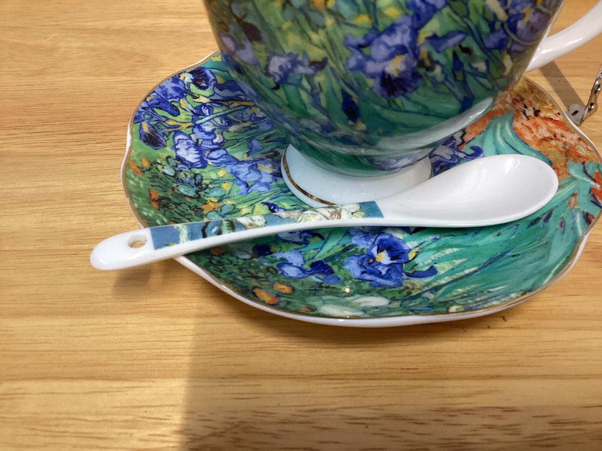 Bone China teacup and saucer set featuring a design inspired by Vincent van Gogh's painting Irises.
