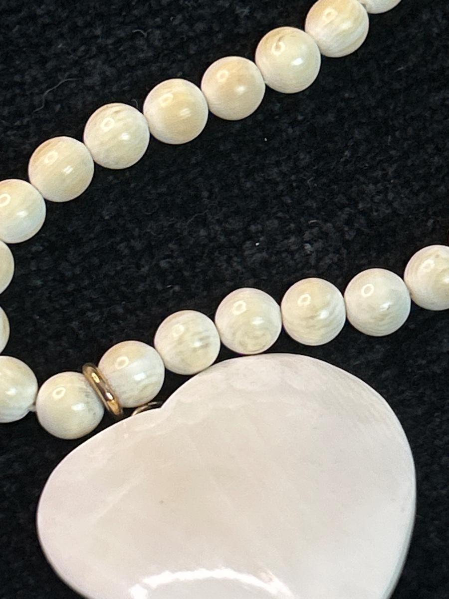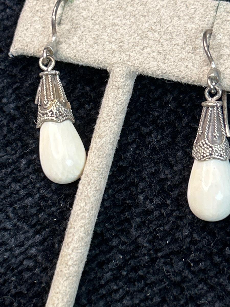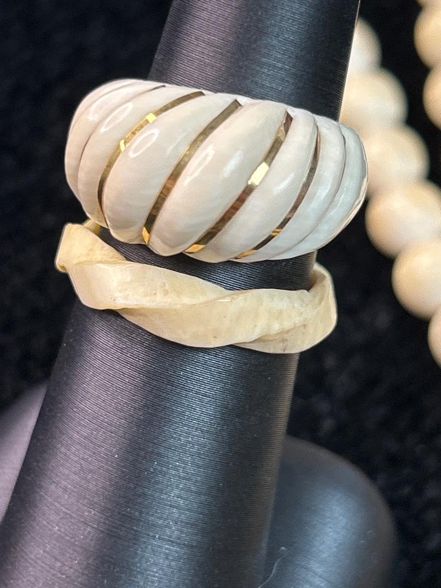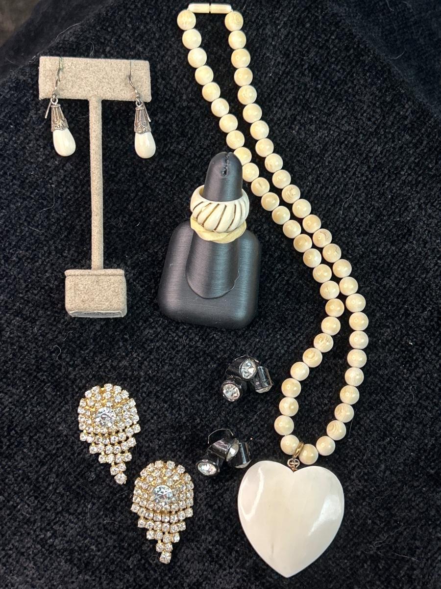 I don’t know what material the ring on the bottom is made out of but the earrings the necklace and the other ring are bone. The earrings are pierced, and the other two items are vintage dress clips. The gold tone dress clips are stamped patent pending.
