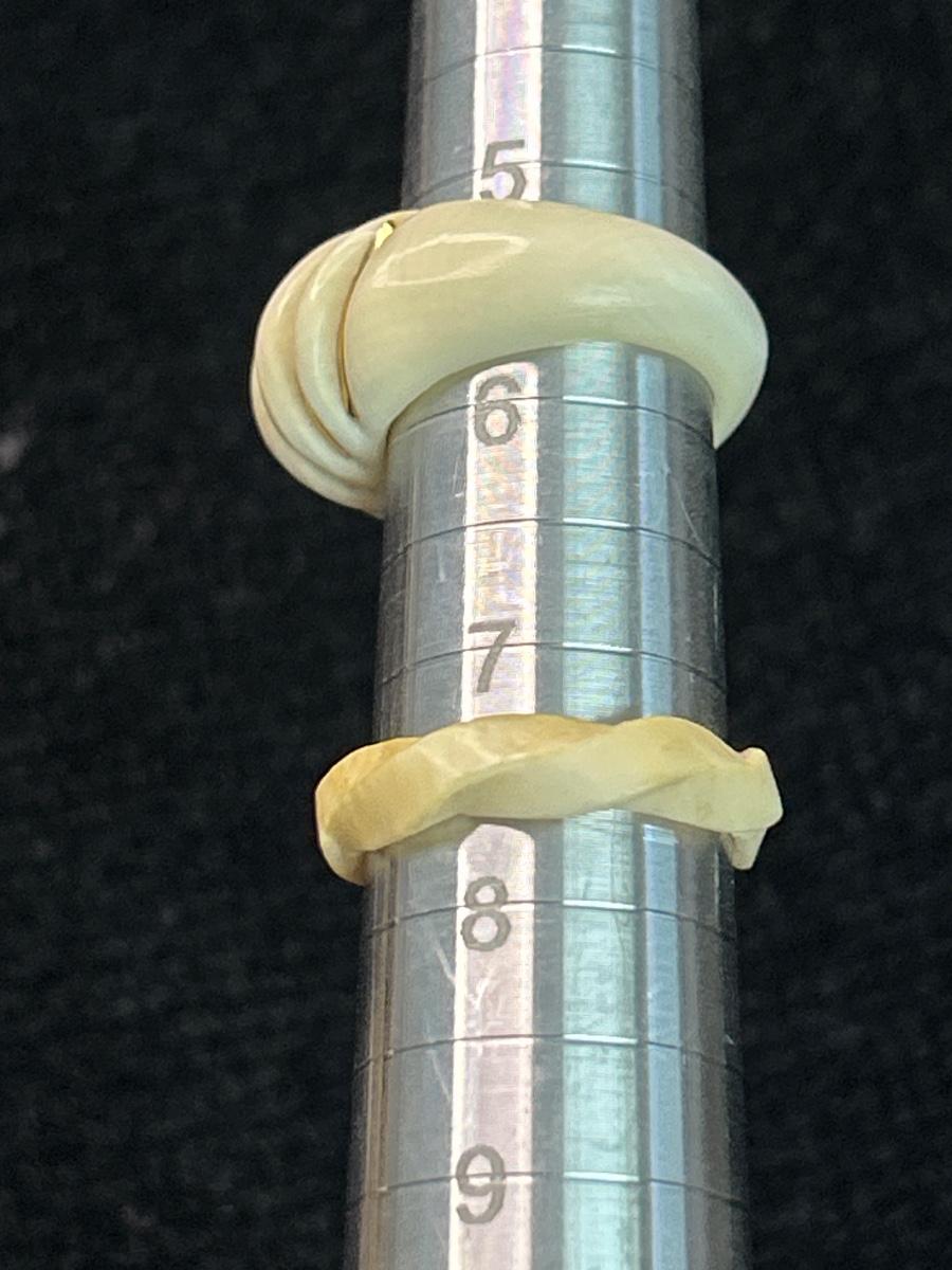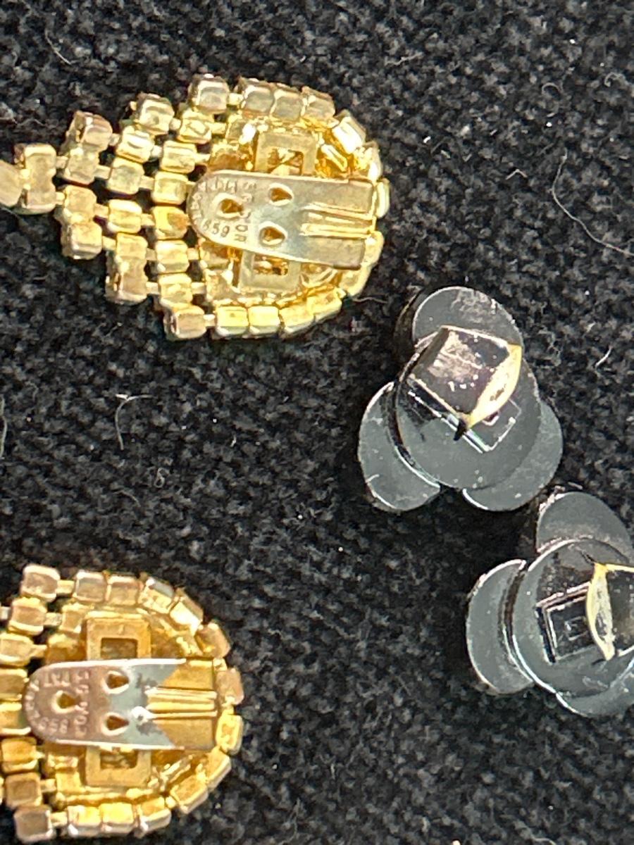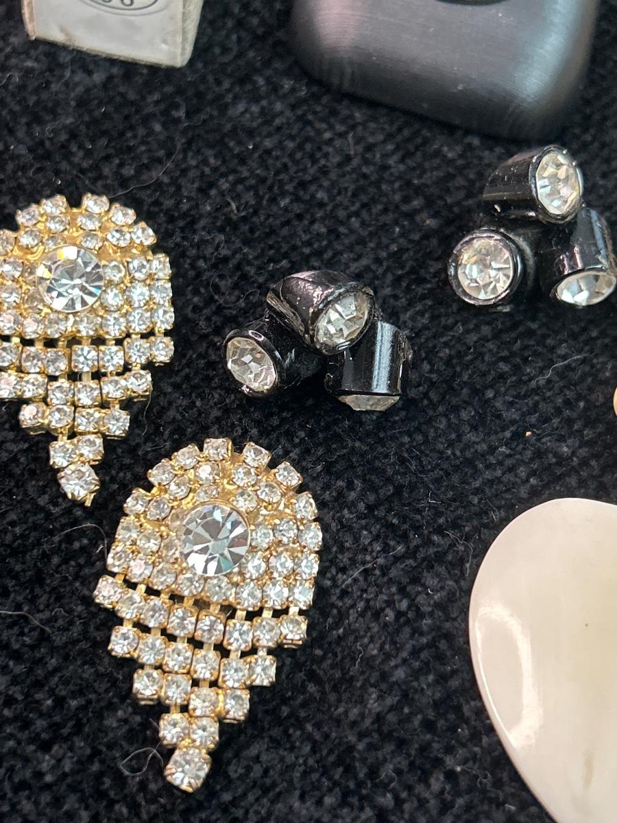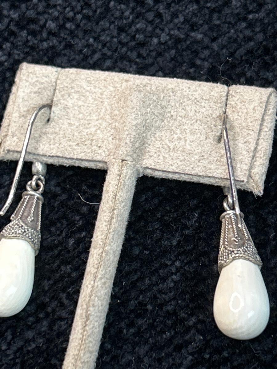 I don’t know what material the ring on the bottom is made out of but the earrings the necklace and the other ring are bone. The earrings are pierced, and the other two items are vintage dress clips. The gold tone dress clips are stamped patent pending.
