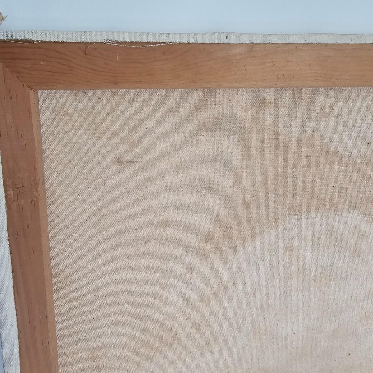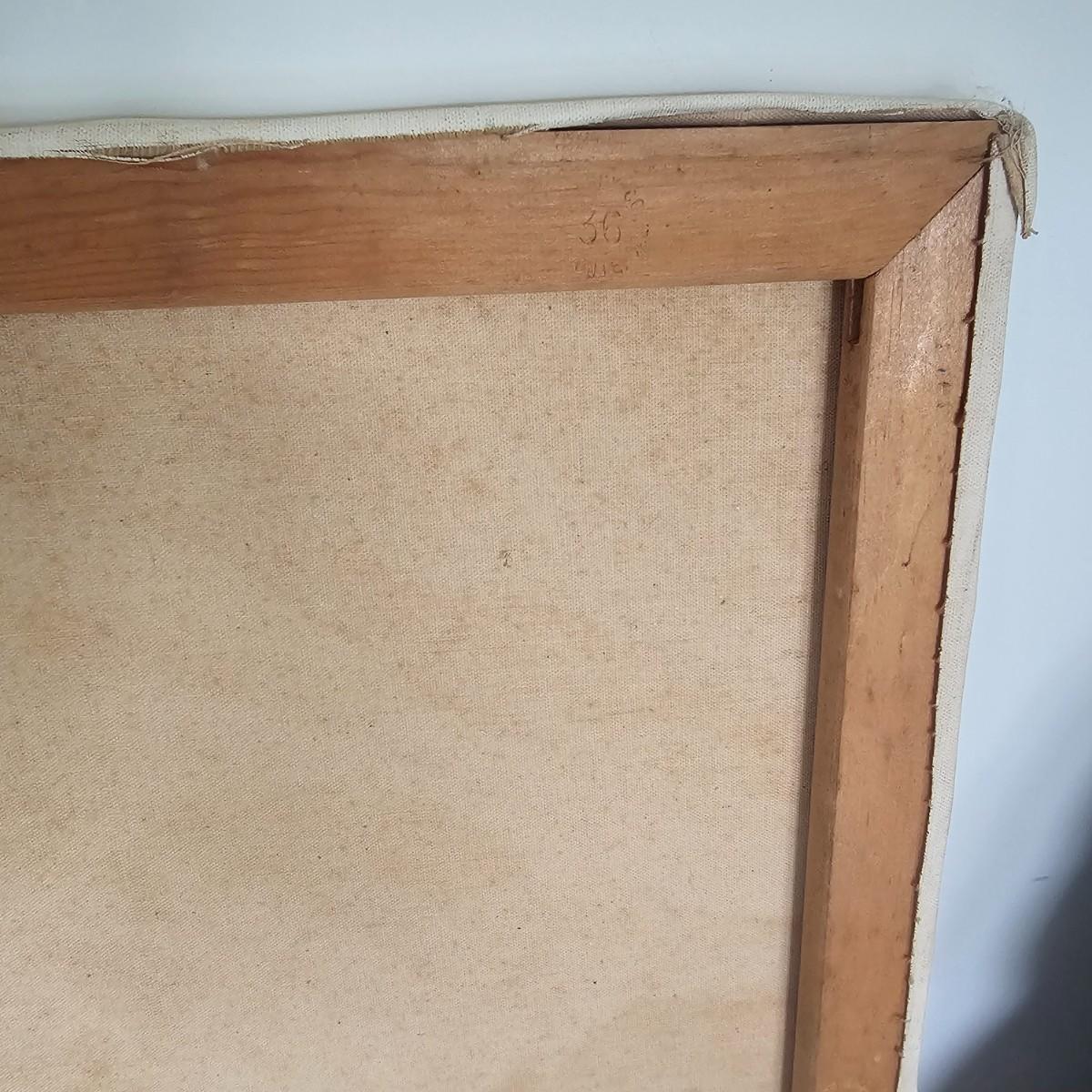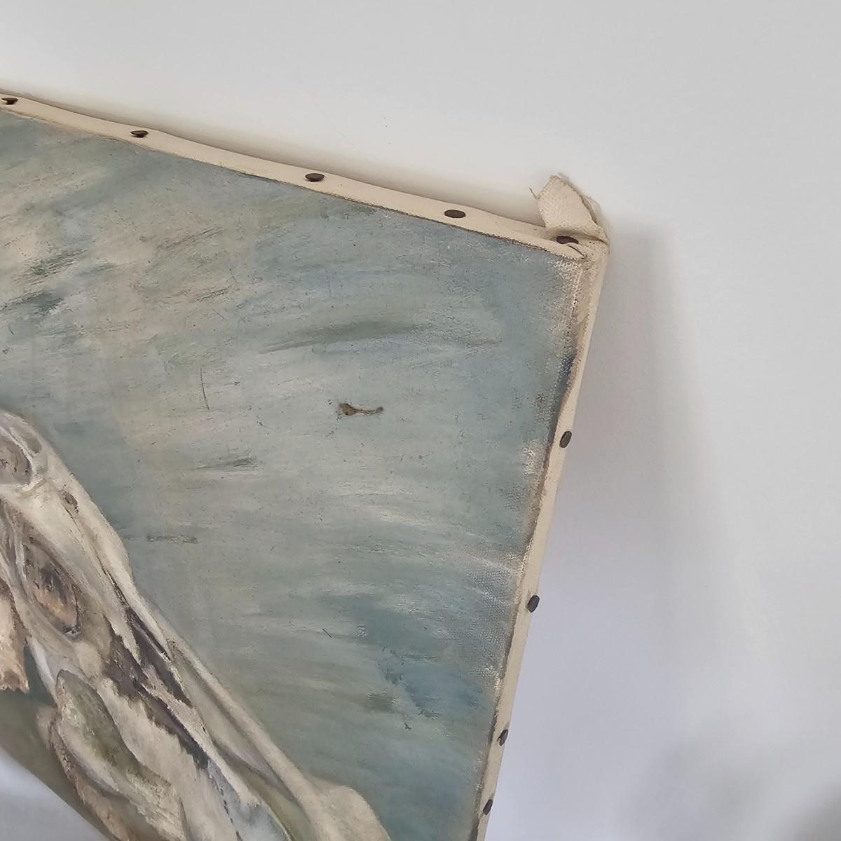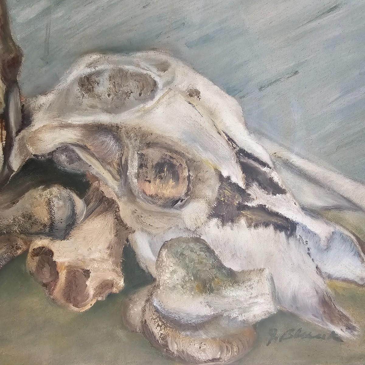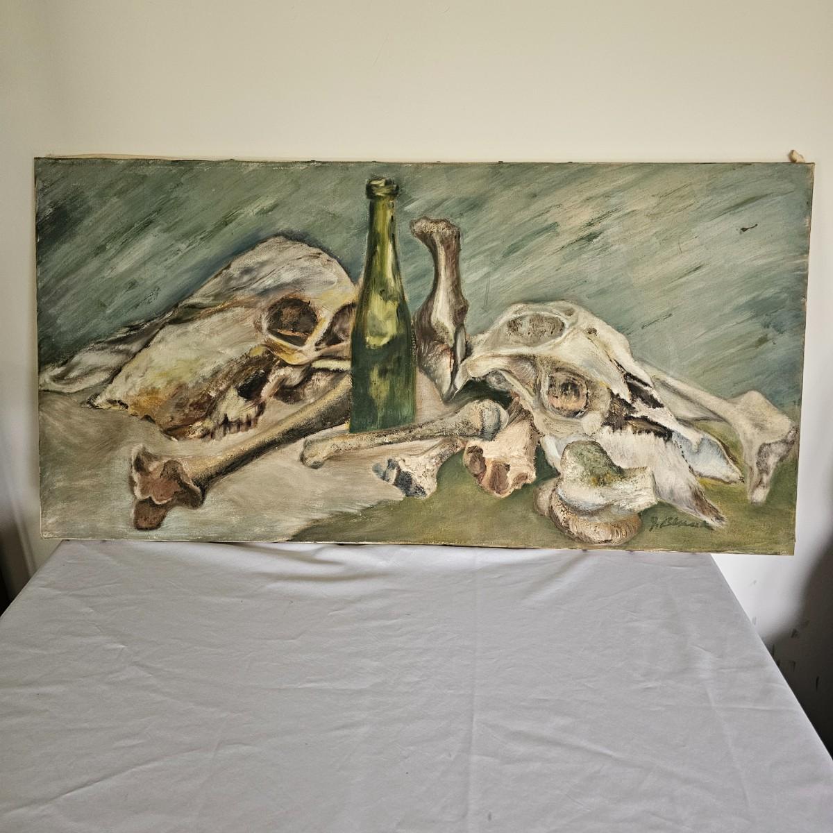 Unusual mixture of skulls, large bones and a solitary wine bottle in this open framed oil on canvas. Angular background adds to the mystery of the concept of the image. Signed by artist Joyce Blunk, this item measures 36" x 18"H. Some discoloring and stains on back of canvas, and nails securing to frame have some rust. See photos for details. Shipping available. Shipping can be costly. We suggest contacting our preferred local shipping provider, Postage Express, with dimensions and getting an estimate before bidding: (828) 255-9250 or shipping@postageexpressnc.com.