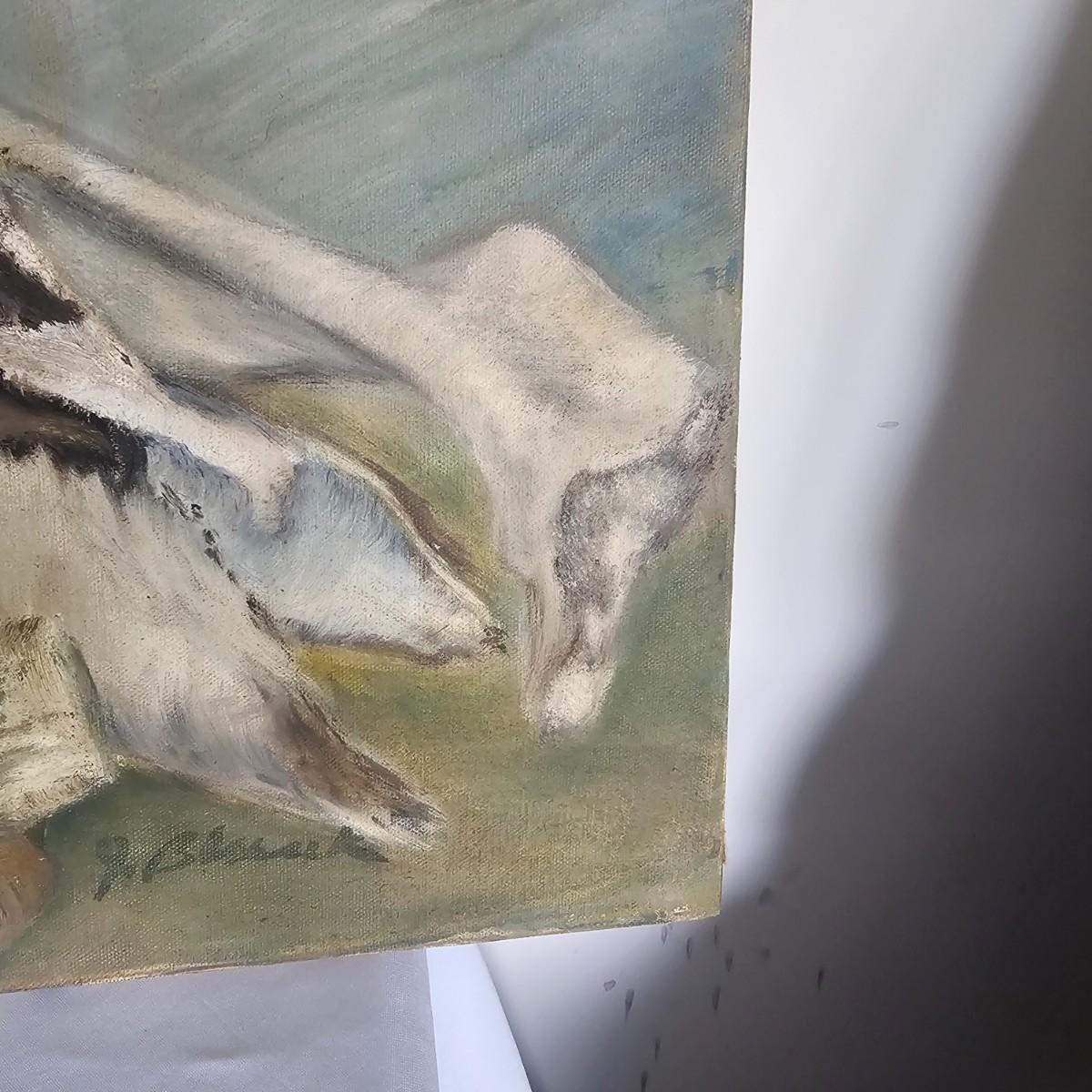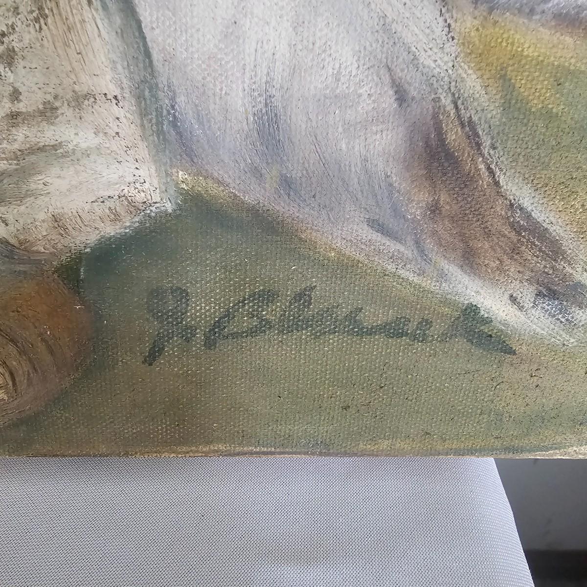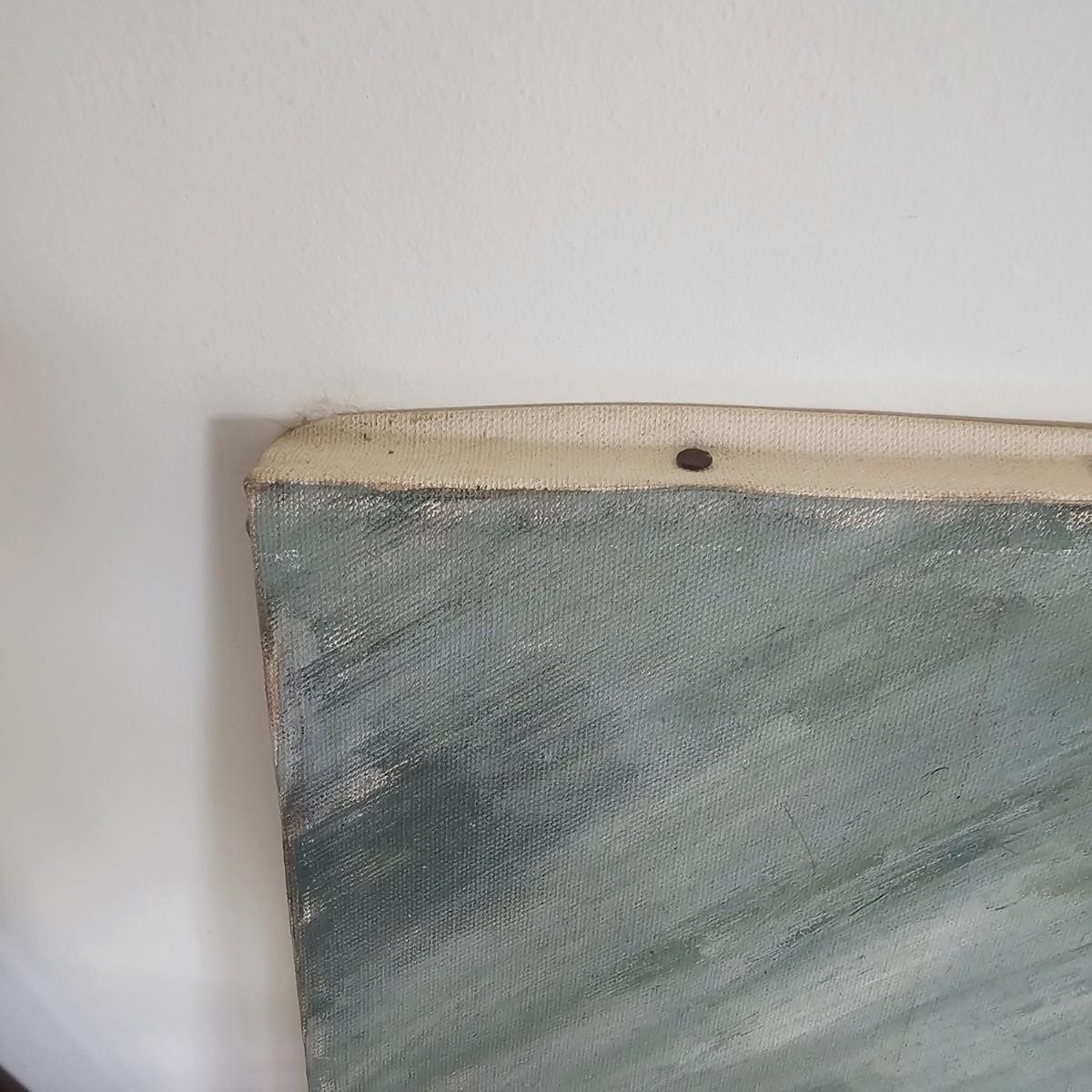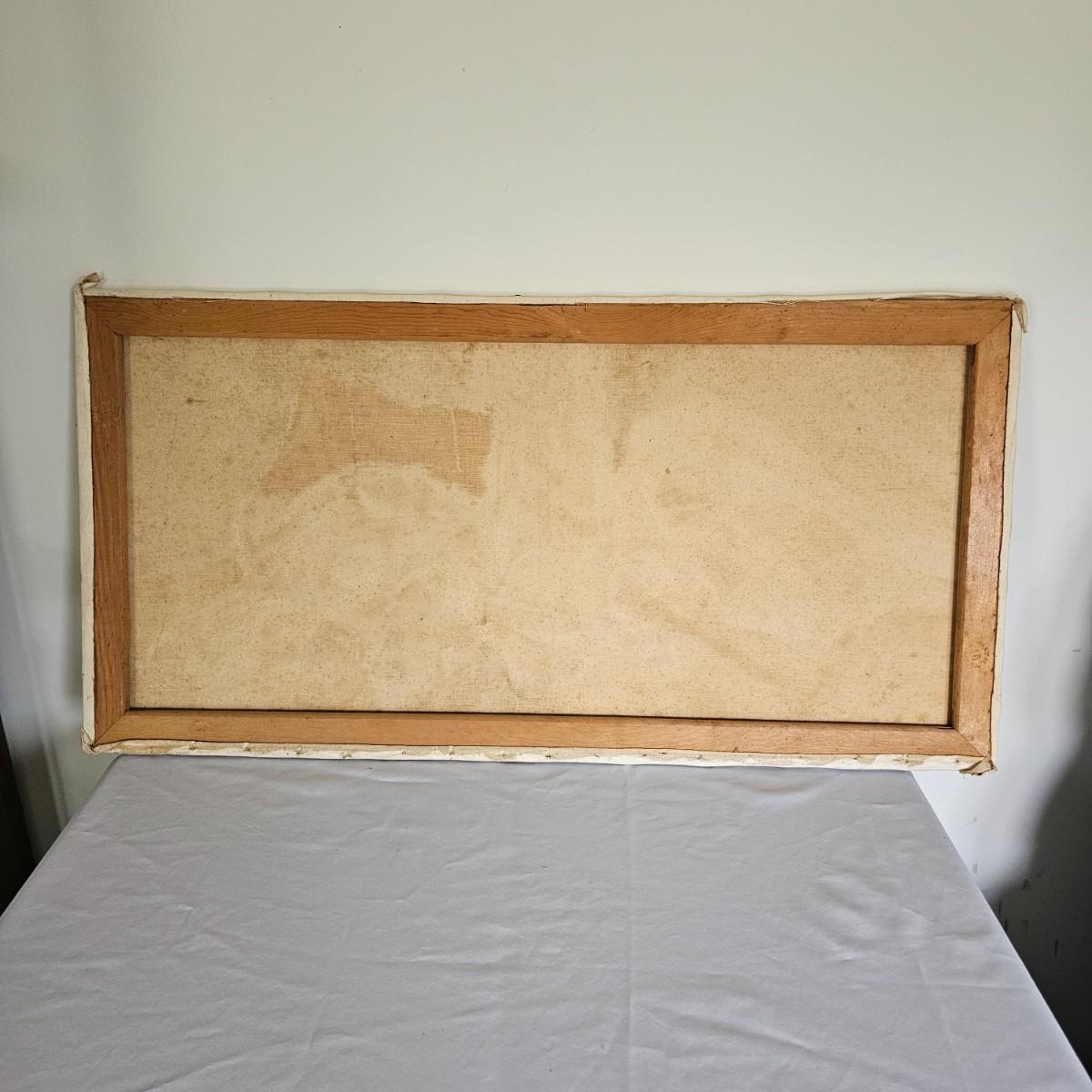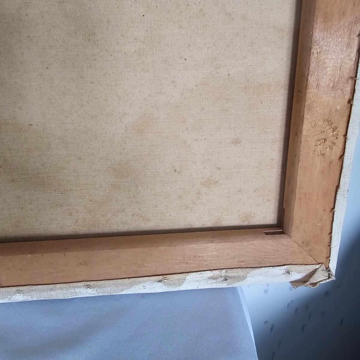 Unusual mixture of skulls, large bones and a solitary wine bottle in this open framed oil on canvas. Angular background adds to the mystery of the concept of the image. Signed by artist Joyce Blunk, this item measures 36" x 18"H. Some discoloring and stains on back of canvas, and nails securing to frame have some rust. See photos for details. Shipping available. Shipping can be costly. We suggest contacting our preferred local shipping provider, Postage Express, with dimensions and getting an estimate before bidding: (828) 255-9250 or shipping@postageexpressnc.com.