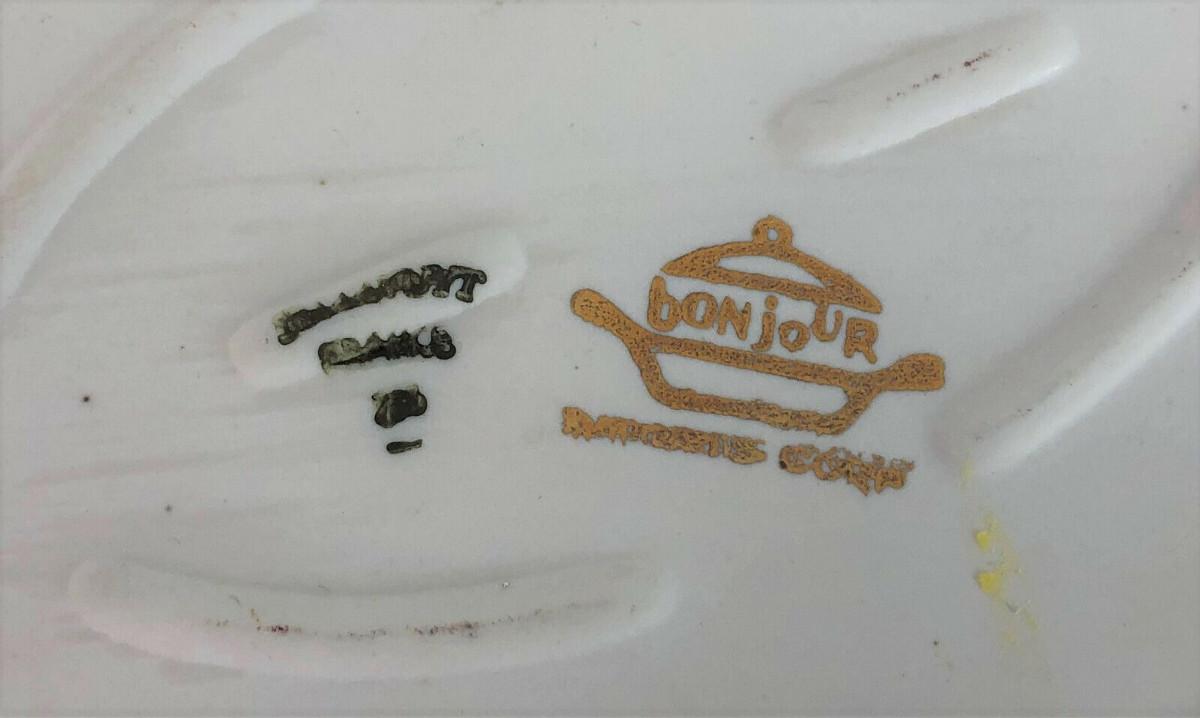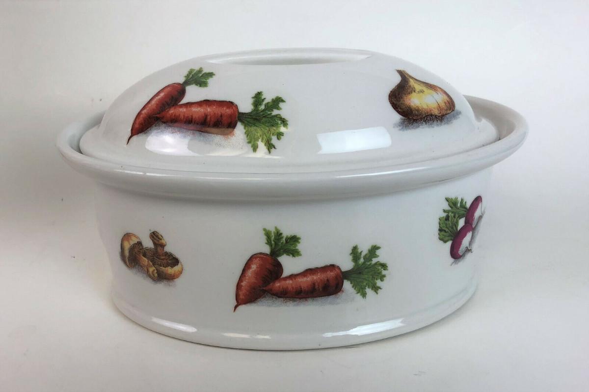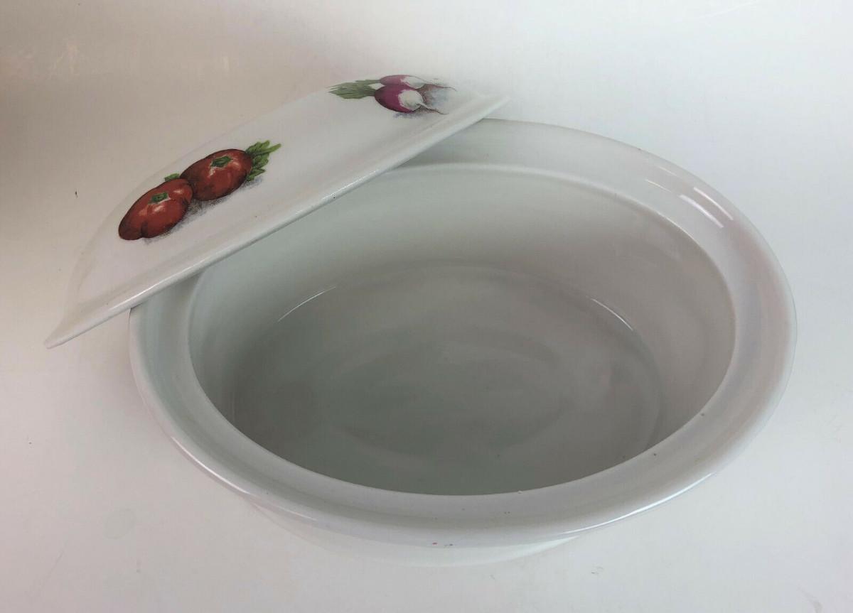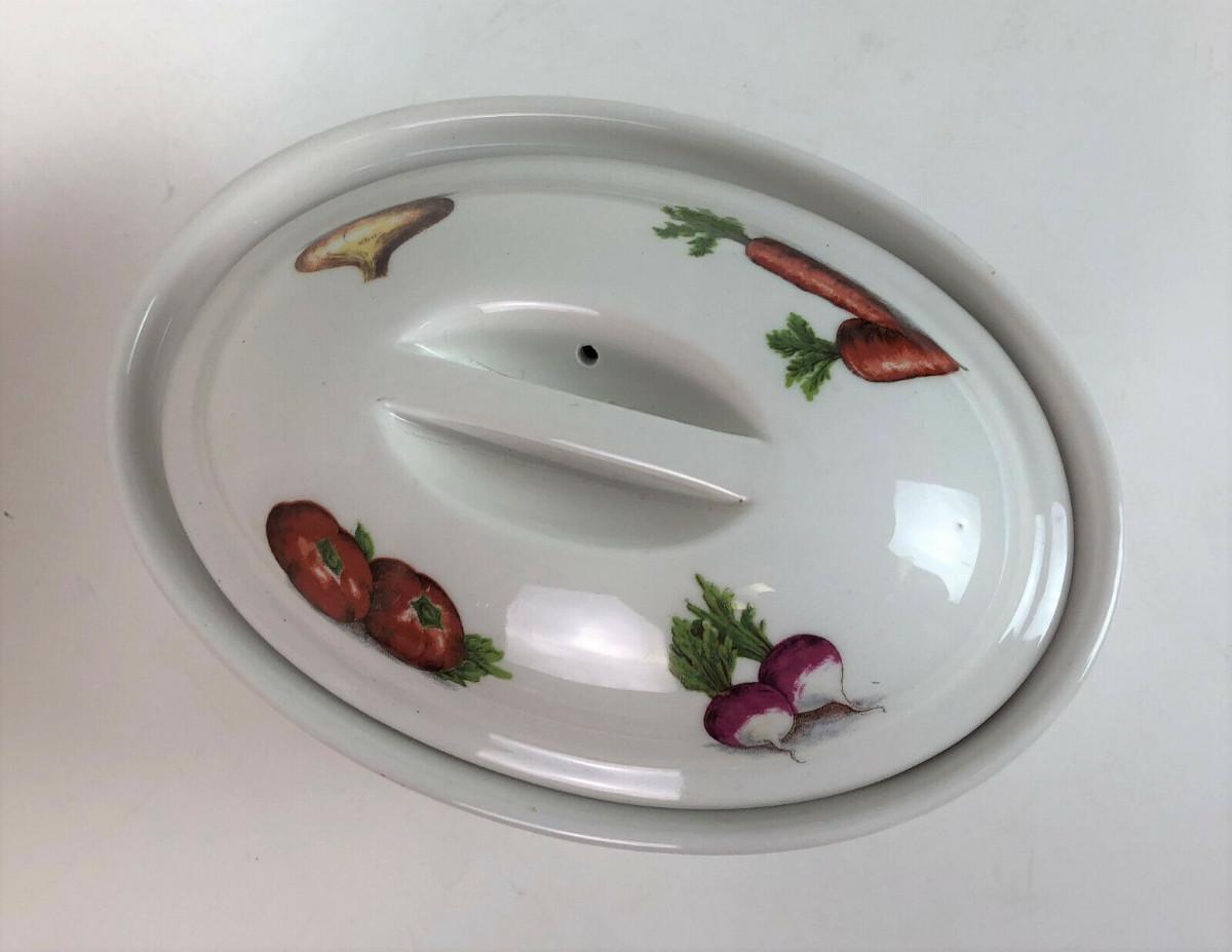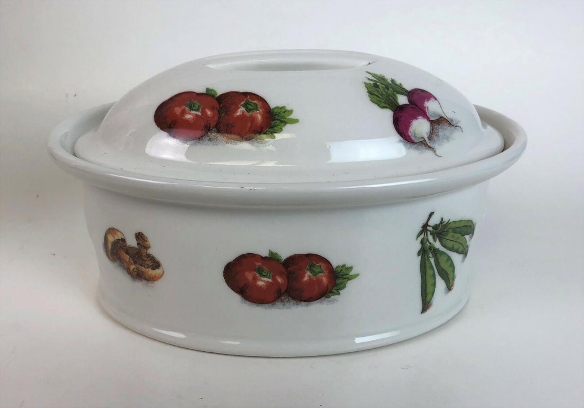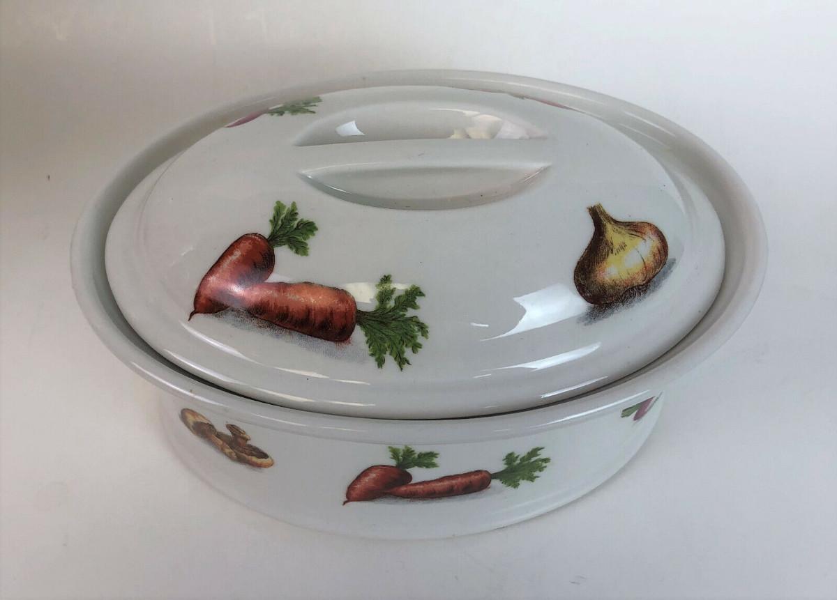 Virtually new condition on this vintage porcelain covered casserole made in France..Vegetable transfers show no use wear...Clean...Bonjour marking...#8...Just 7.5"l x 5"w x 3"h...Offered with no reserve...