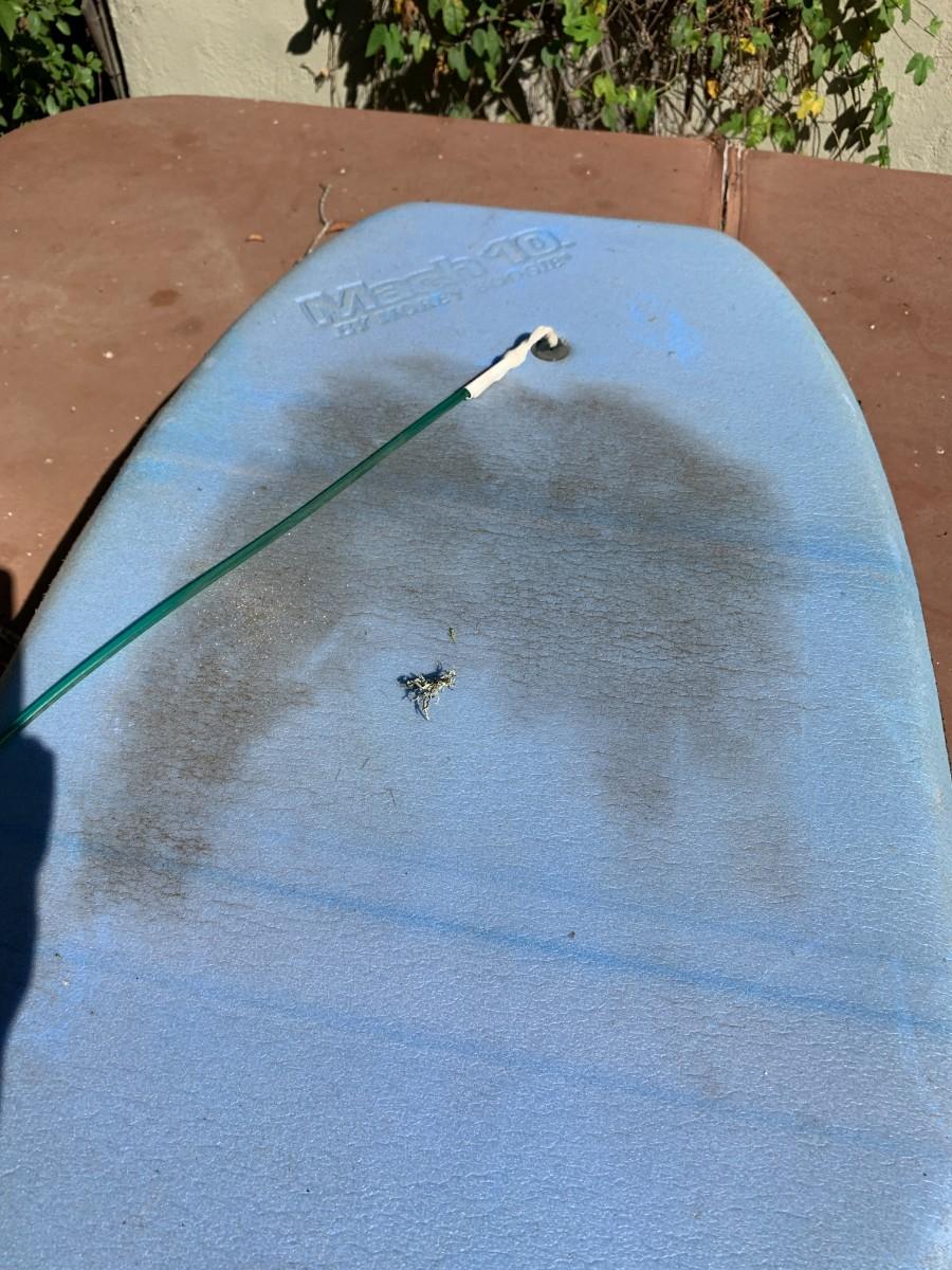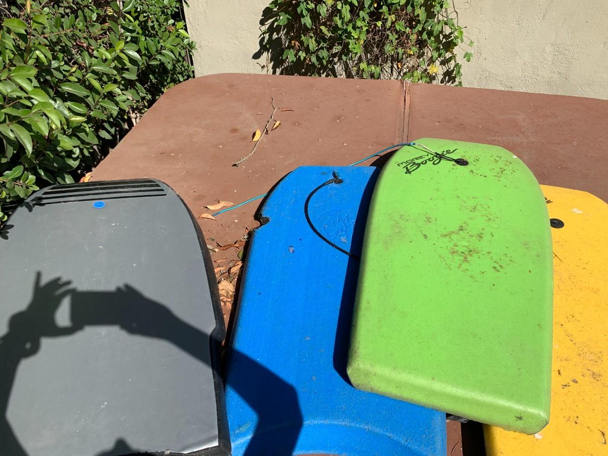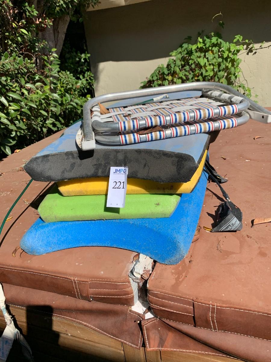 4 boogie boards, used. Blue board has damage, shown. Aluminum beach chair, may need cleaning