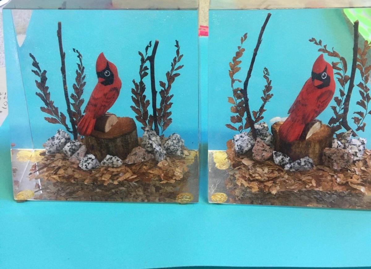 Lucite incased rare vintage unique Canadian hand carved and hand painted cardinal bookends.