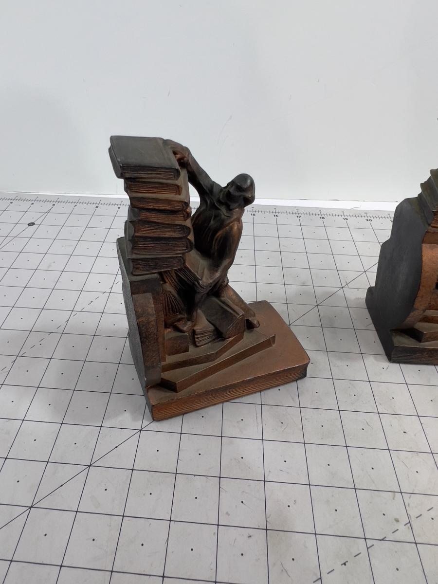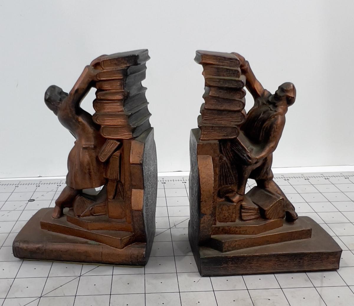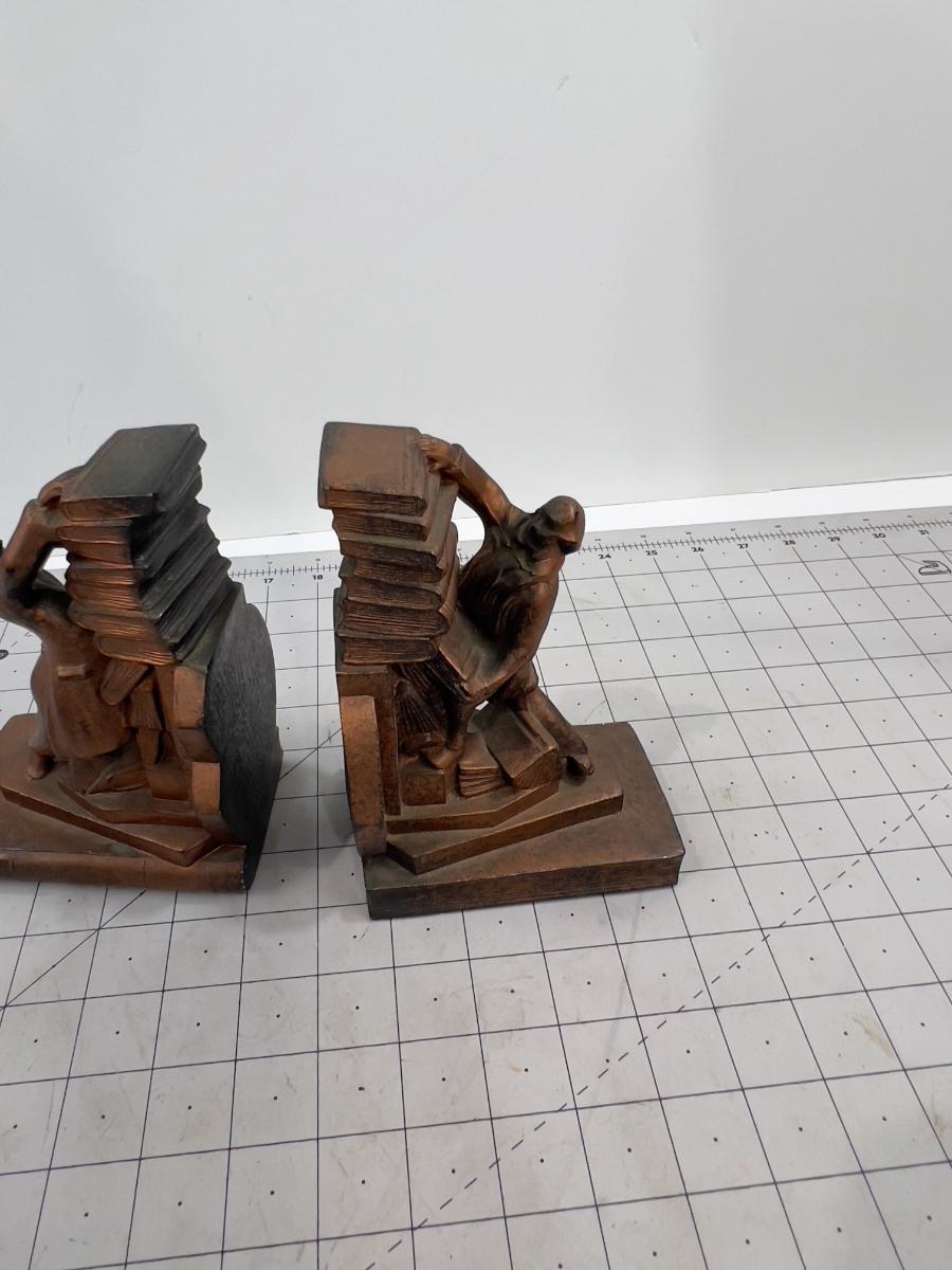 Book Ends Set. Bronze Color, 1940's Era Colonial Man Stacking Books