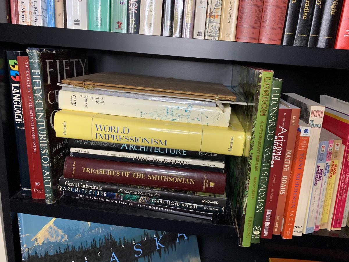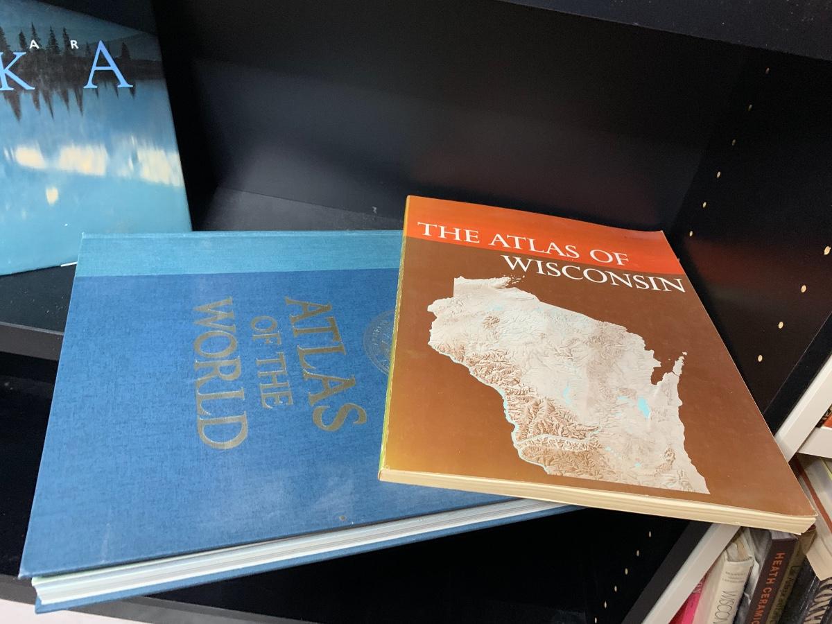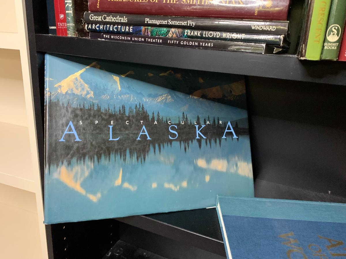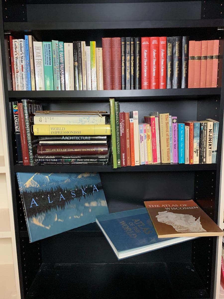 Two full shelves of books with 3 large coffee table books. Large books include one about Alaska, a very big and heavy world atlas and a paperback about Wisconson. Other subjects include art and architecture, language, and novels.
