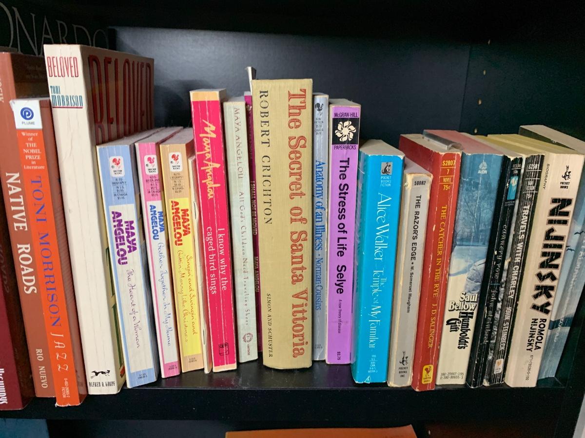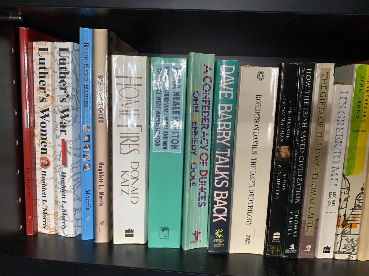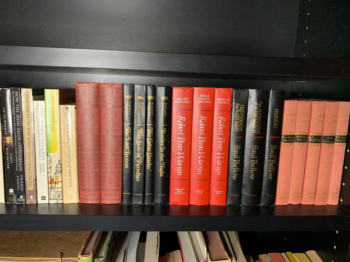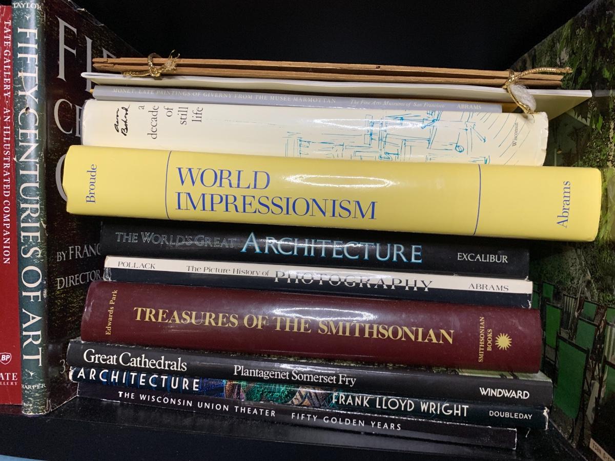 Two full shelves of books with 3 large coffee table books. Large books include one about Alaska, a very big and heavy world atlas and a paperback about Wisconson. Other subjects include art and architecture, language, and novels.