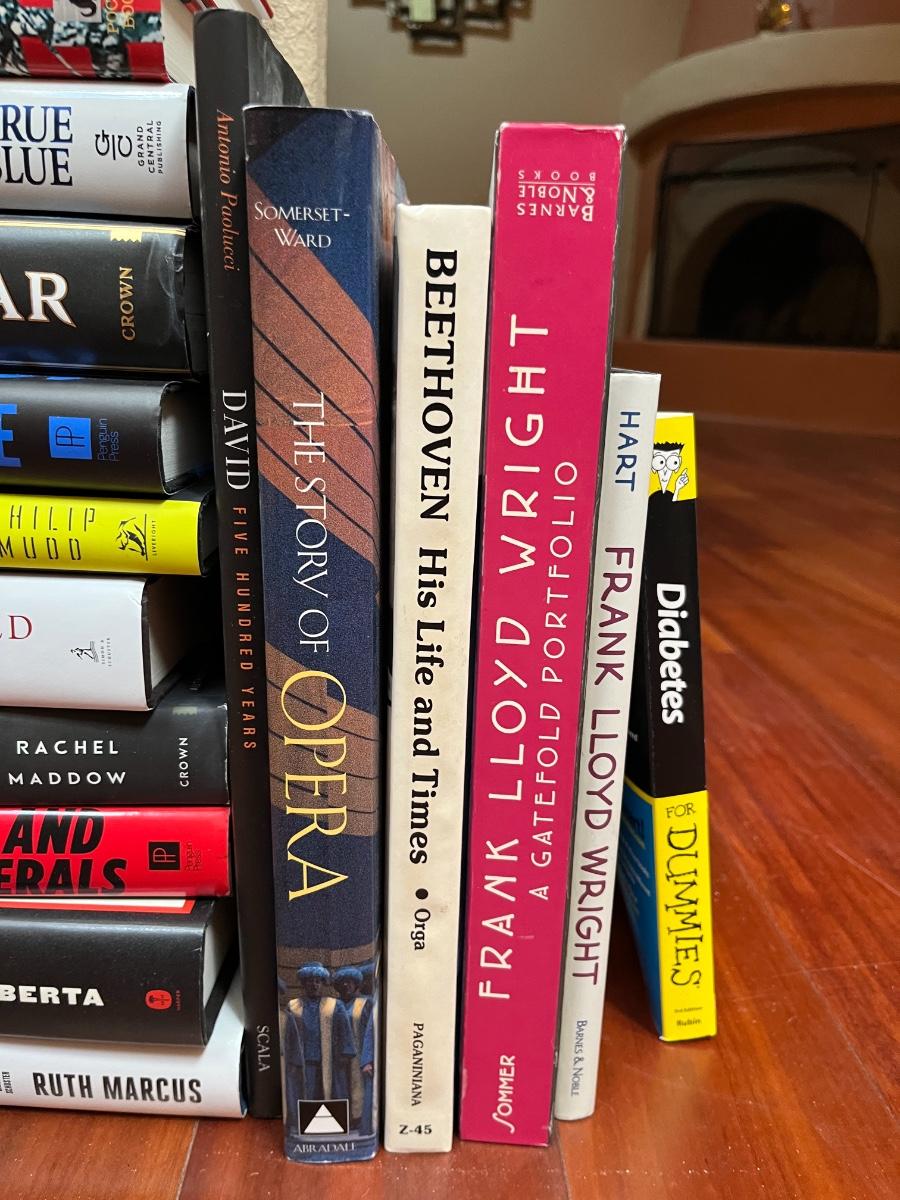 hardbacks: books on frank Lloyd wright, Beethoven his life and times, the story of the opera, five hundred years, diabetes for dummies
