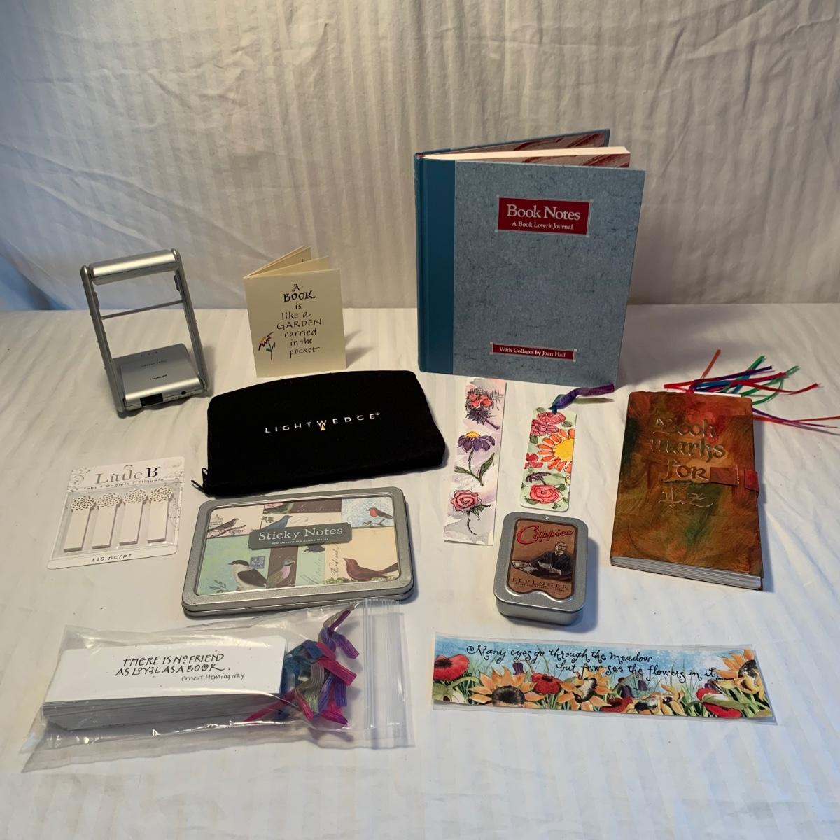 A fun collection of items for the book lover! Included in this lot are: a book lover’s journal, two reading lights, sticky notes, Levenger’s Clippies, Little B tabs, and a big collection of bookmarks. The Light Wedge requires four AAA batteries and was not tested. The Phorm Light Voyager requires four AA batteries and turned on when tested.
