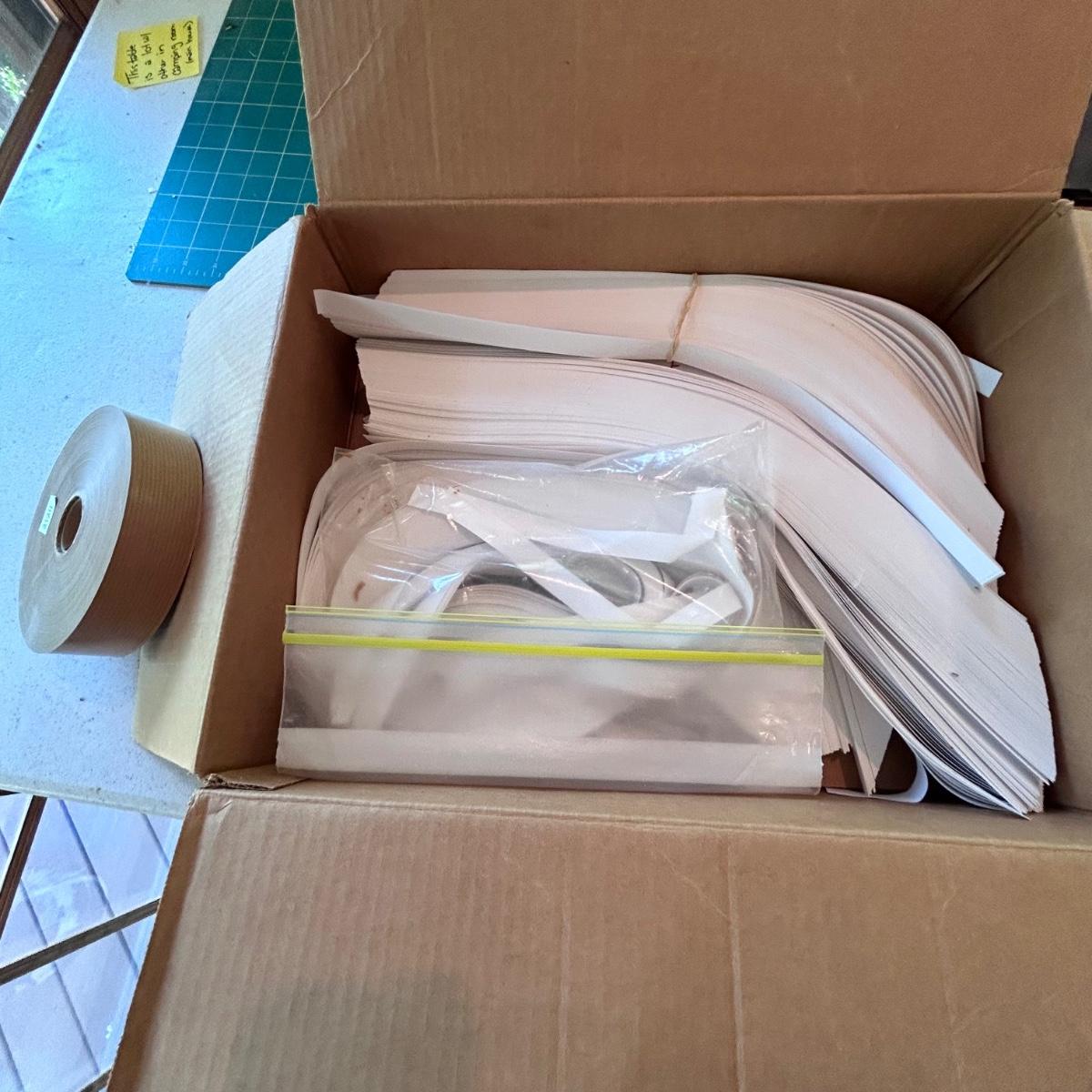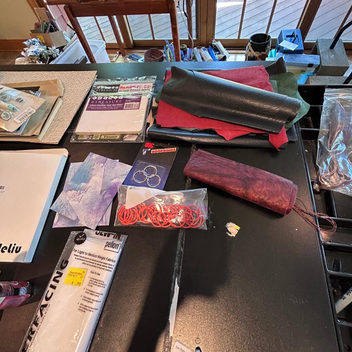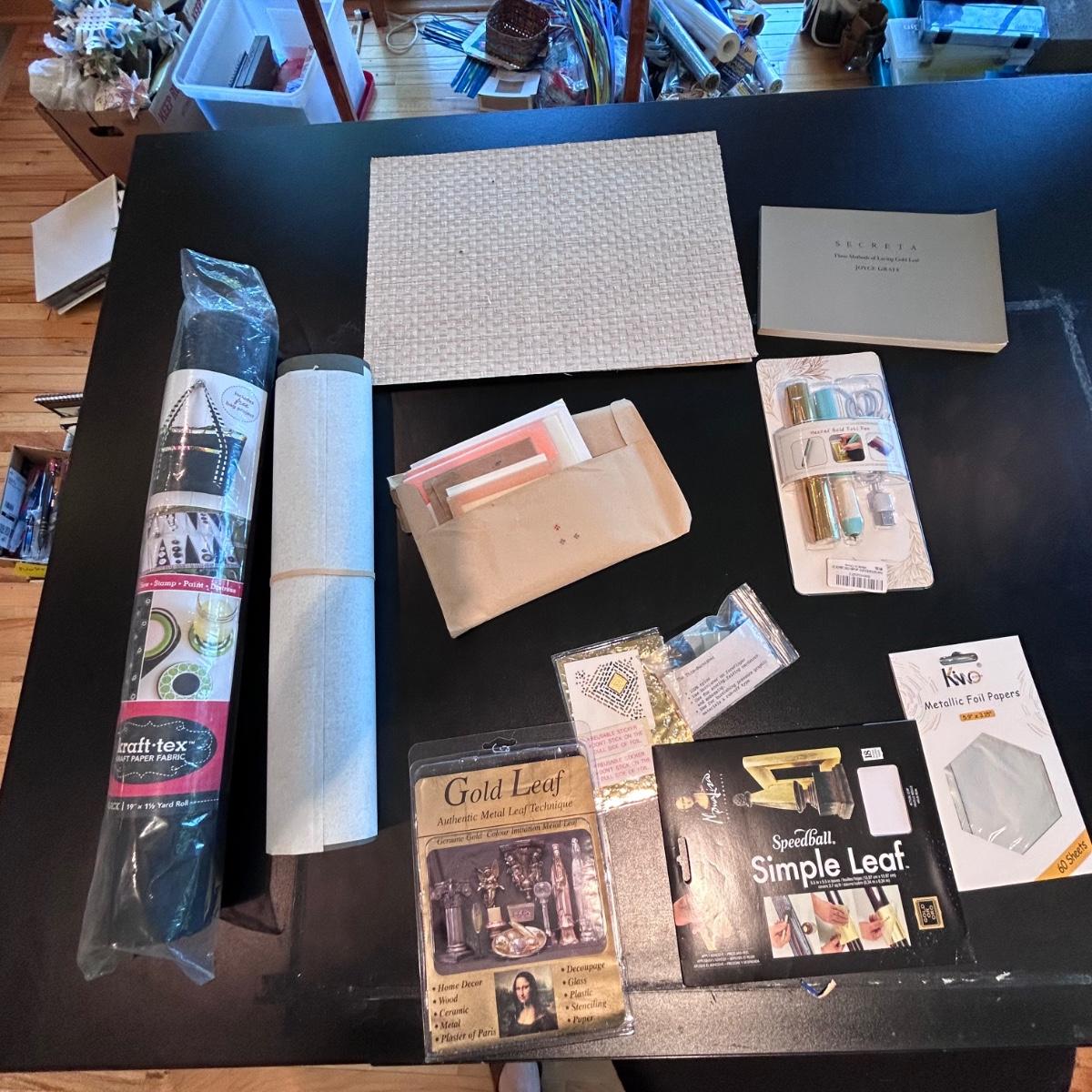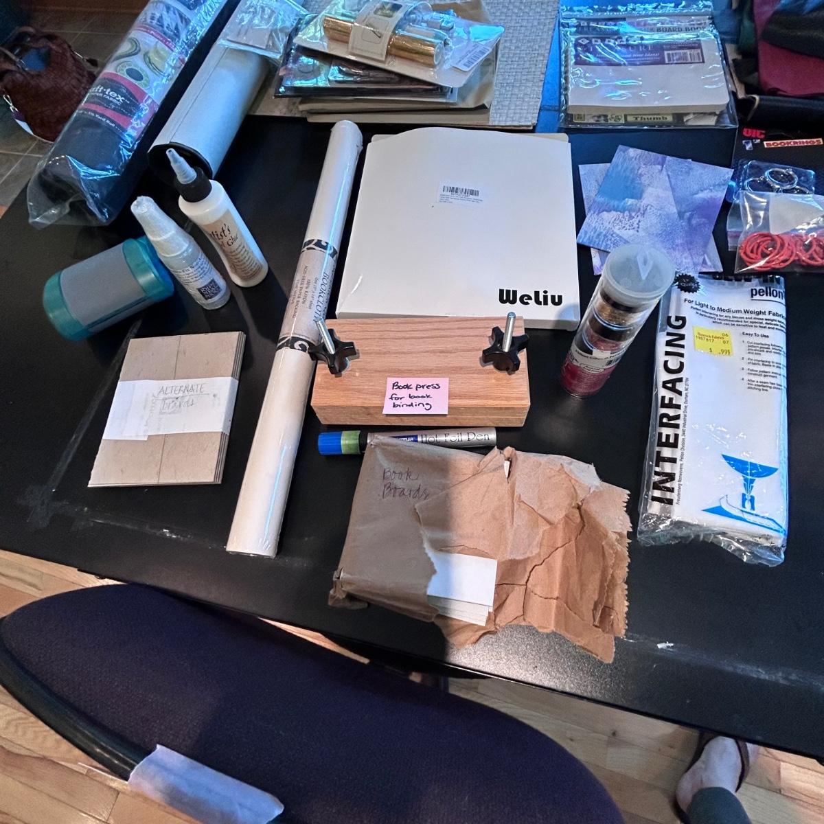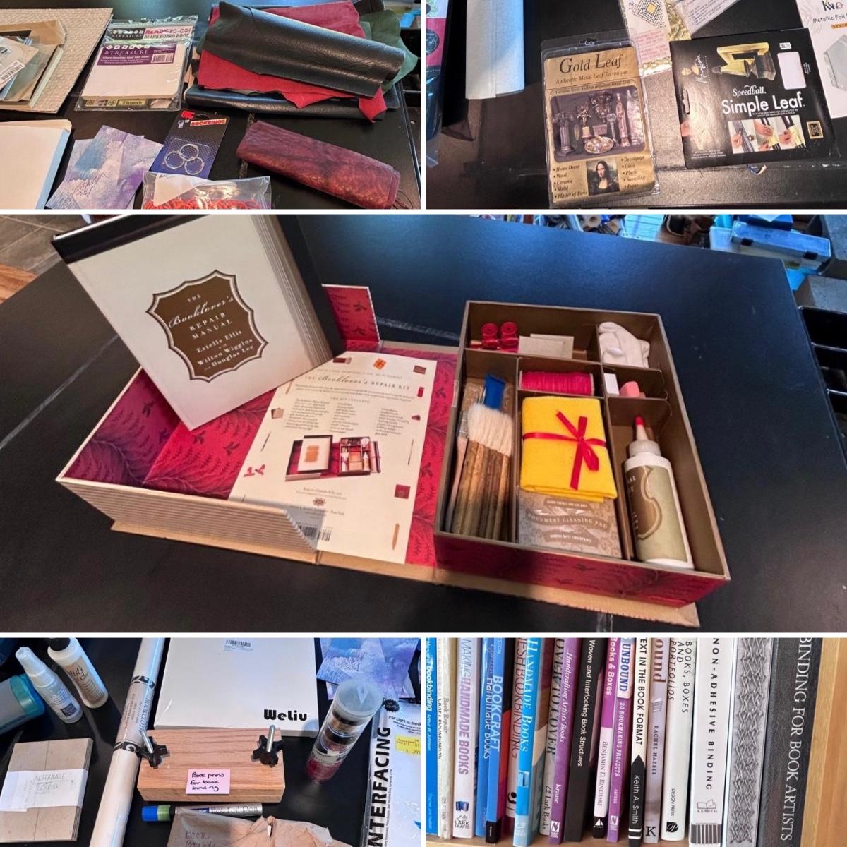 Lot contains fun books on book making, a 'The Booklover's Repair Kit' that appears to not have been used at all, gold and metallic leafing tools, small book press, book boards, rings, double sided tape, leather and so much more. See pictures. We cannot verify liquids in containers.