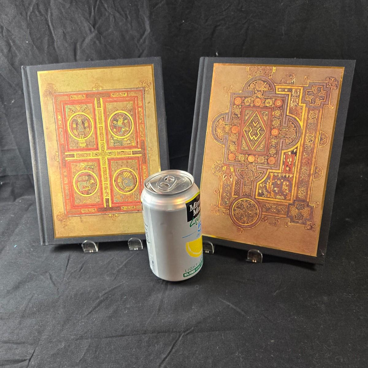 This lot is for a Book of Kells Journals. This is a set of Journals with the covers depicting a page from the Book of Kells. One journal has lined pages the other has blank pages. They are both unused. They are about 9.25-inches tall x 7-inches wide.