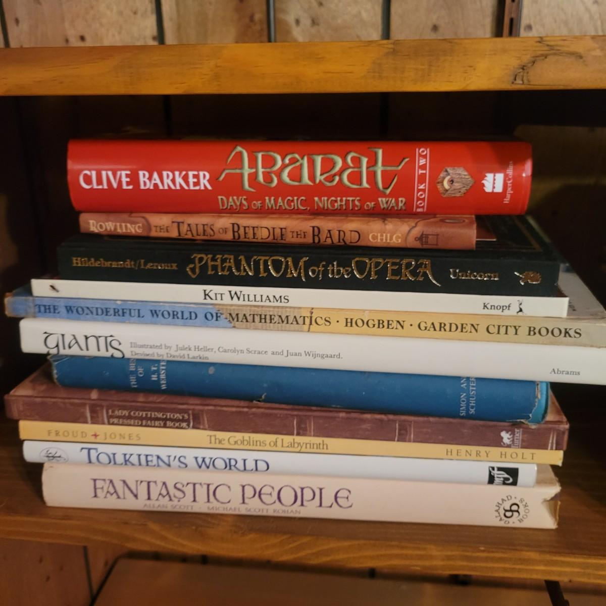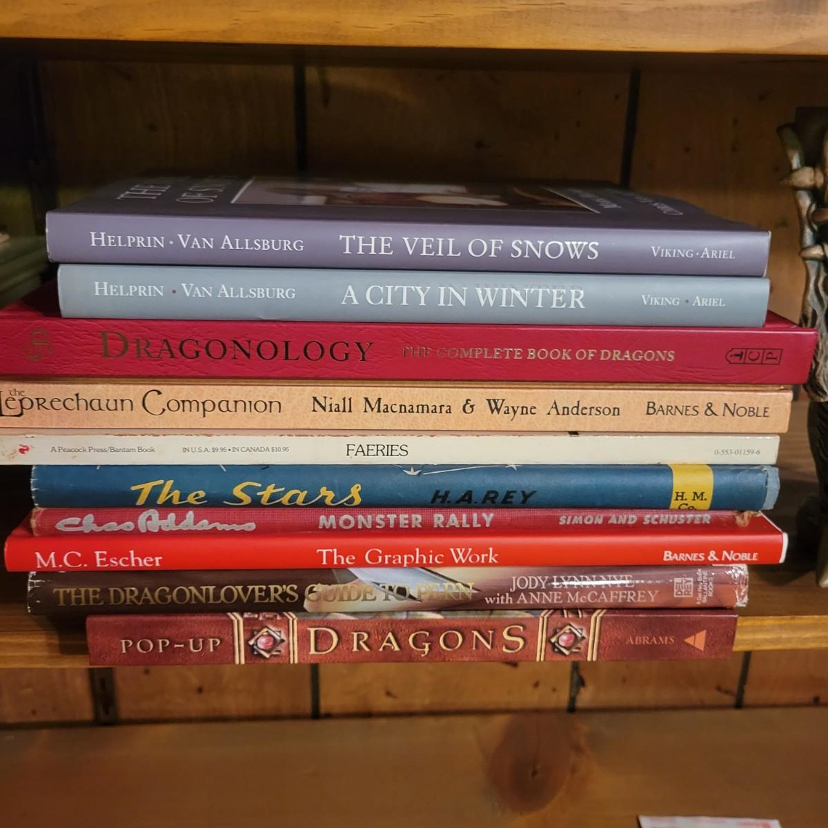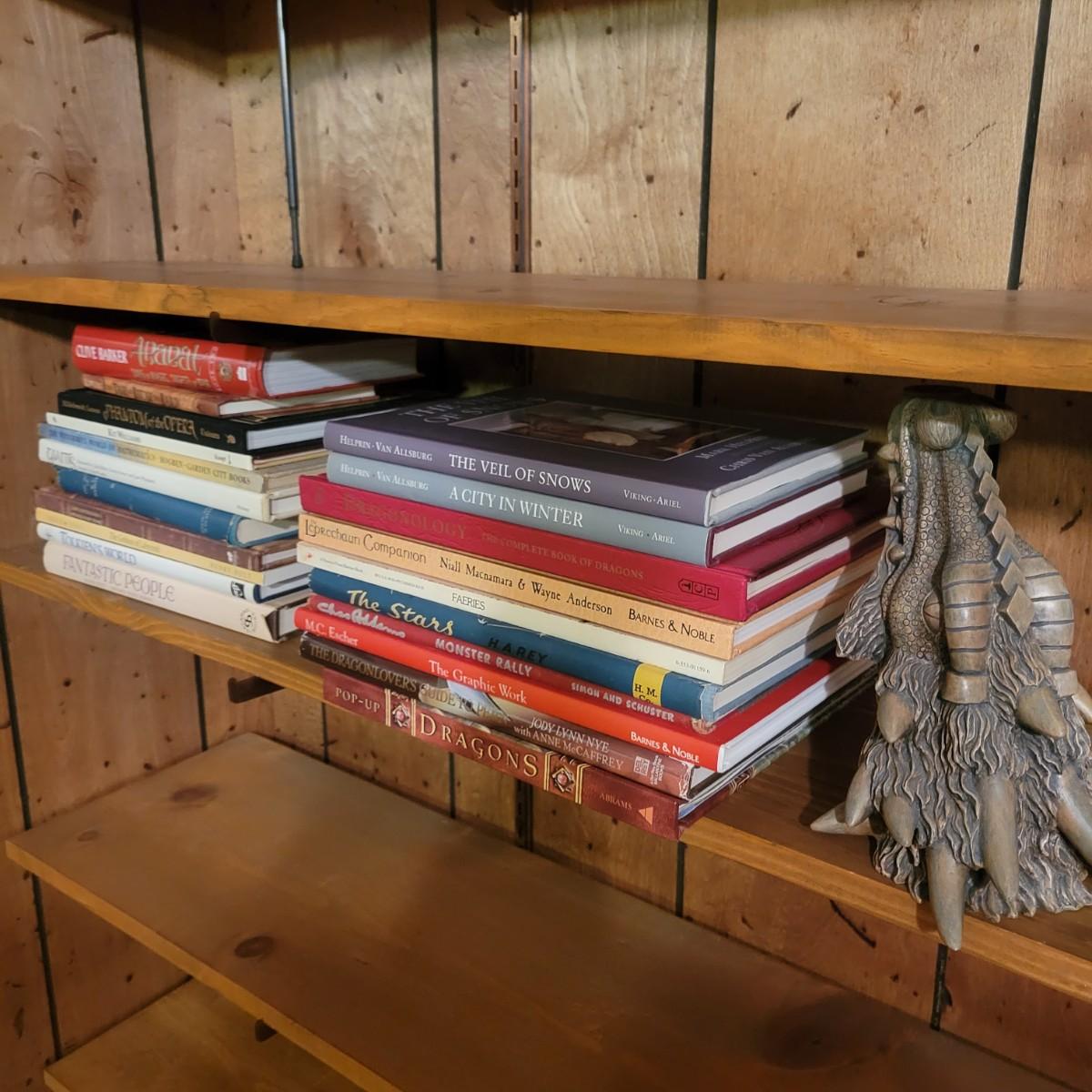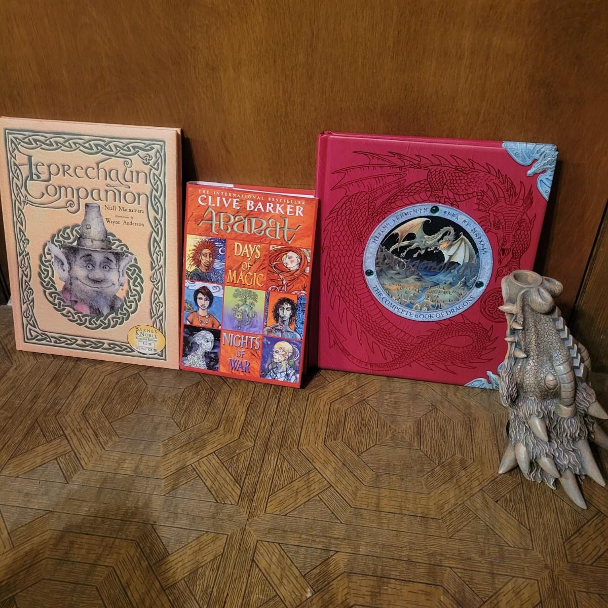 An assortment of books on dragons, fairies, goblins and more. This lot also includes a resin cast dragons head incense burner that measures approximately 6" x 6" x 8.5"H. This lot includes over 20 books. Local pickup only
