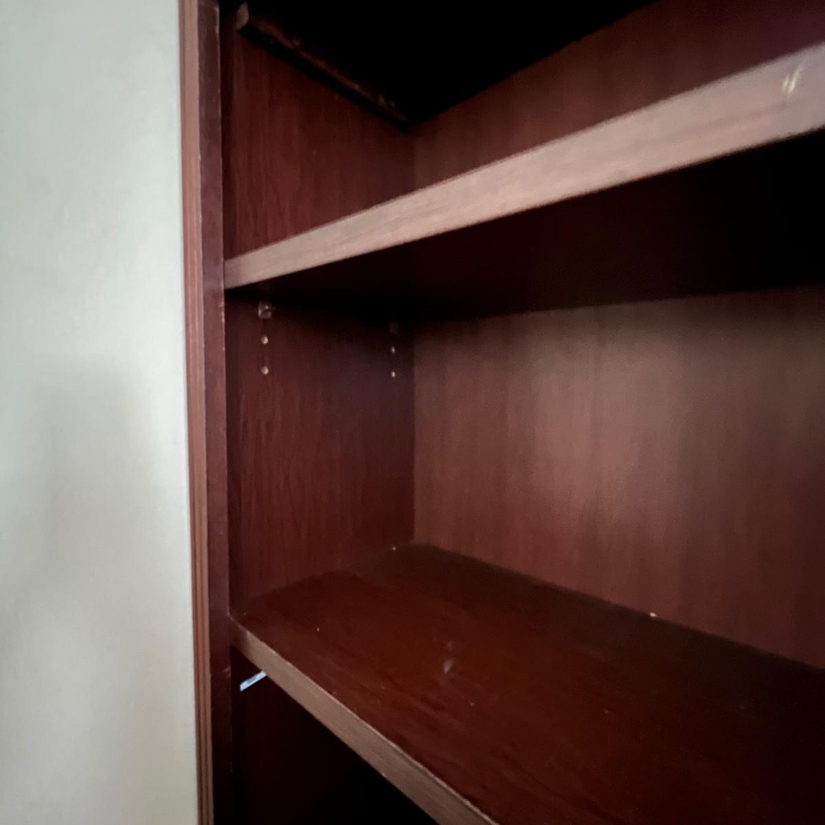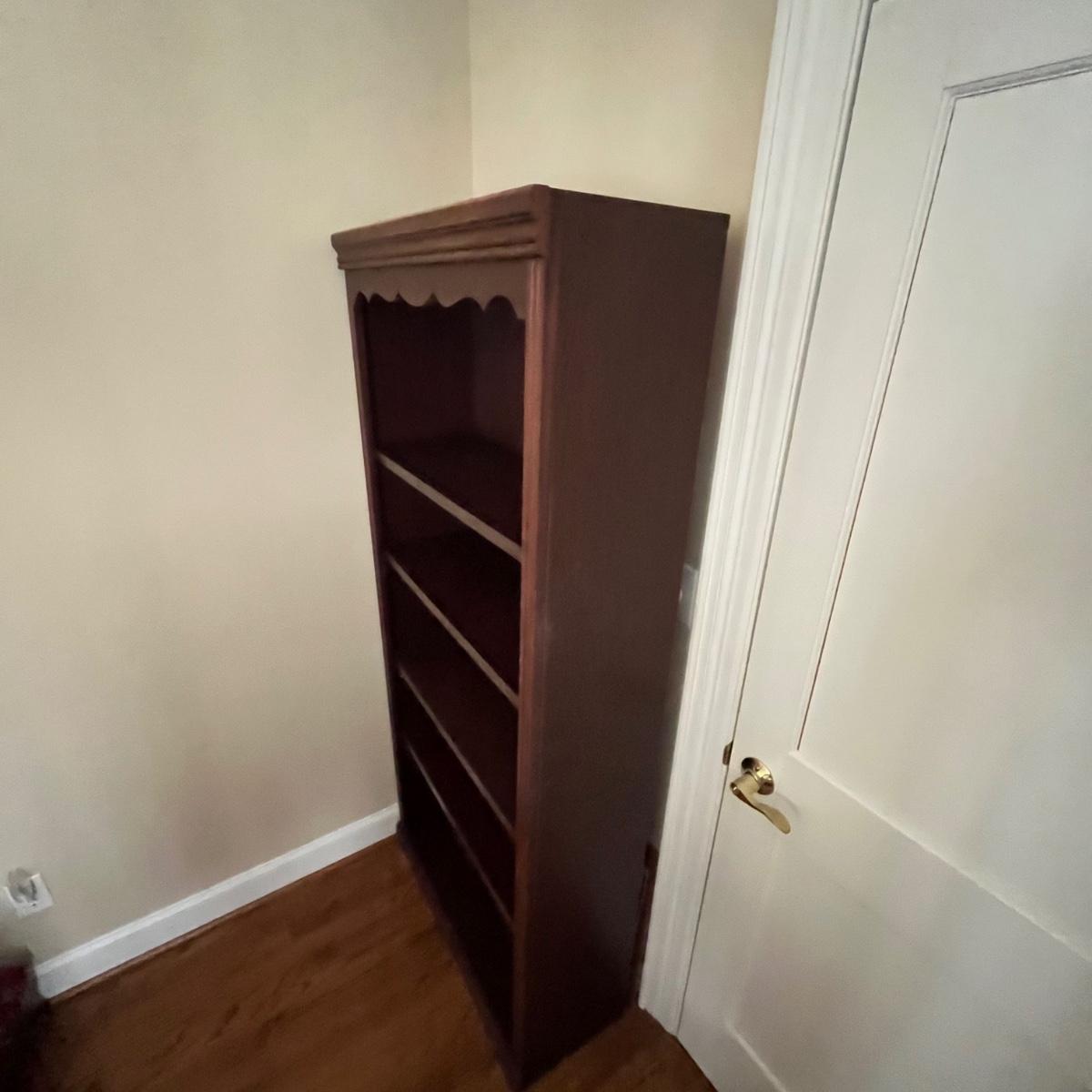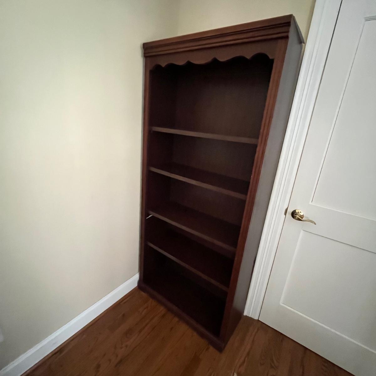 Lot includes a bookcase with five shelves, with three being adjustable. Bookcase is made of press wood and measures 12” x 32” x 72”. Bring help item is substantial and up one flight of stairs.