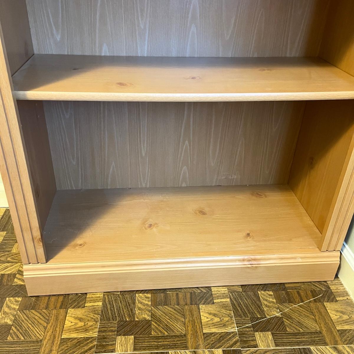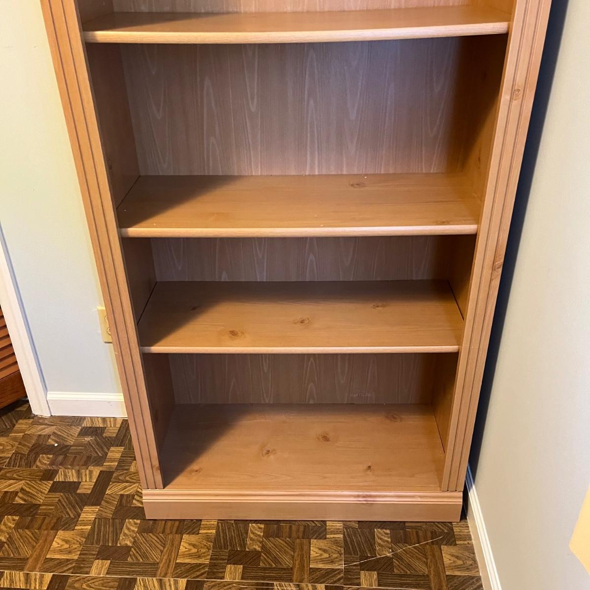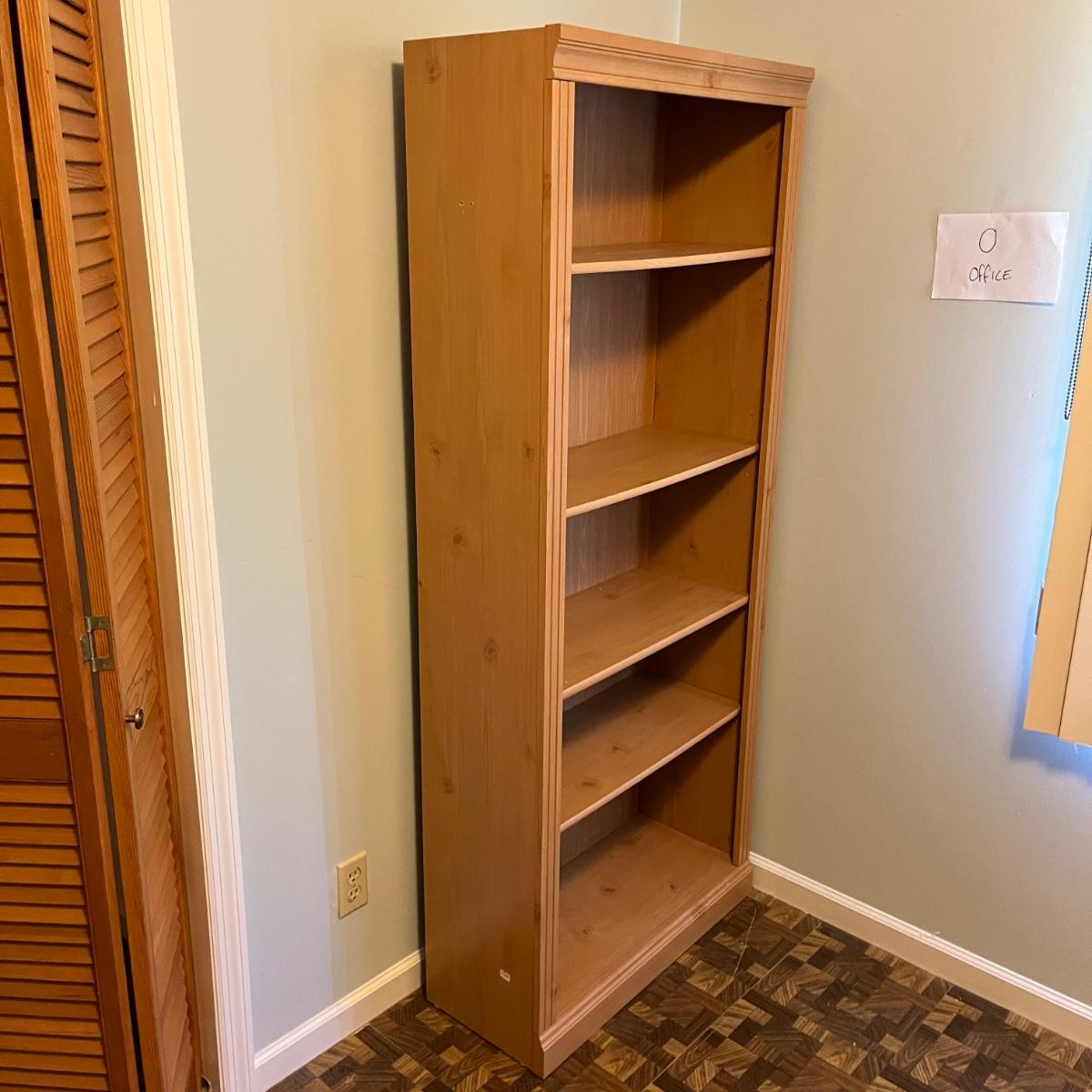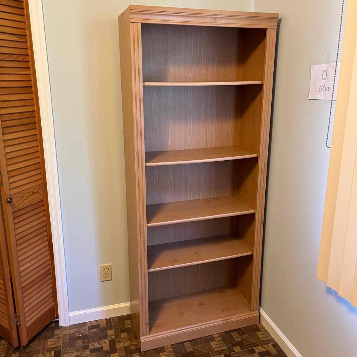Lot includes a pressed wood bookcase with five shelves with three being adjustable. Side has two small holes, see pictures. Bookcase measures 30” x 12.75” x 72”. Item is up one flight of stairs.