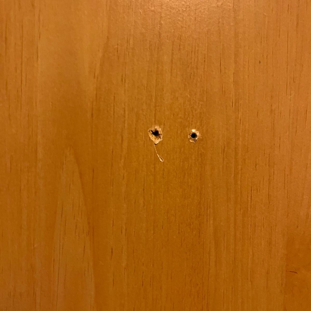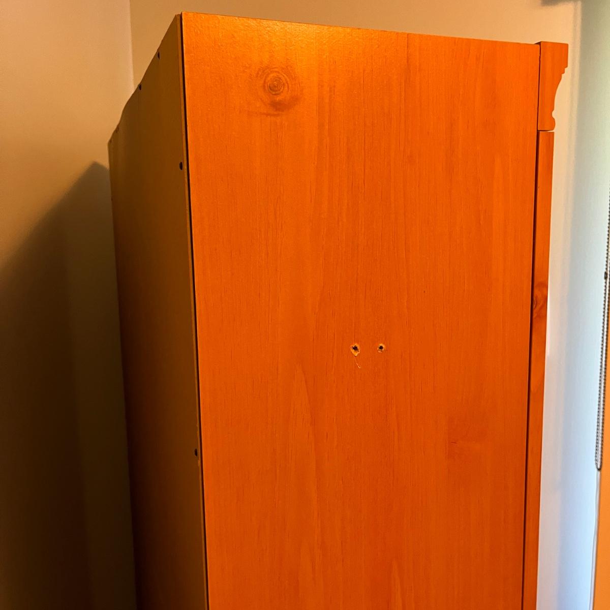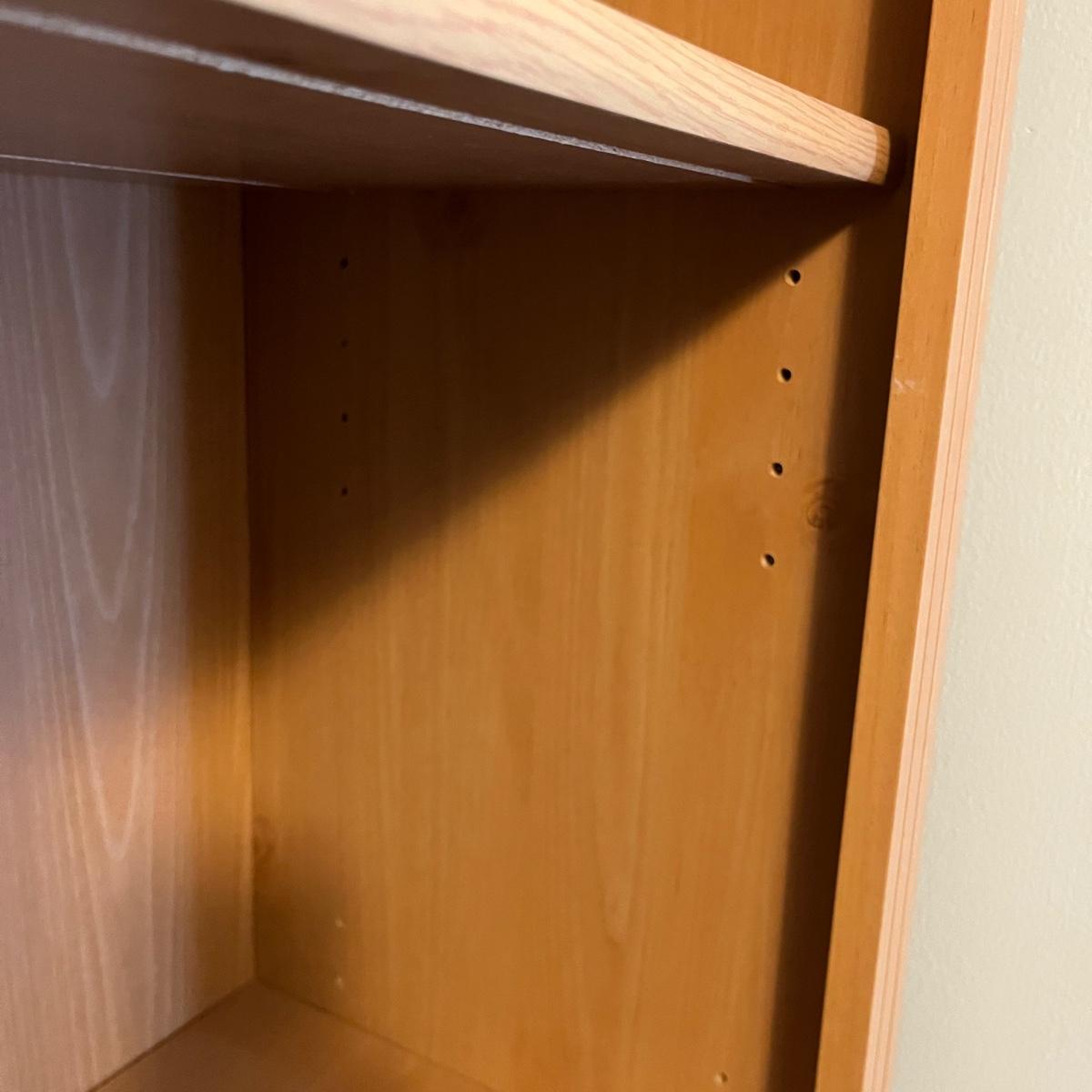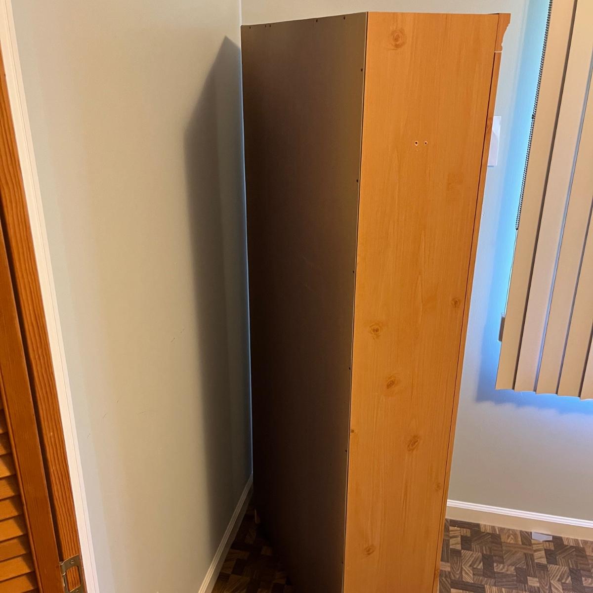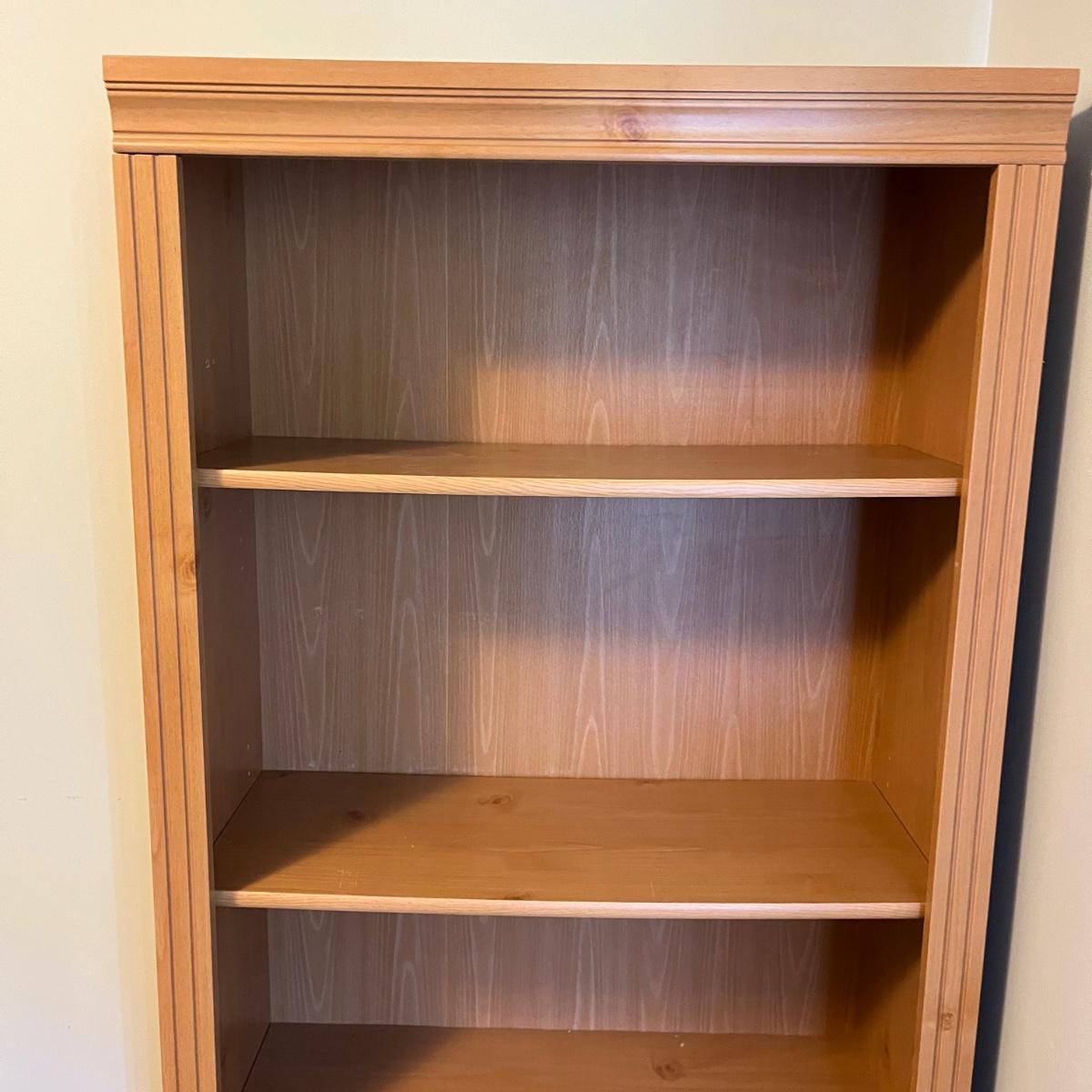 Lot includes a pressed wood bookcase with five shelves with three being adjustable. Side has two small holes, see pictures. Bookcase measures 30” x 12.75” x 72”. Item is up one flight of stairs.