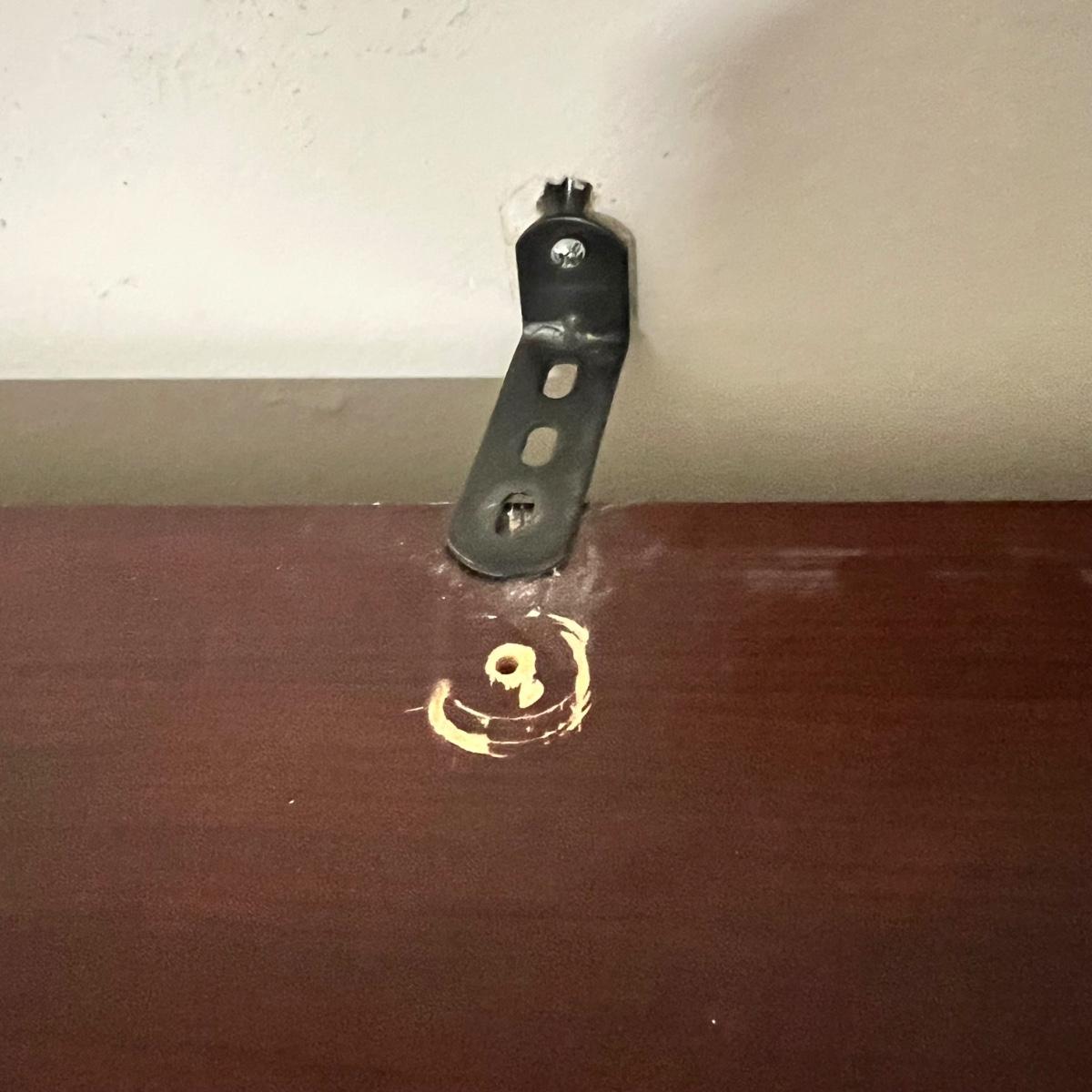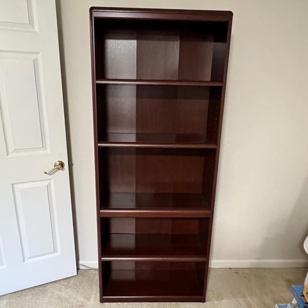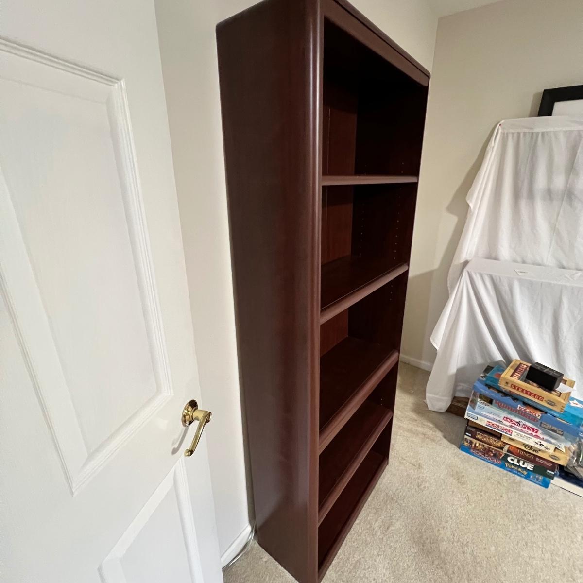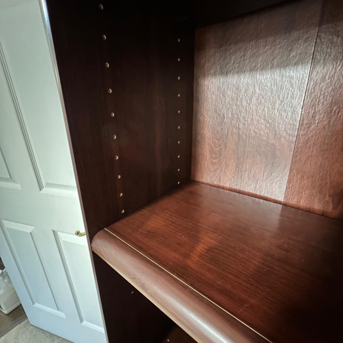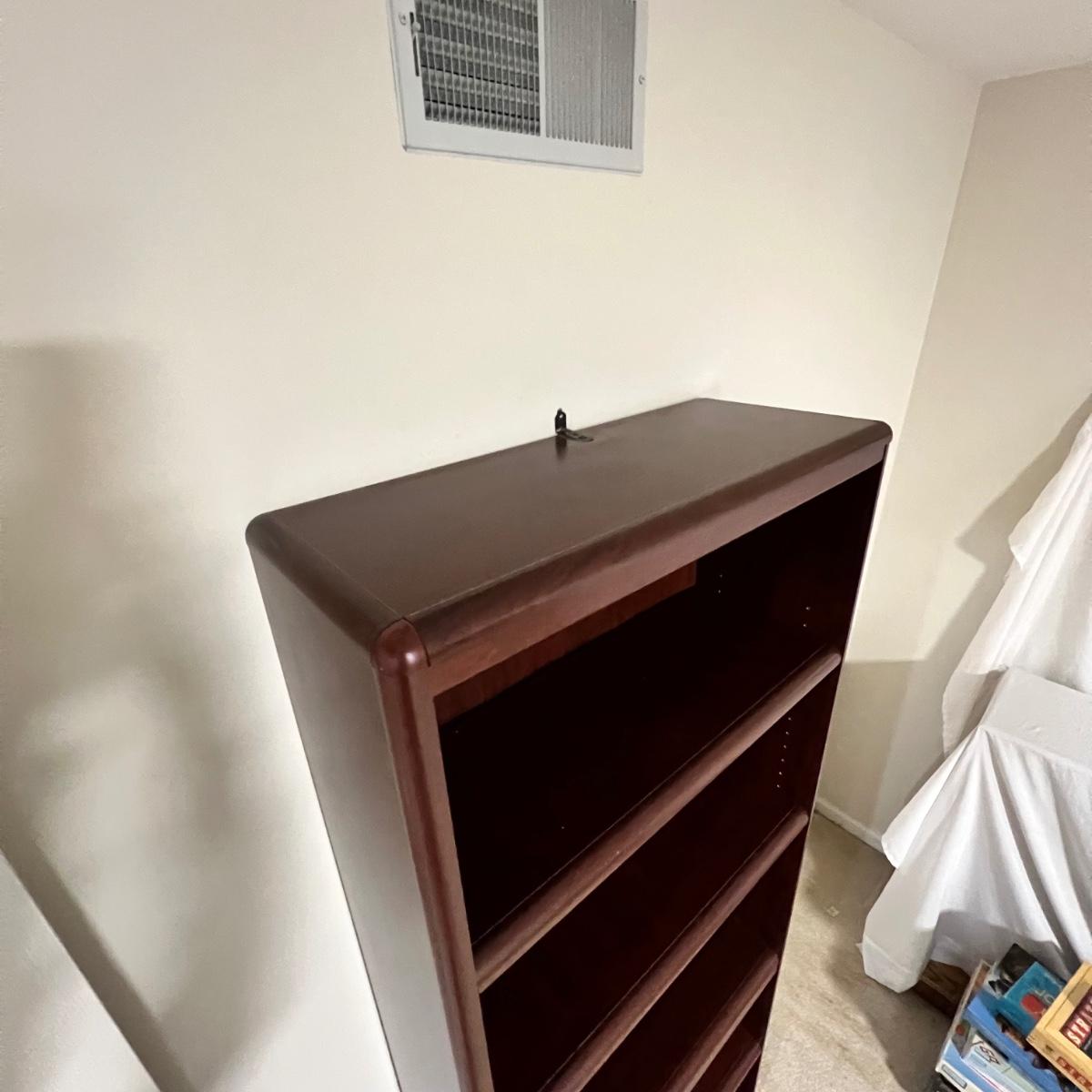 This bookcase has four adjustable shelves. It appears to be made from manufactured wood with a thin particle type board for the back. It was attached to the wall with a stabilizing bracket, this has left a small hole in the top, bracket is not included.
