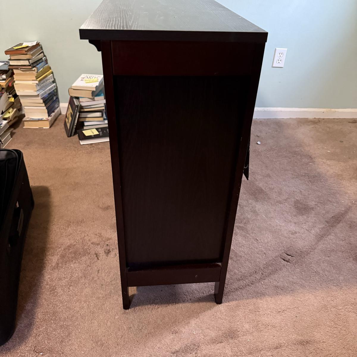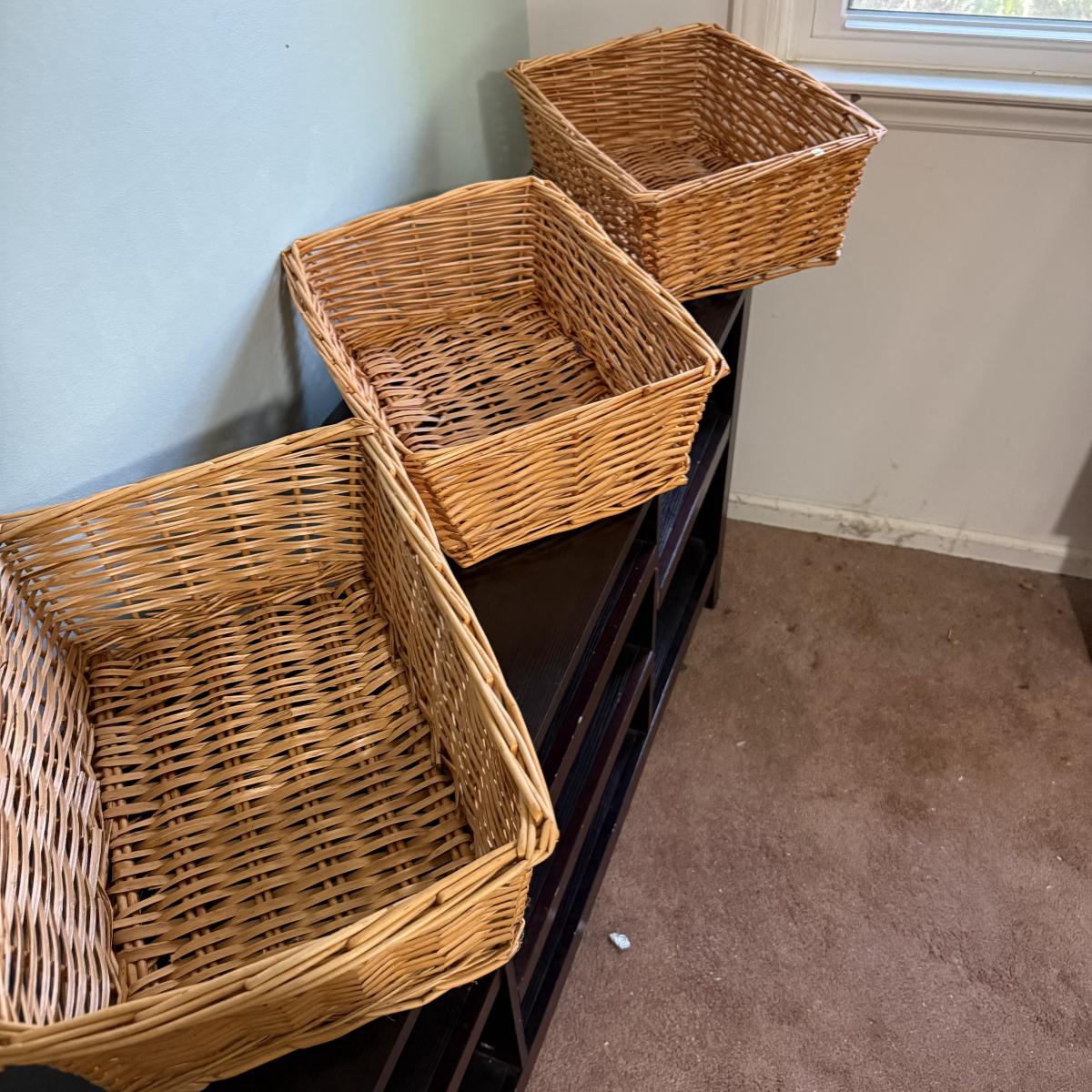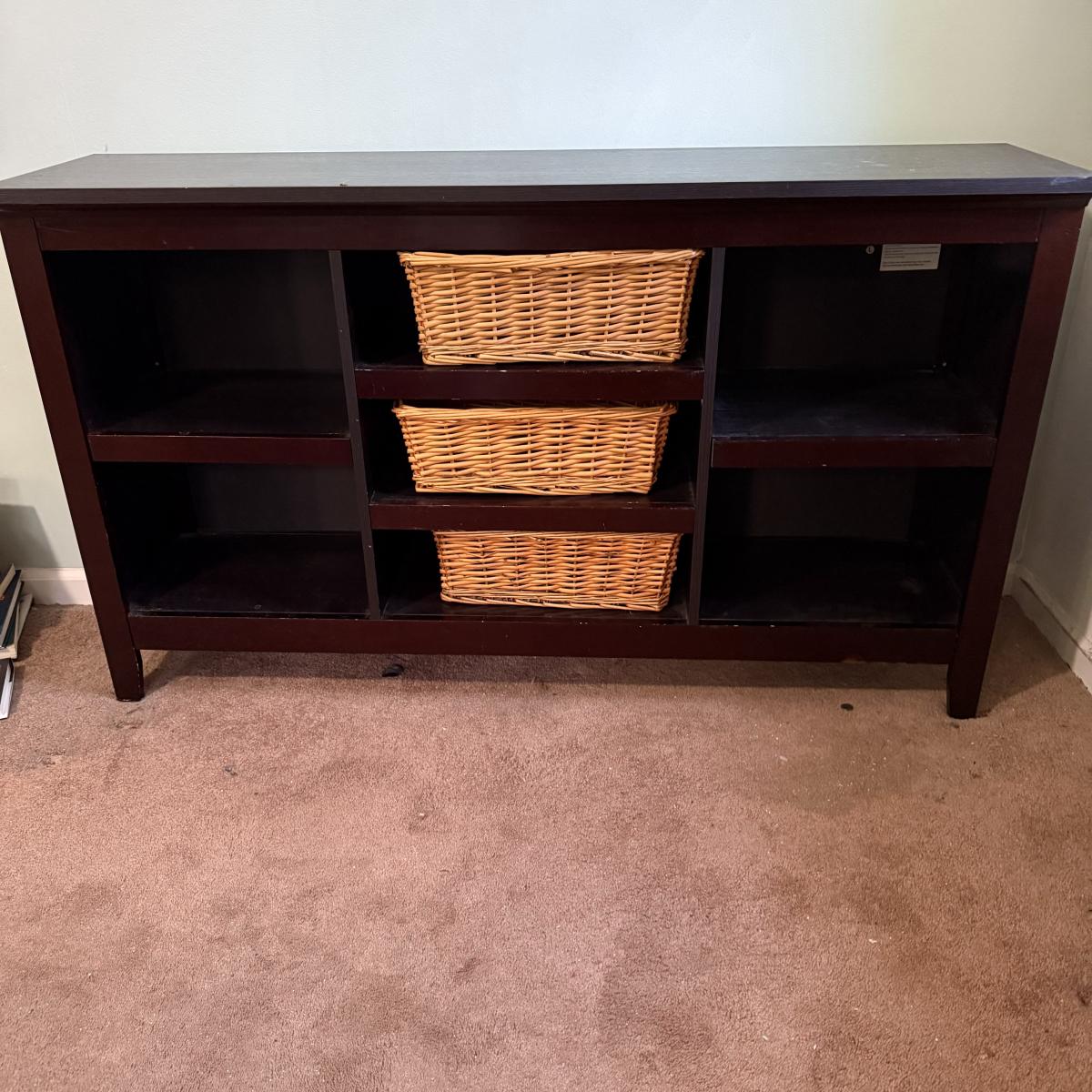 A great sofa table or just a bookcase in the den, This black wood piece measures 54” X 13.5” X 32”H. Each basket measures 16” X 12” X 6”H.