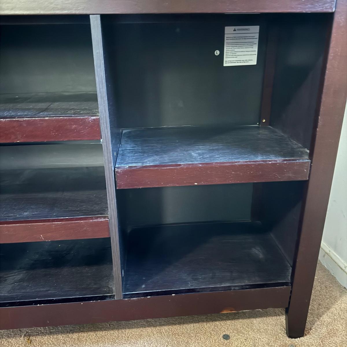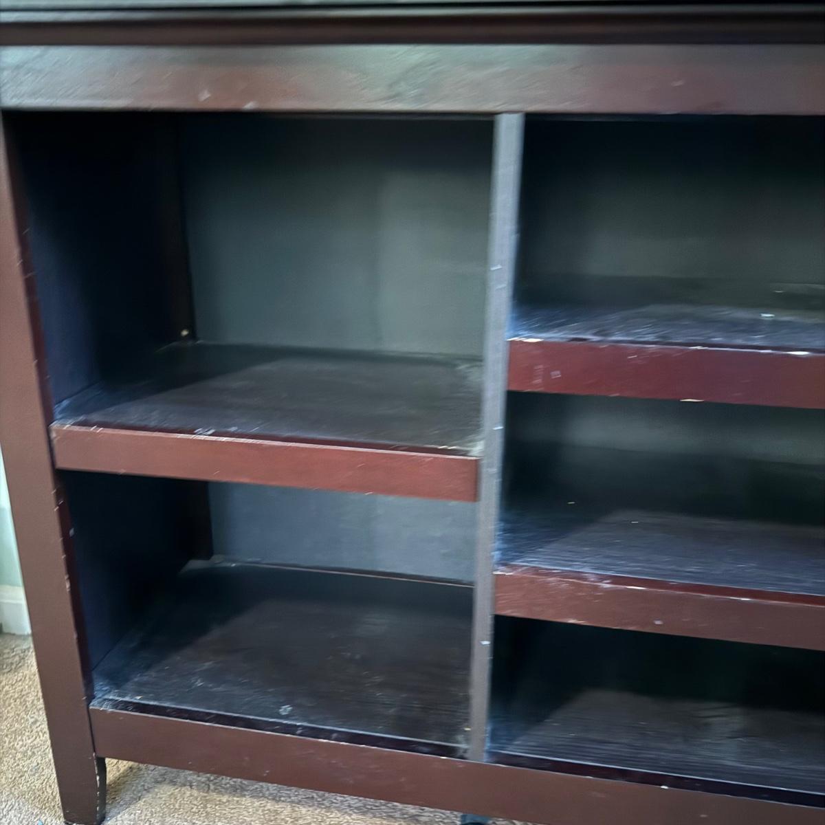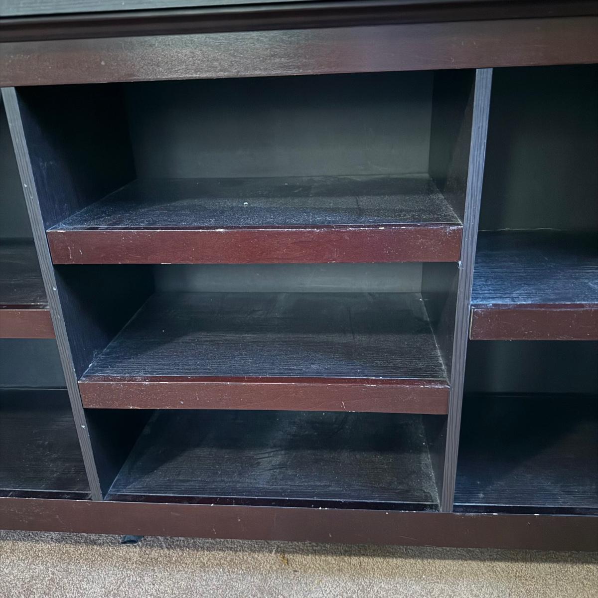 A great sofa table or just a bookcase in the den, This black wood piece measures 54” X 13.5” X 32”H. Each basket measures 16” X 12” X 6”H.