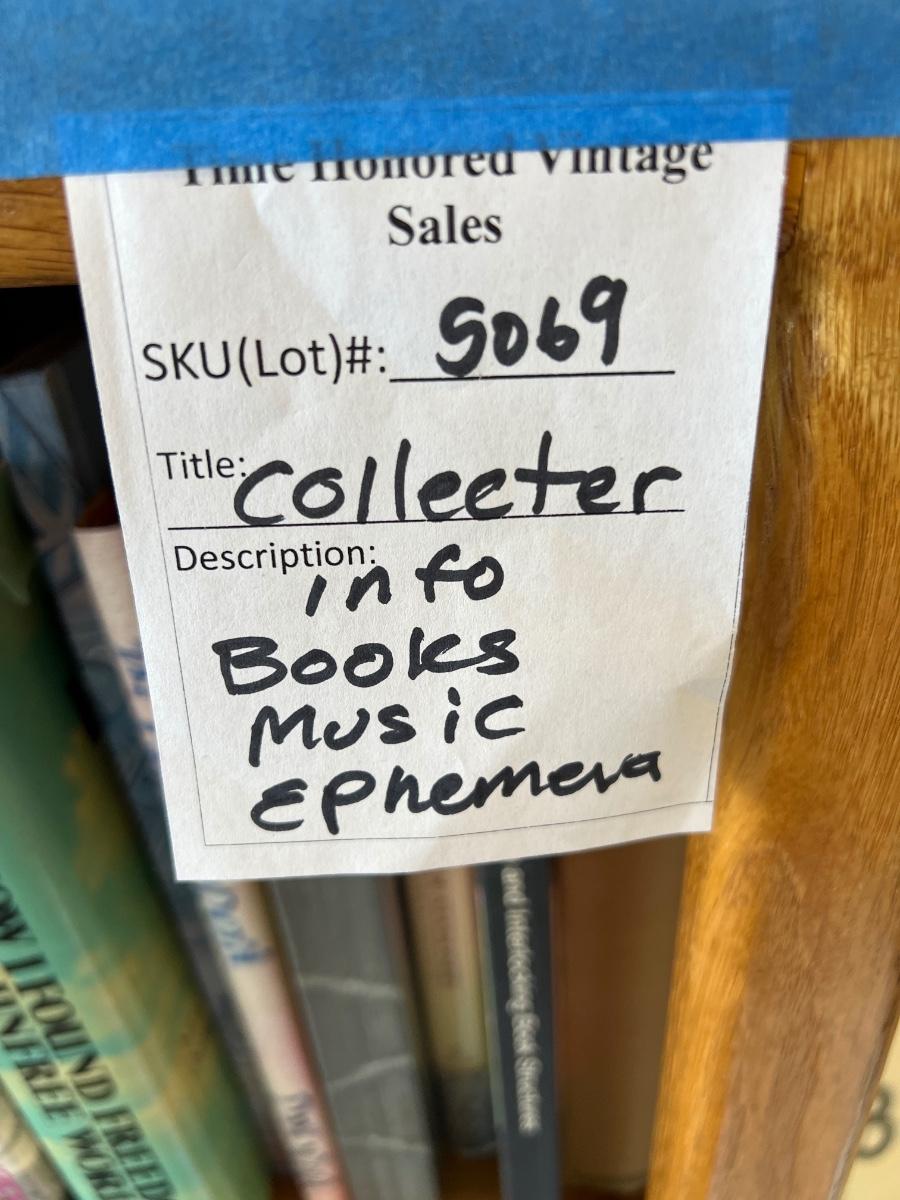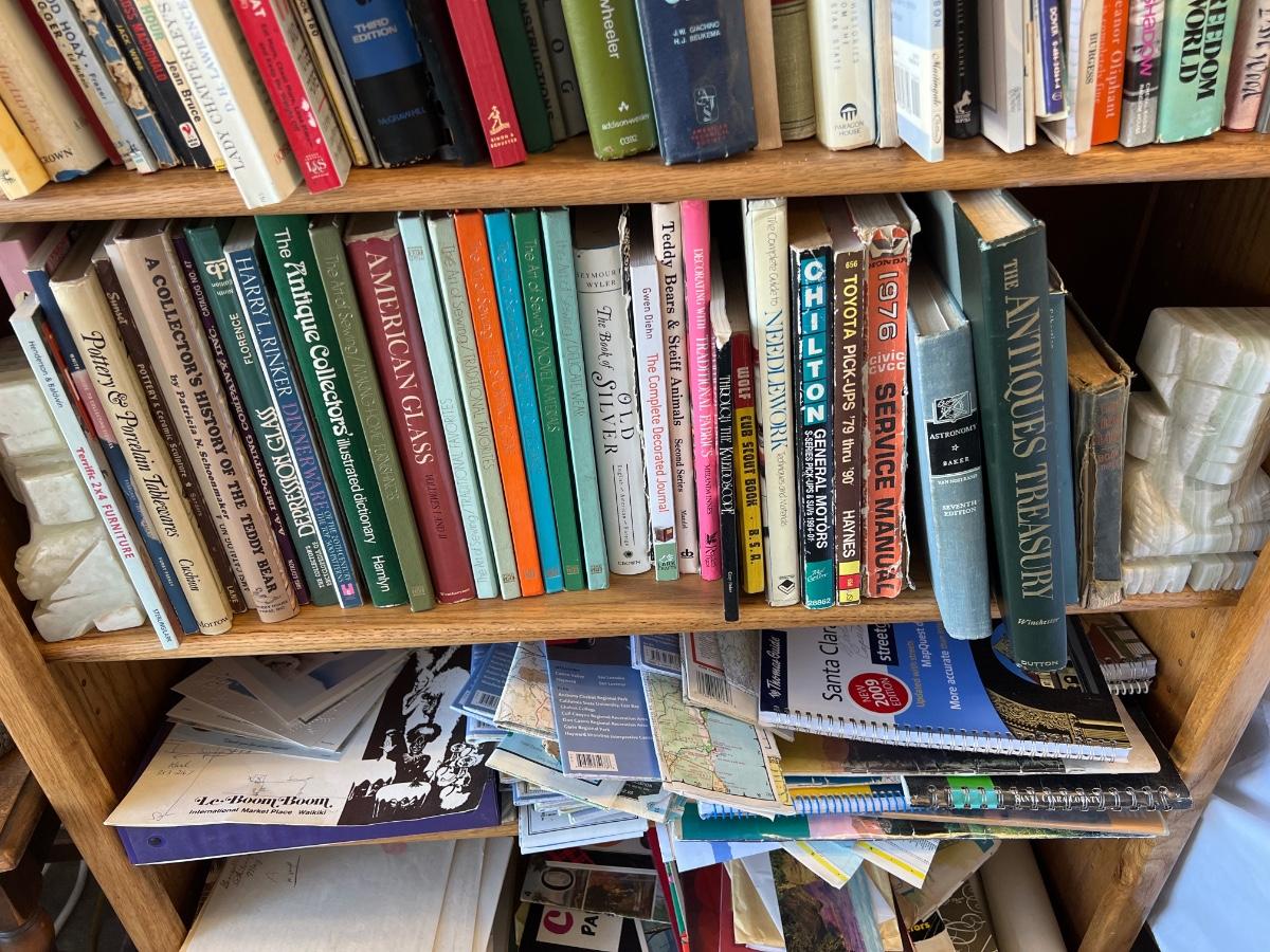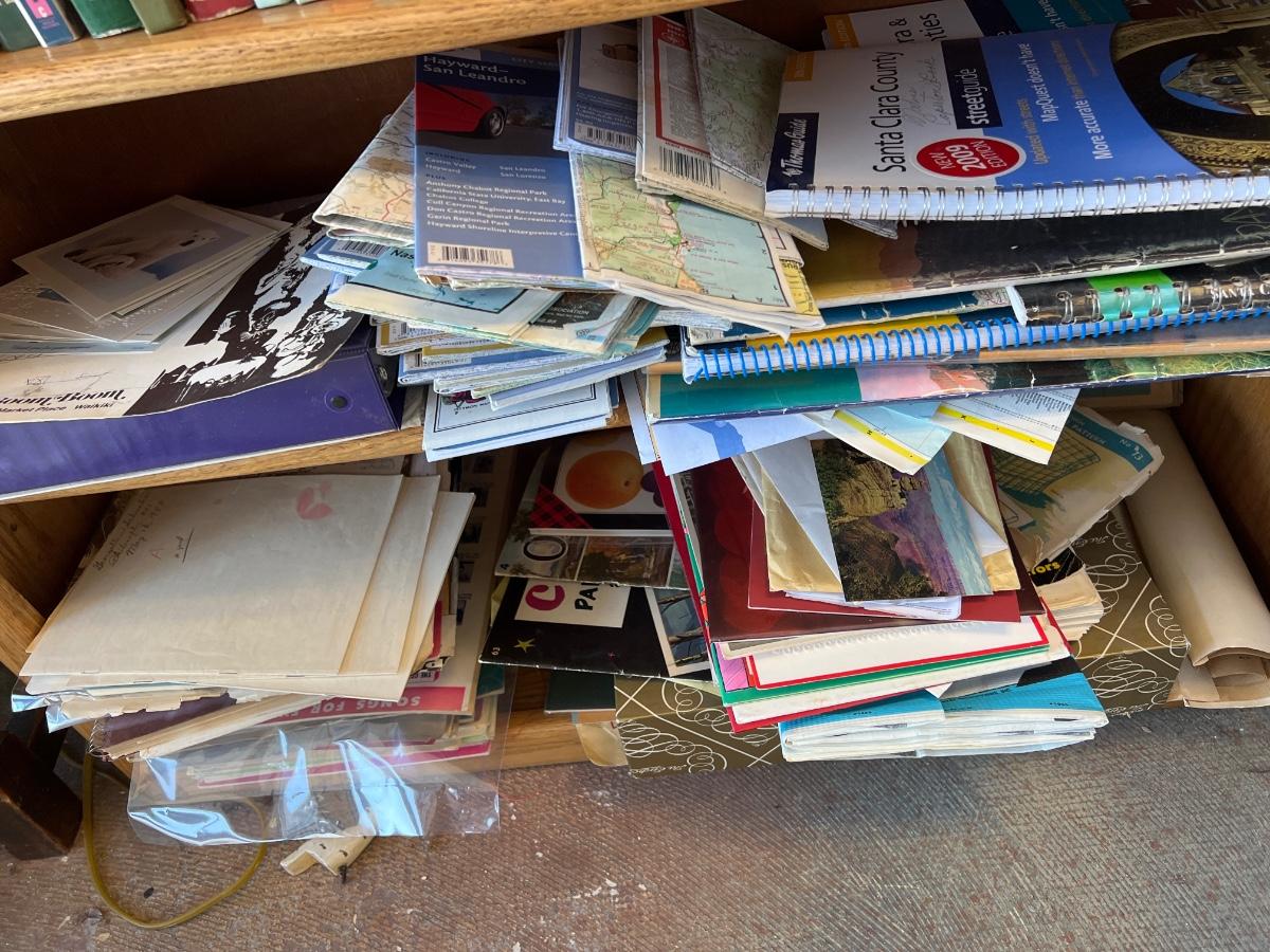 Antique collecting reference books, vintage auto Books, novelty, pulp, large amount of Thomas guides and maps of local area, sheet music, vintage box, piles of paper.