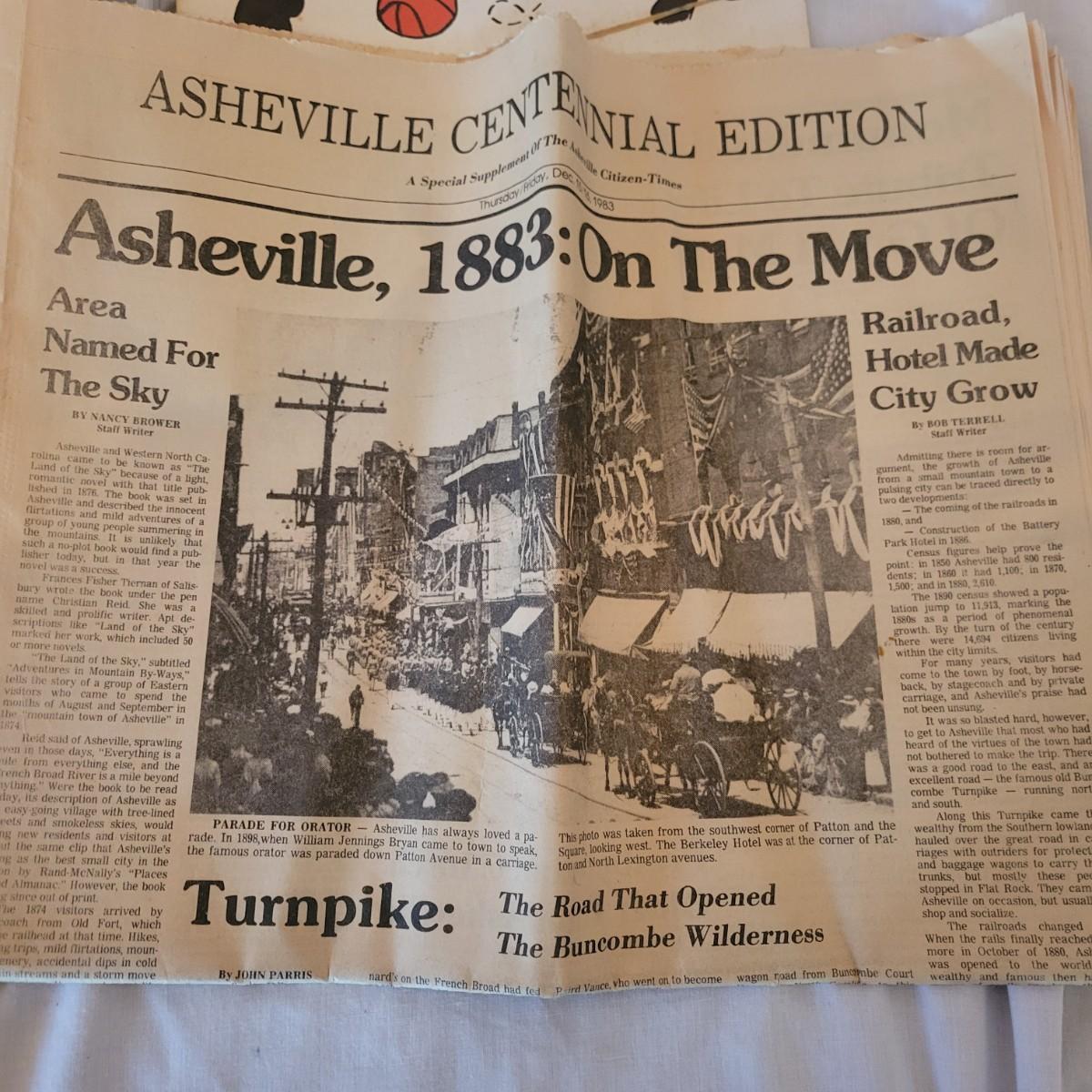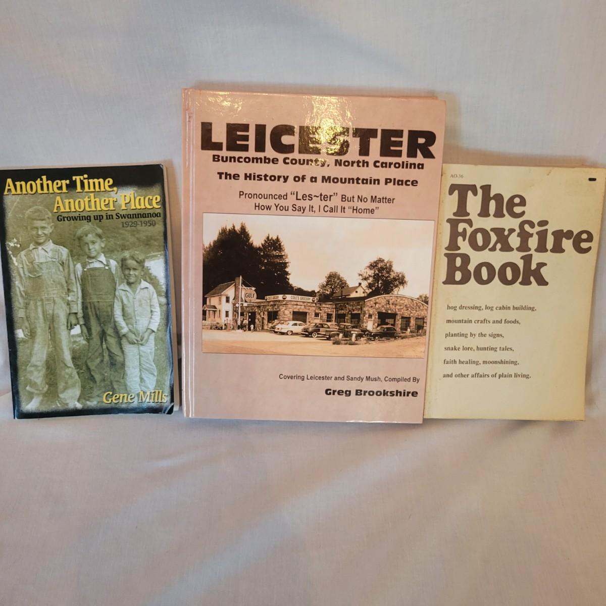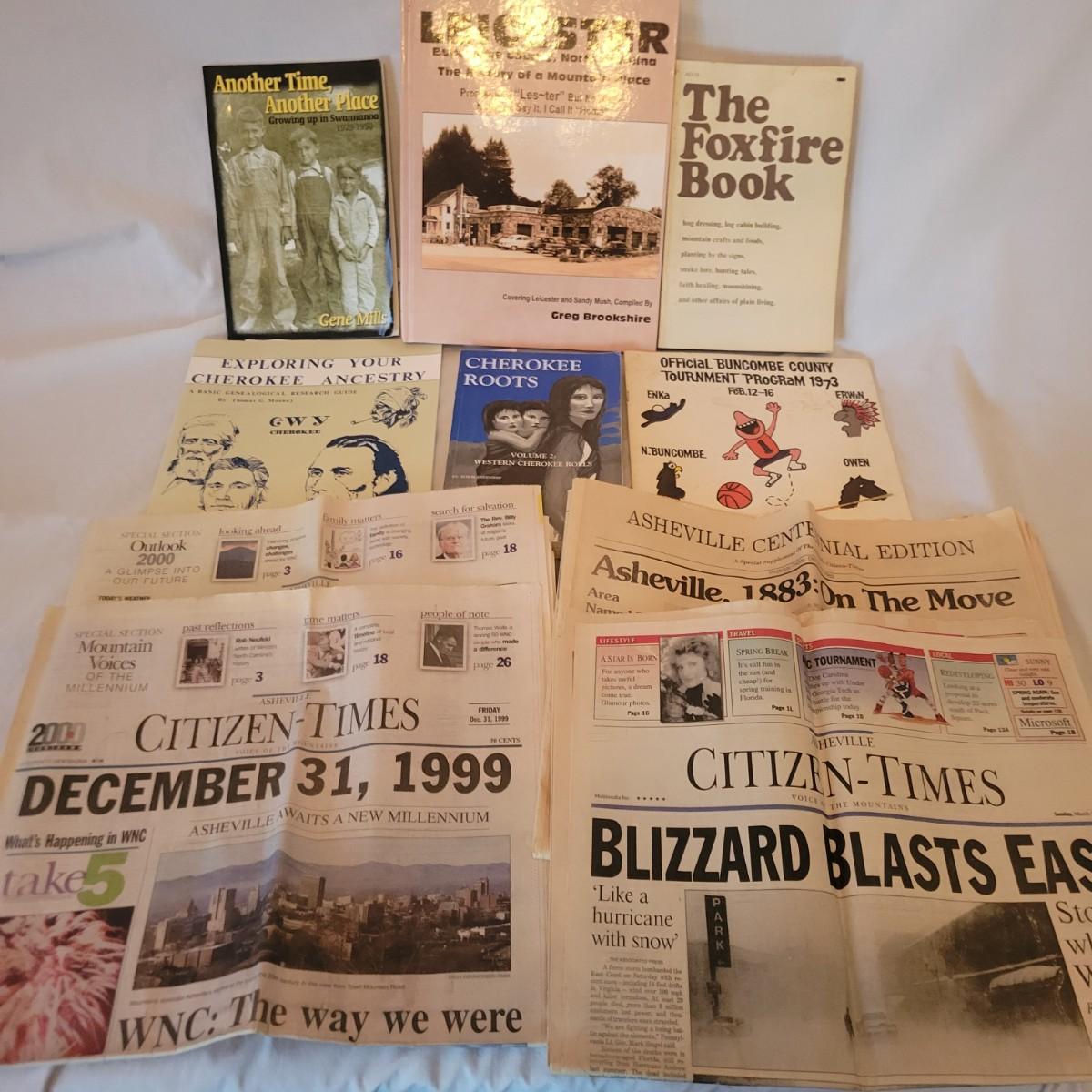 A collection of books and newspapers about the regional history of Western North Carolina. Lot includes The Foxfire Book, books on the history of Swannanoa and Leicester and Cherokee history. Also includes copies of the Citizen Times. Shipping available