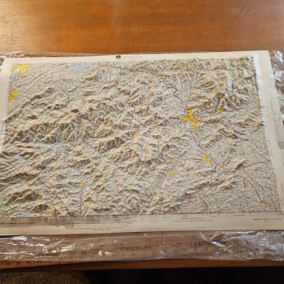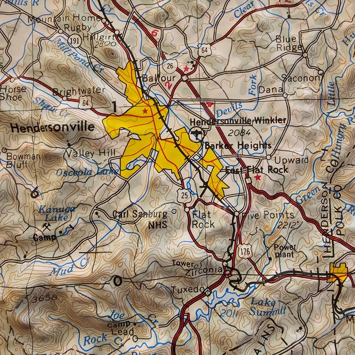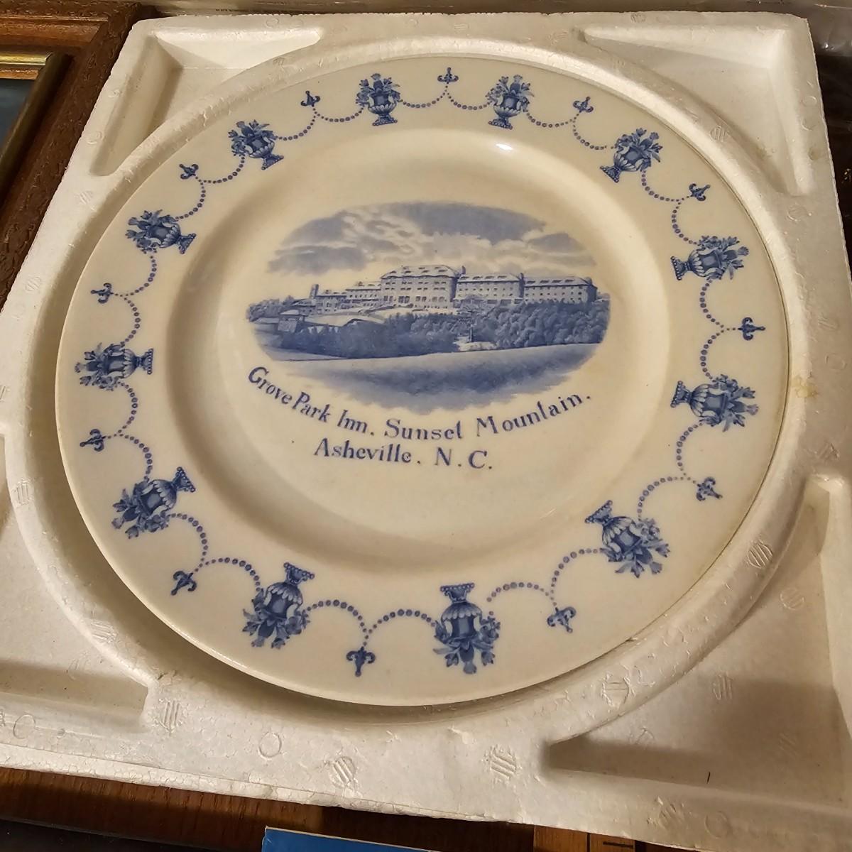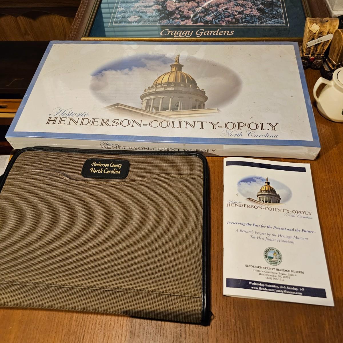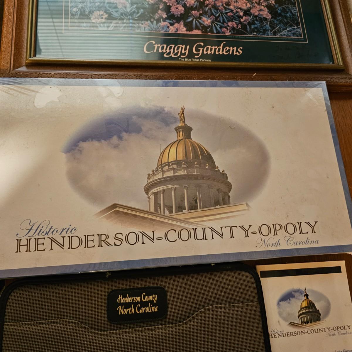 Items and books of interest regarding Hendersonville, Asheville and the surrounding area. Highlands area pottery, Henderson County inspired Monopoly-like game, framed & signed Craggy Gardens picture, Knoxville topographic map featuring WNC measures 32" x 20" and more. Several books of the area and the mountains, some of them signed by author or photographer. Grove Park Inn commemorative 10" plate. Blue Ridge Parkway framed poster signed by photographer; measures 23" x 19". Also includes a yardstick from local business. See photos for details. Local pickup only.