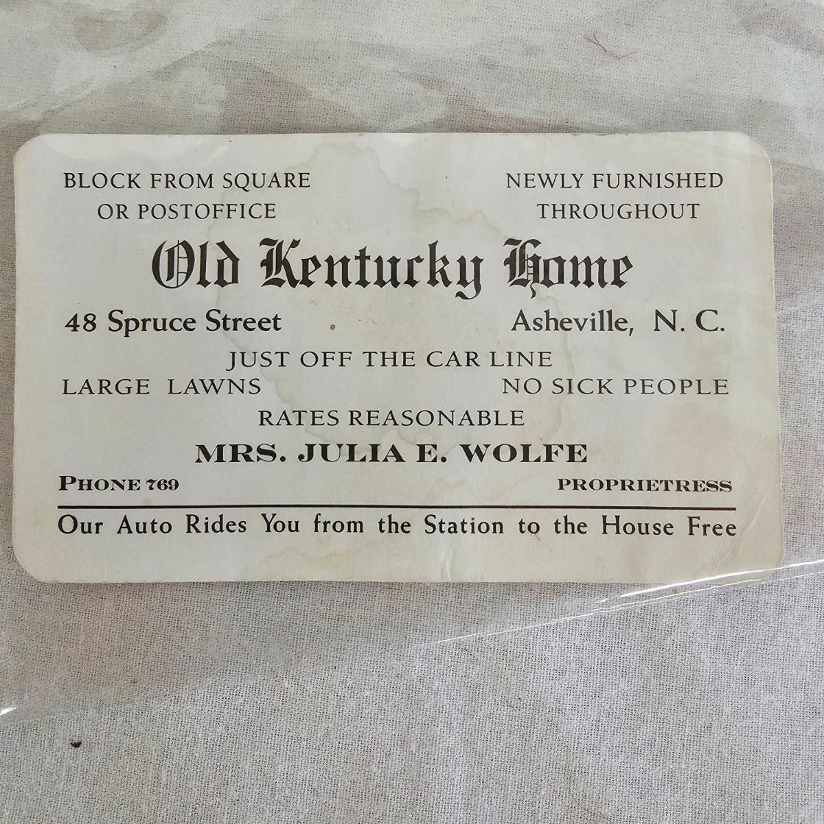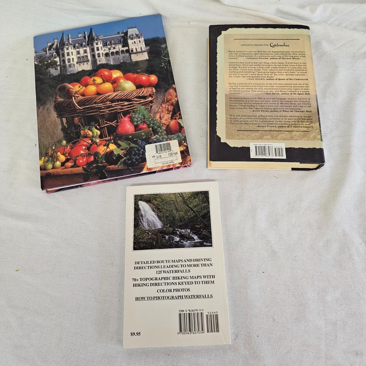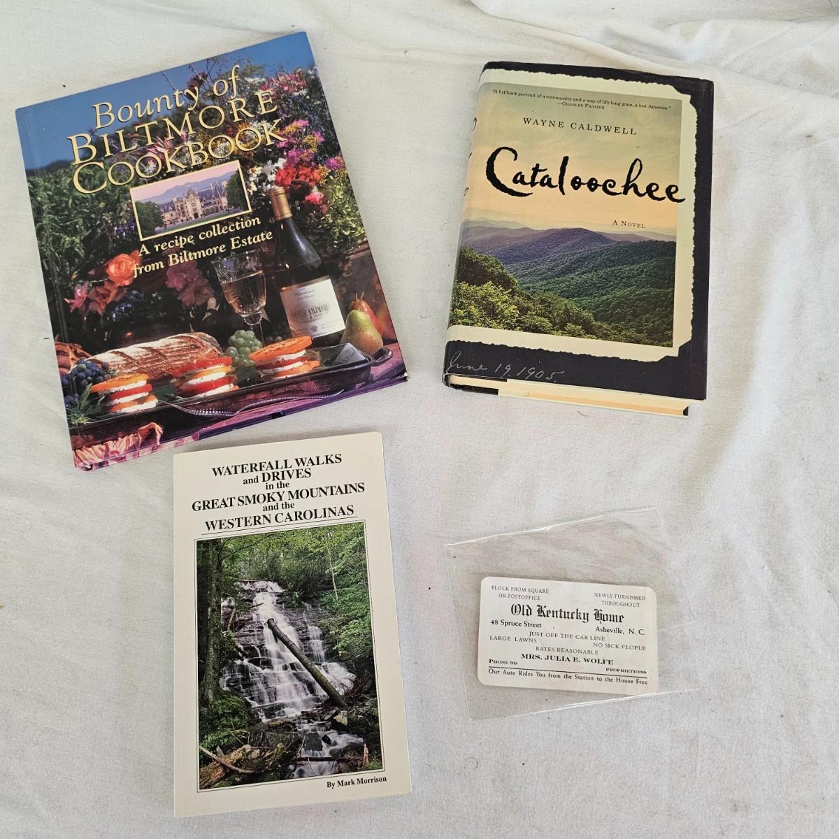 Three books about local sights and scenes. A book of favorite recipes from the Biltmore Estate kitchens. A novel about Cataloochee by Wayne Caldwell. A tour book and maps to see the many waterfalls in the state. And an advertising card for the Old Kentucky Home, a former boarding house in Asheville run by Mrs. Julia Wolfe, Thomas Wolfe's mother. Card may or may not be original. Slight watermark in middle of card. See photos for details. Shipping available.