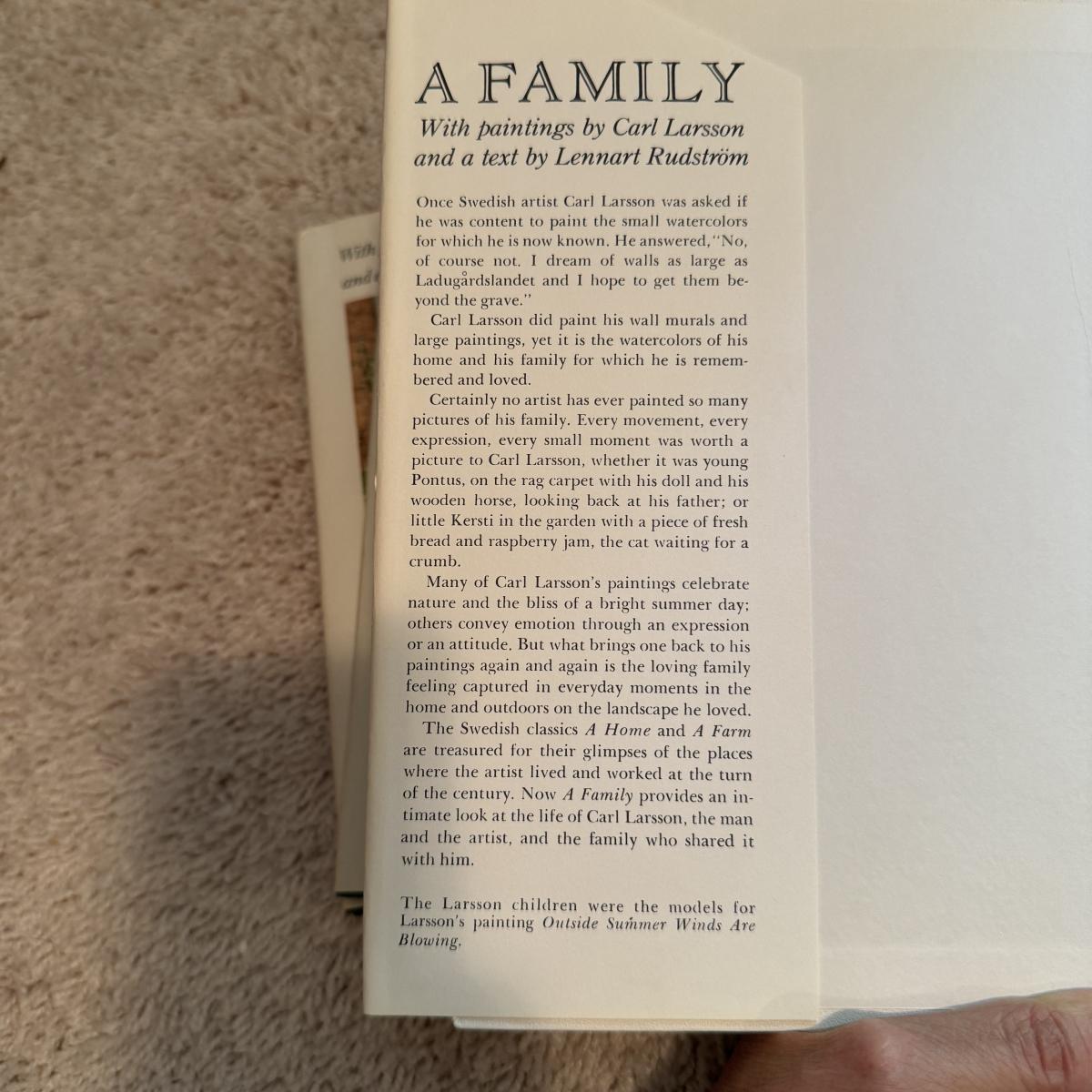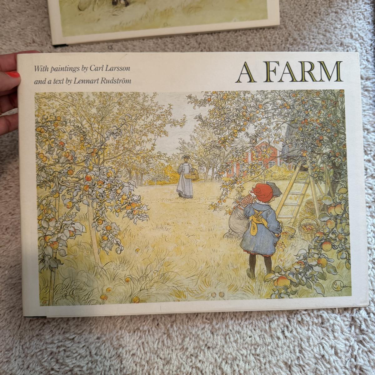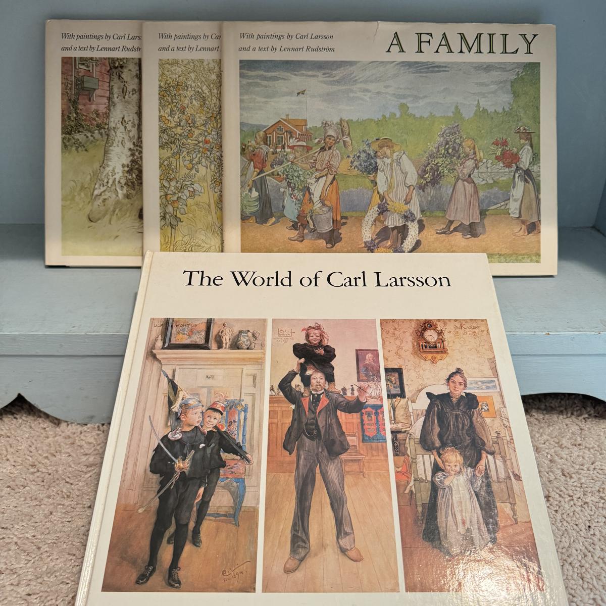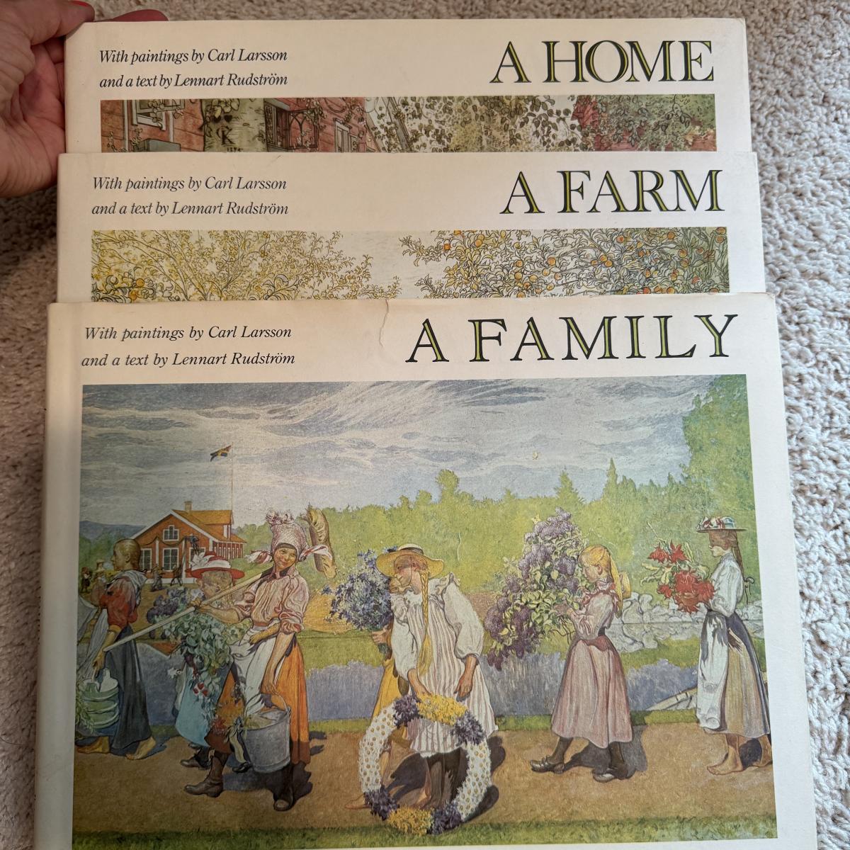 Four hardcover books of paintings by Carl Larsson. A trilogy of books include his watercolors with text by Lennart Rudström. They include A Home, A Farm and A Family. The first two say they are First American editions 1974. Lot also includes a shiny hardcover of The World of Carl Larsson. All books have beautiful color pictures.. Shipping available