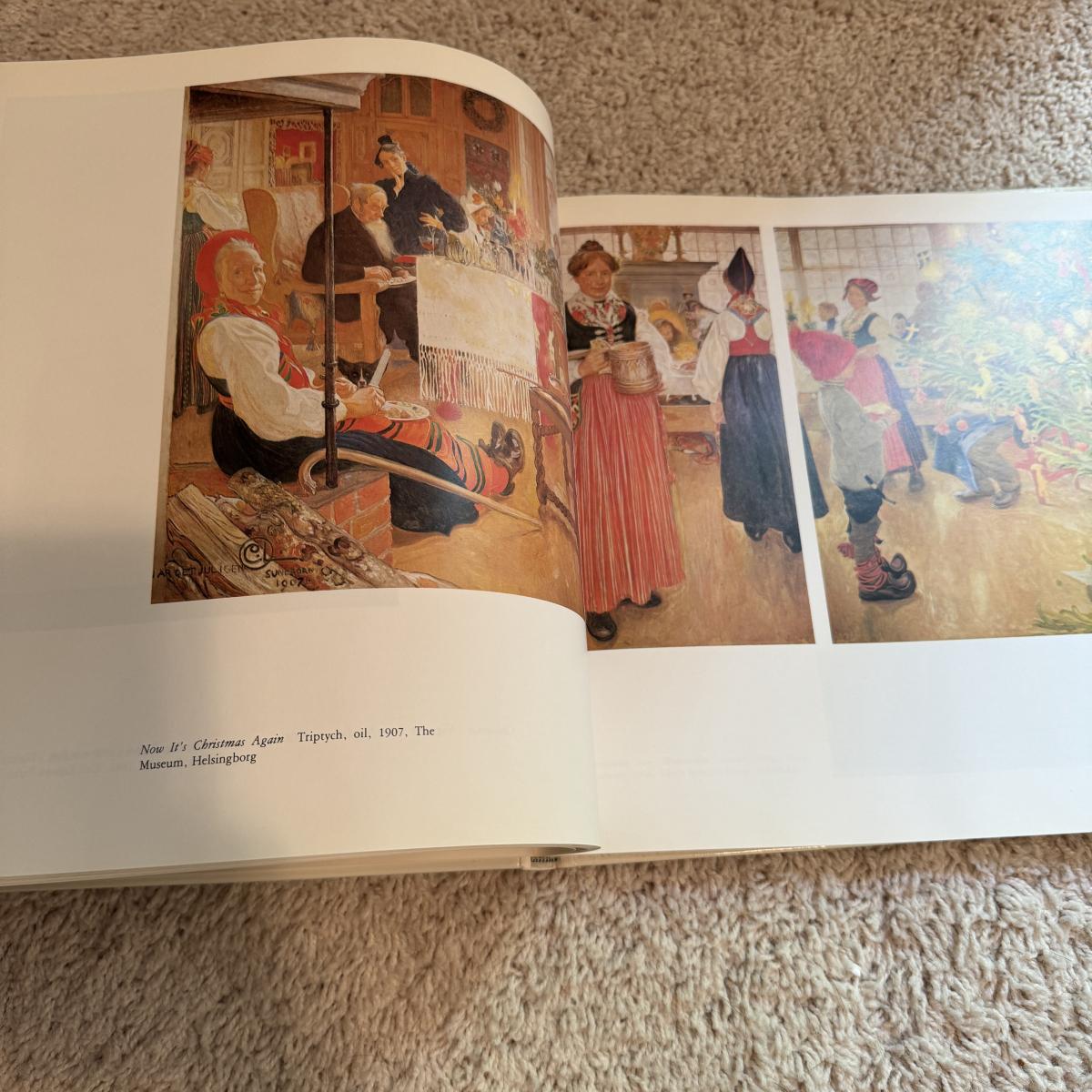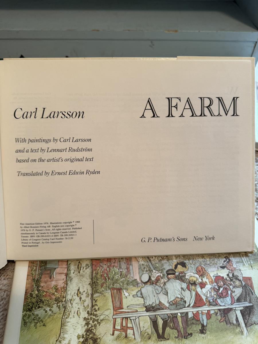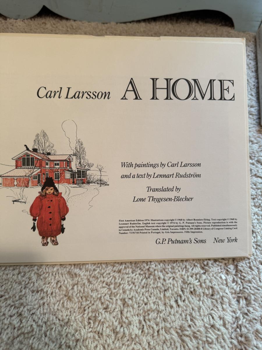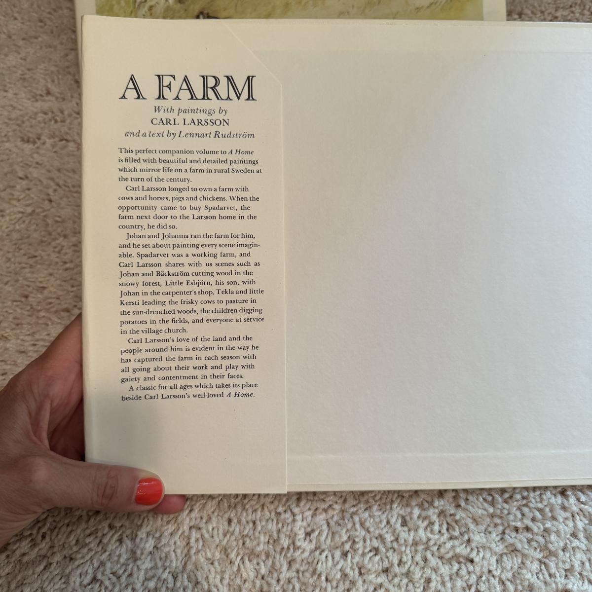Four hardcover books of paintings by Carl Larsson. A trilogy of books include his watercolors with text by Lennart Rudström. They include A Home, A Farm and A Family. The first two say they are First American editions 1974. Lot also includes a shiny hardcover of The World of Carl Larsson. All books have beautiful color pictures.. Shipping available