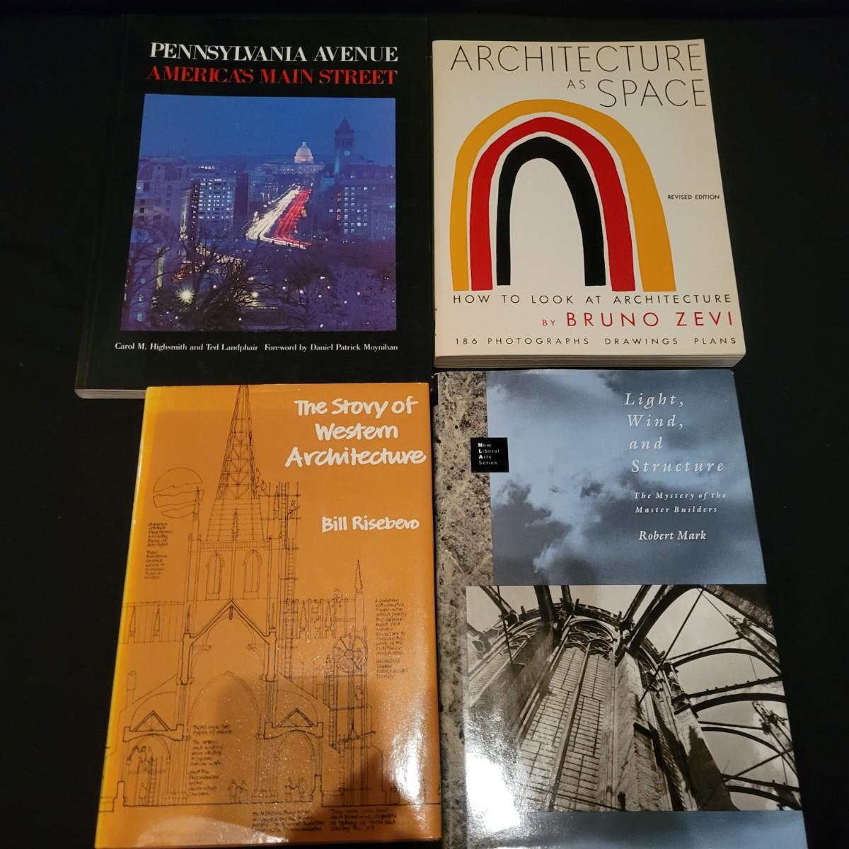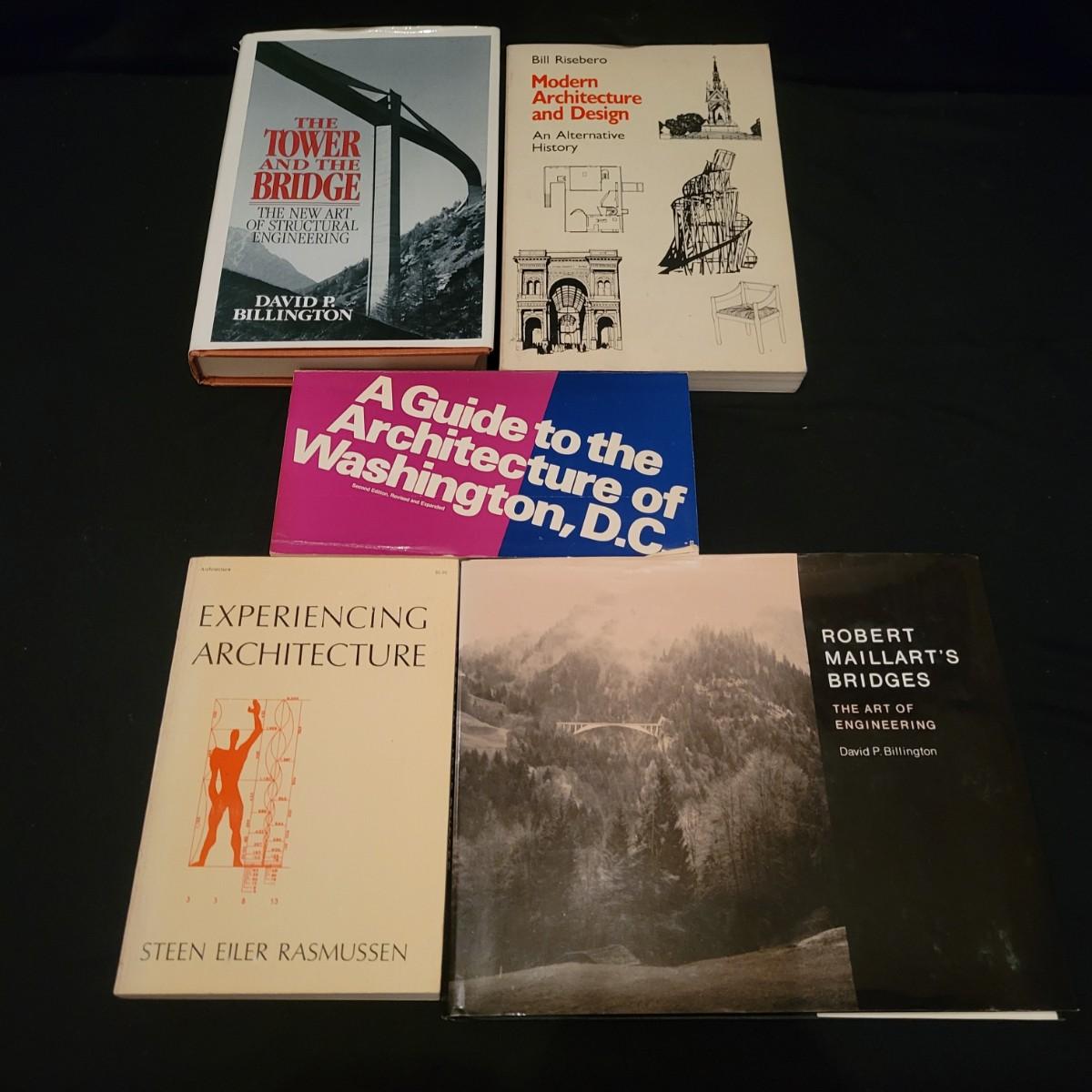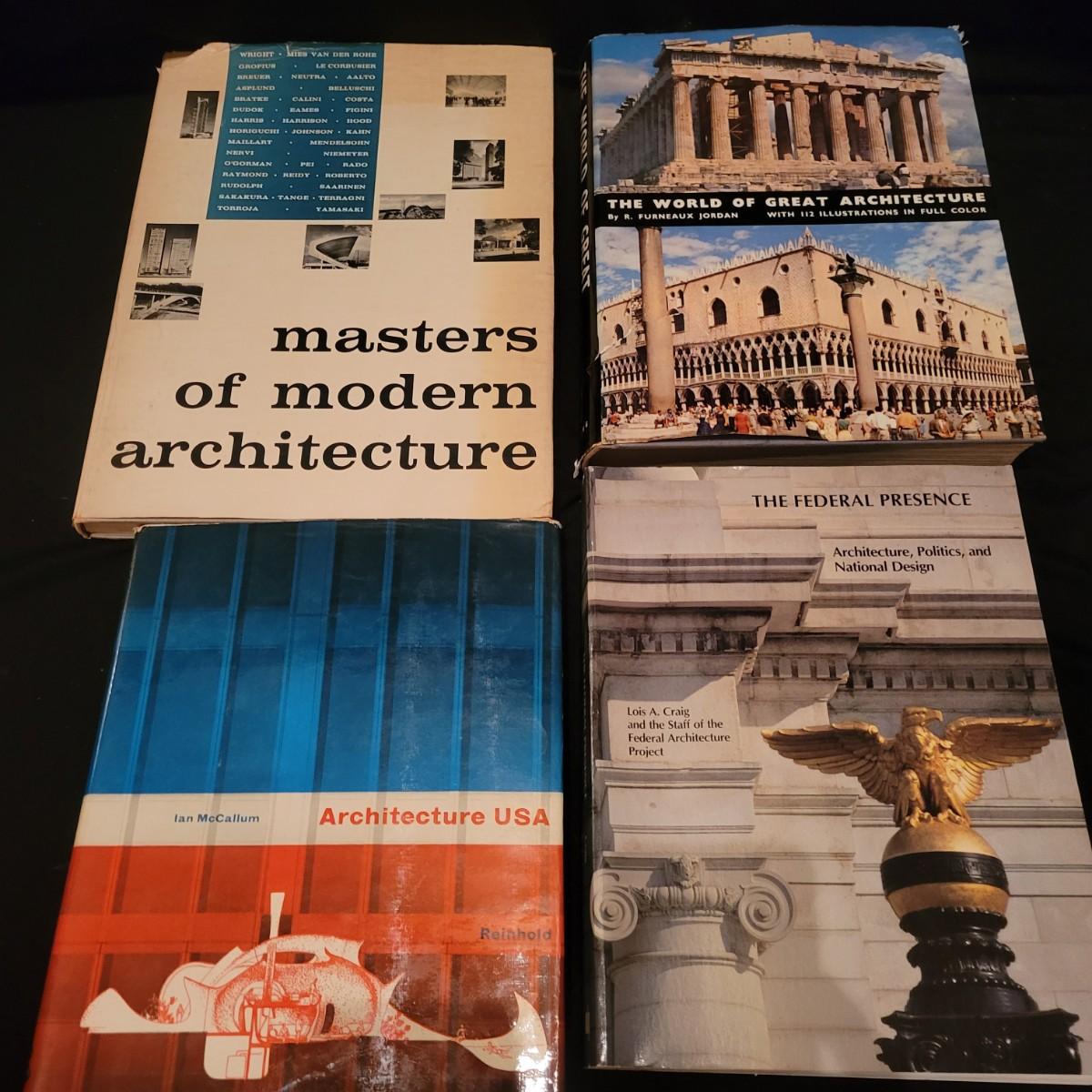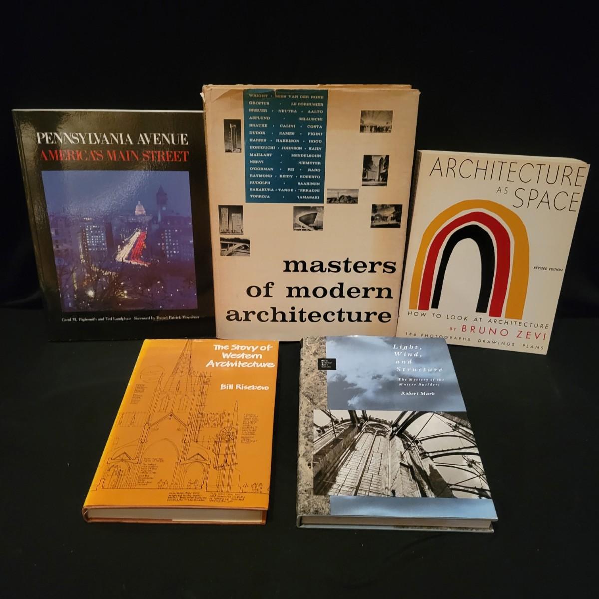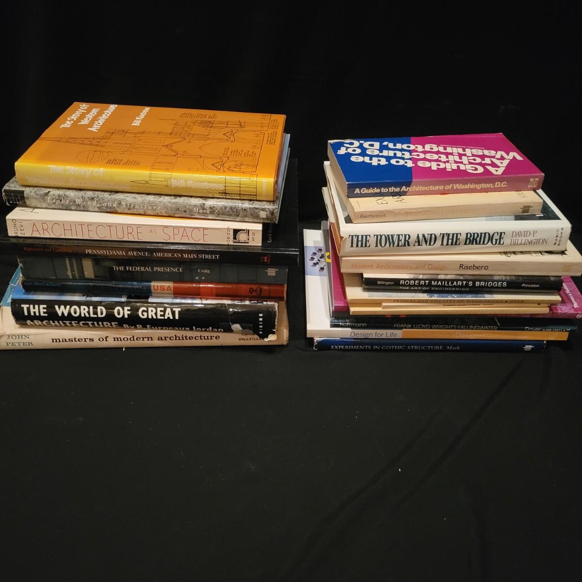 An assortment of over 20 books on various types of architecture. Subject matters range from the designs of Frank Lloyd Wright to scared geometry to the "masters of great architecture". Local pickup only