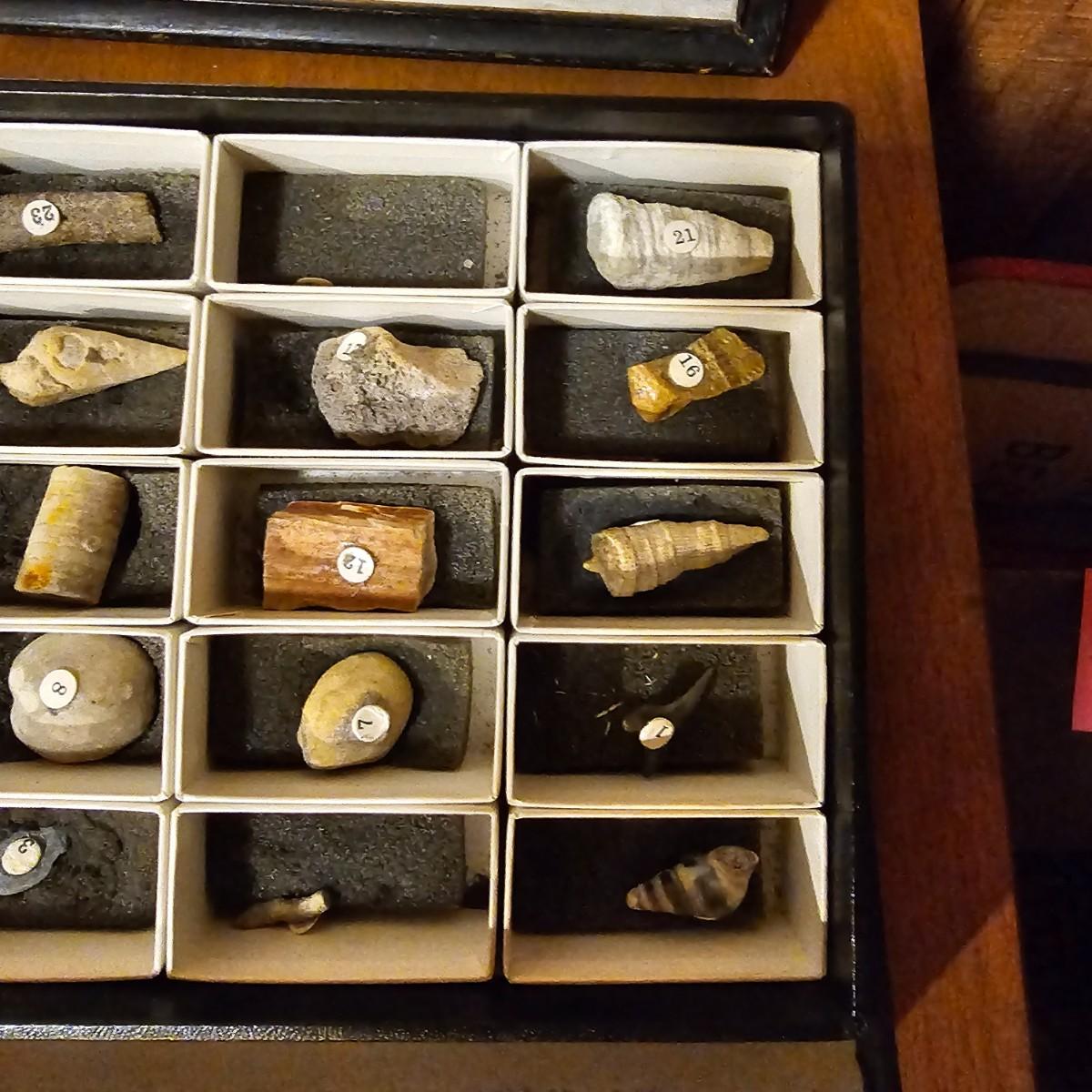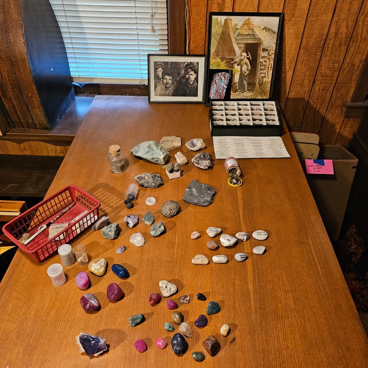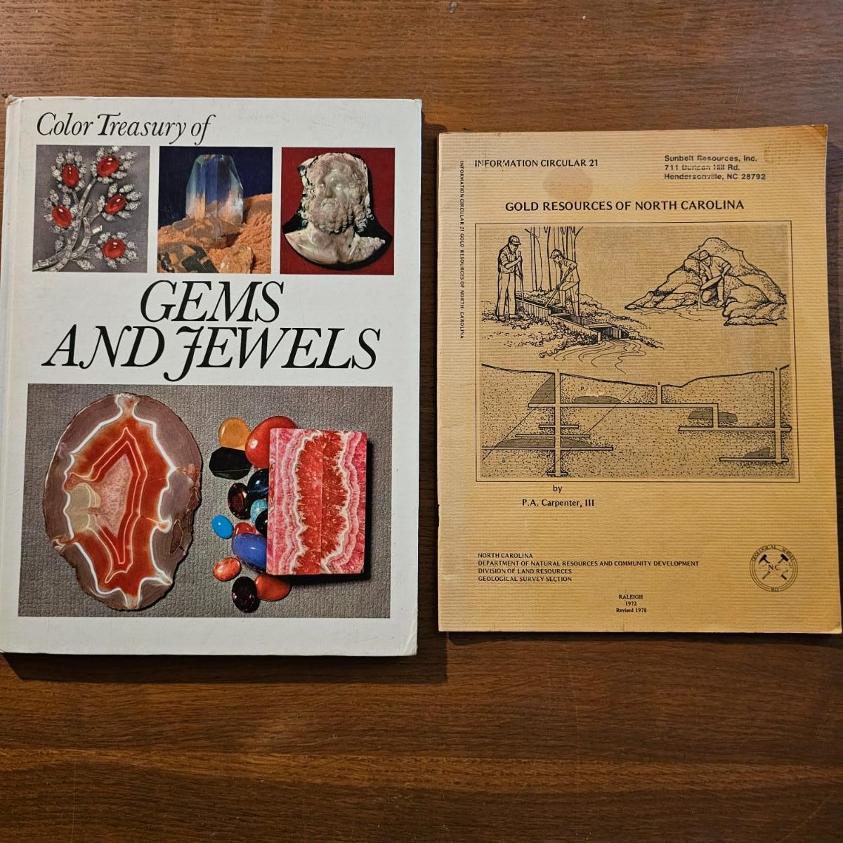 Lot features local Asheville Citizen Times author Bob Terrell's book Old Gold plus author Bill M Clem signed copy of Gold and Silver. Also included are books, rocks, specimens, more. Various editions regarding gold mining, rock exploration, geology and more. Stories, textbooks, discussions and other resources. Also includes several specimens, box of labeled fossils, others. See photos for details. Local pickup only.