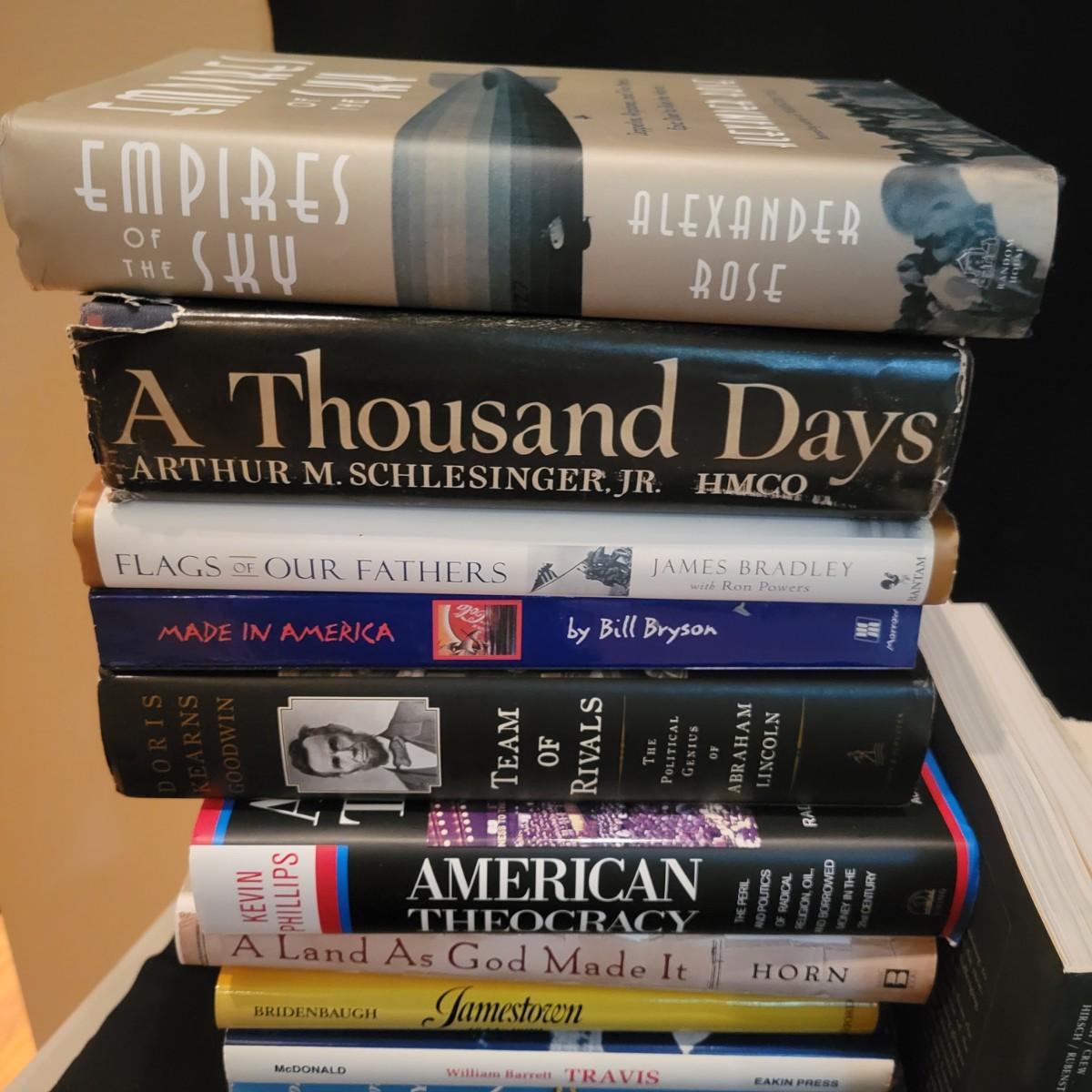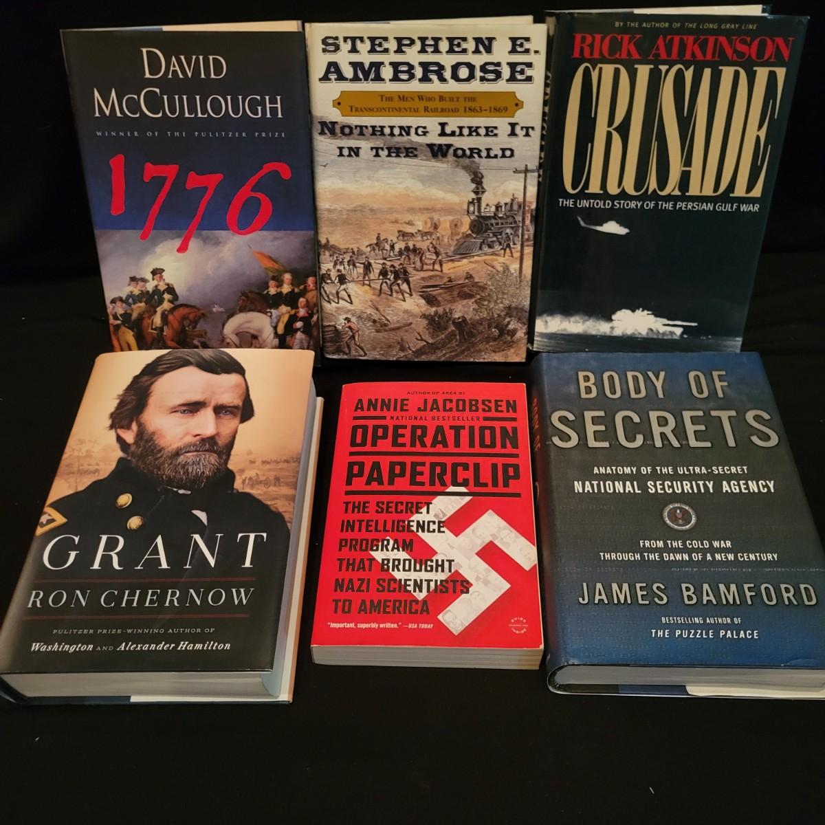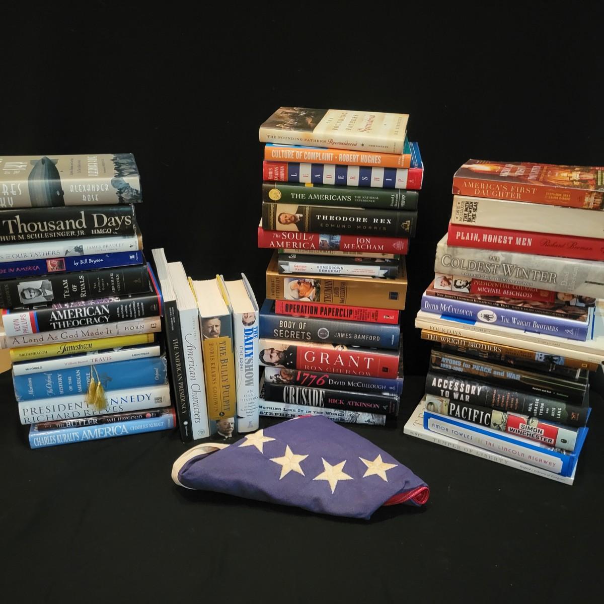 Over 45 books covering a wide range of topics about US history. Authors include Stephen Ambrose, David McCullough, Alexander Rose and more. This lot also includes a Betsy Ross flag made of heavy cloth with the original circular design of the 13 colonies. Flag measures approximately 56" x 30". Local pickup only.