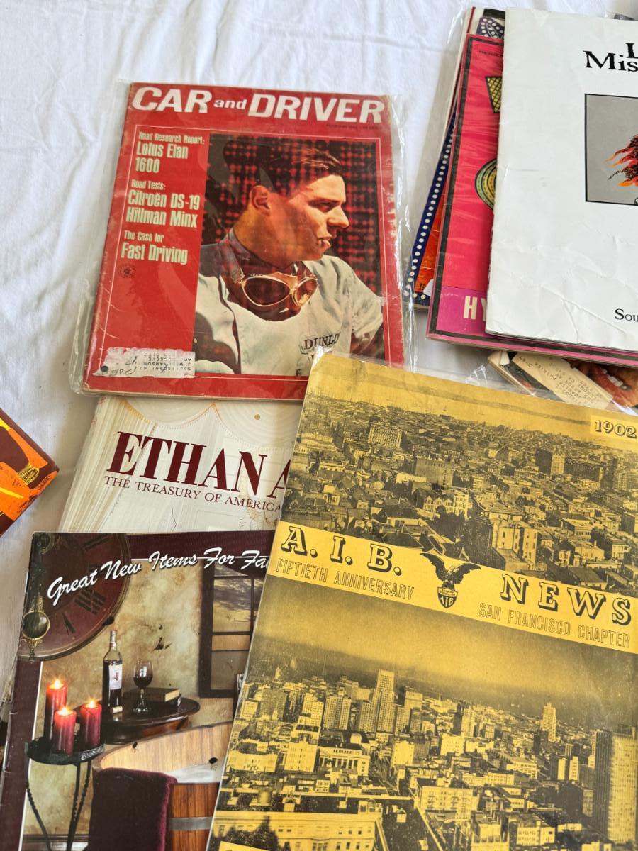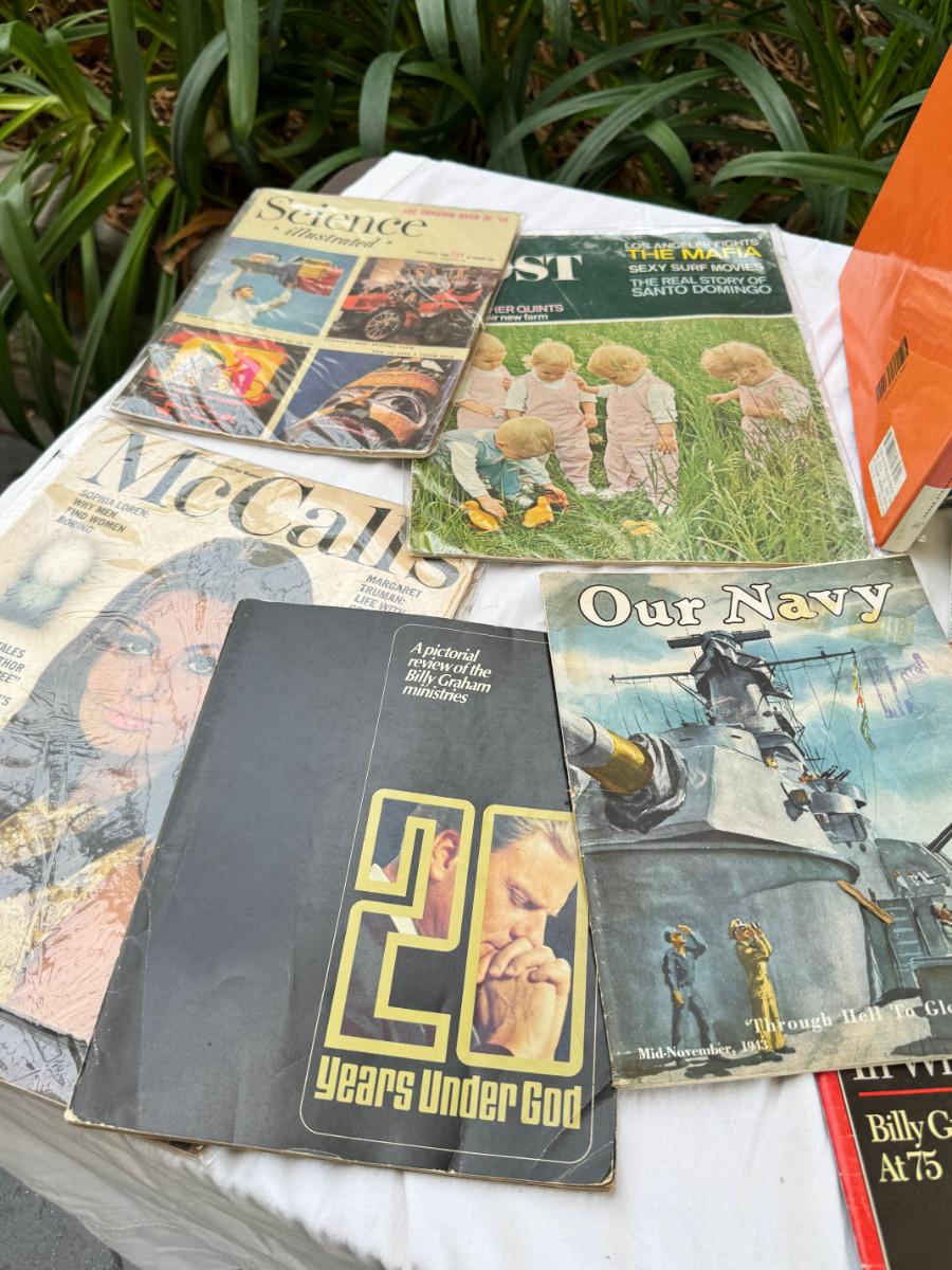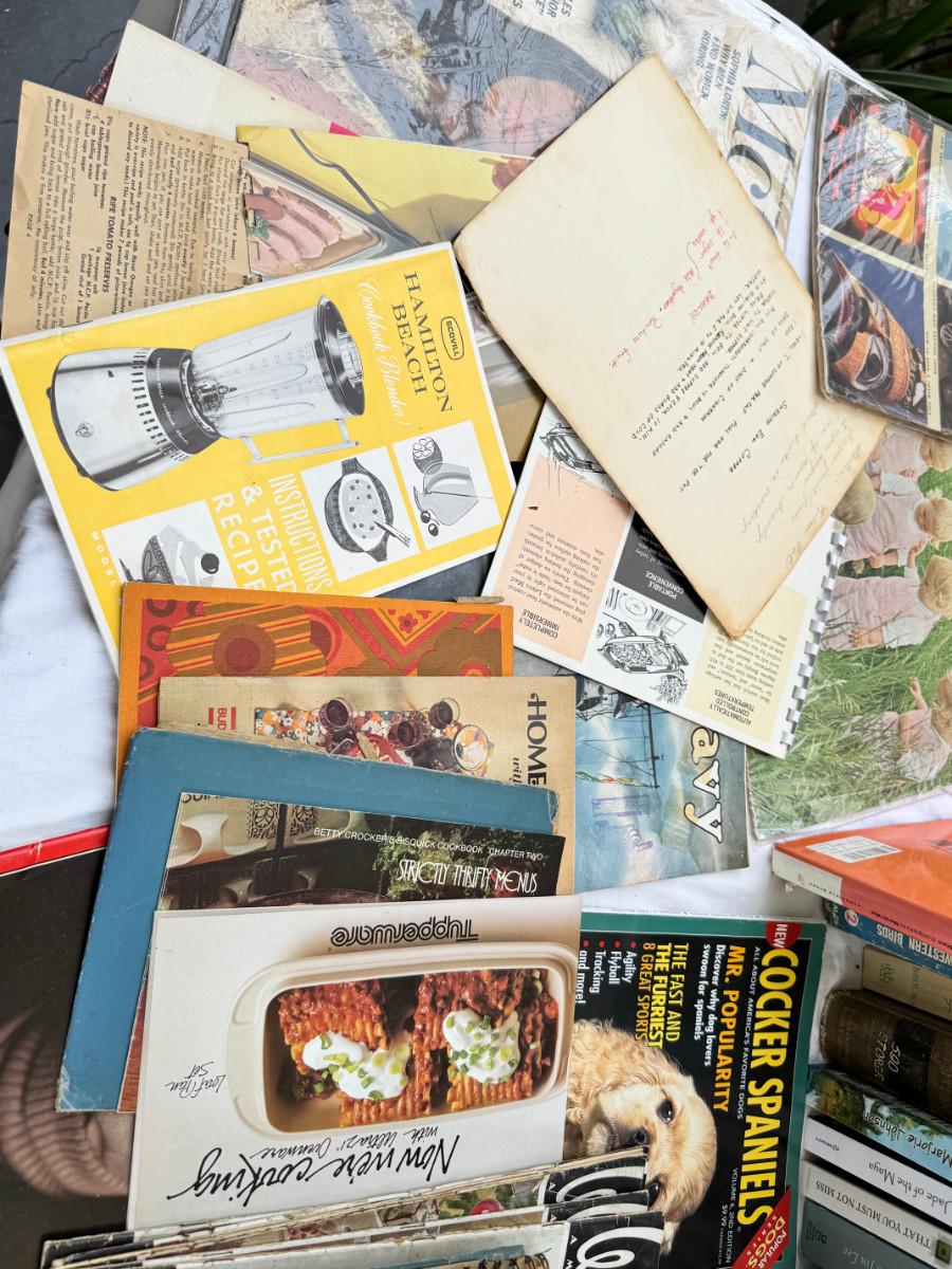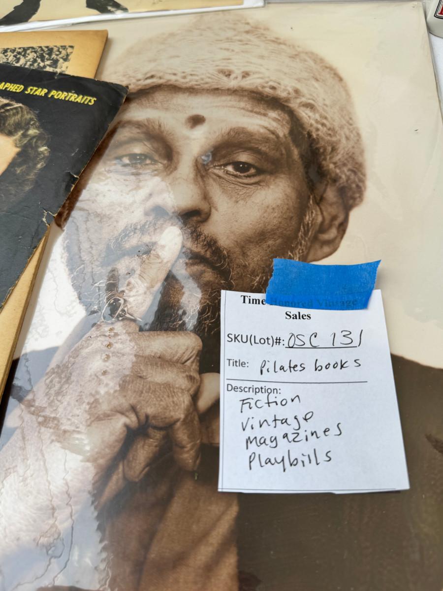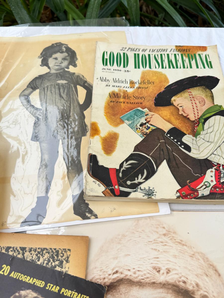 Pilates Yoga and fiction books. Vintage magazines, Guru photo, Shirley temple cut out, cook books.