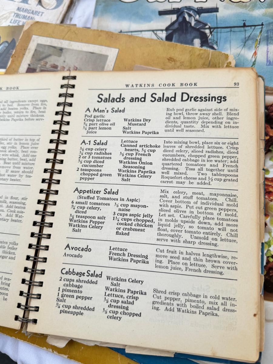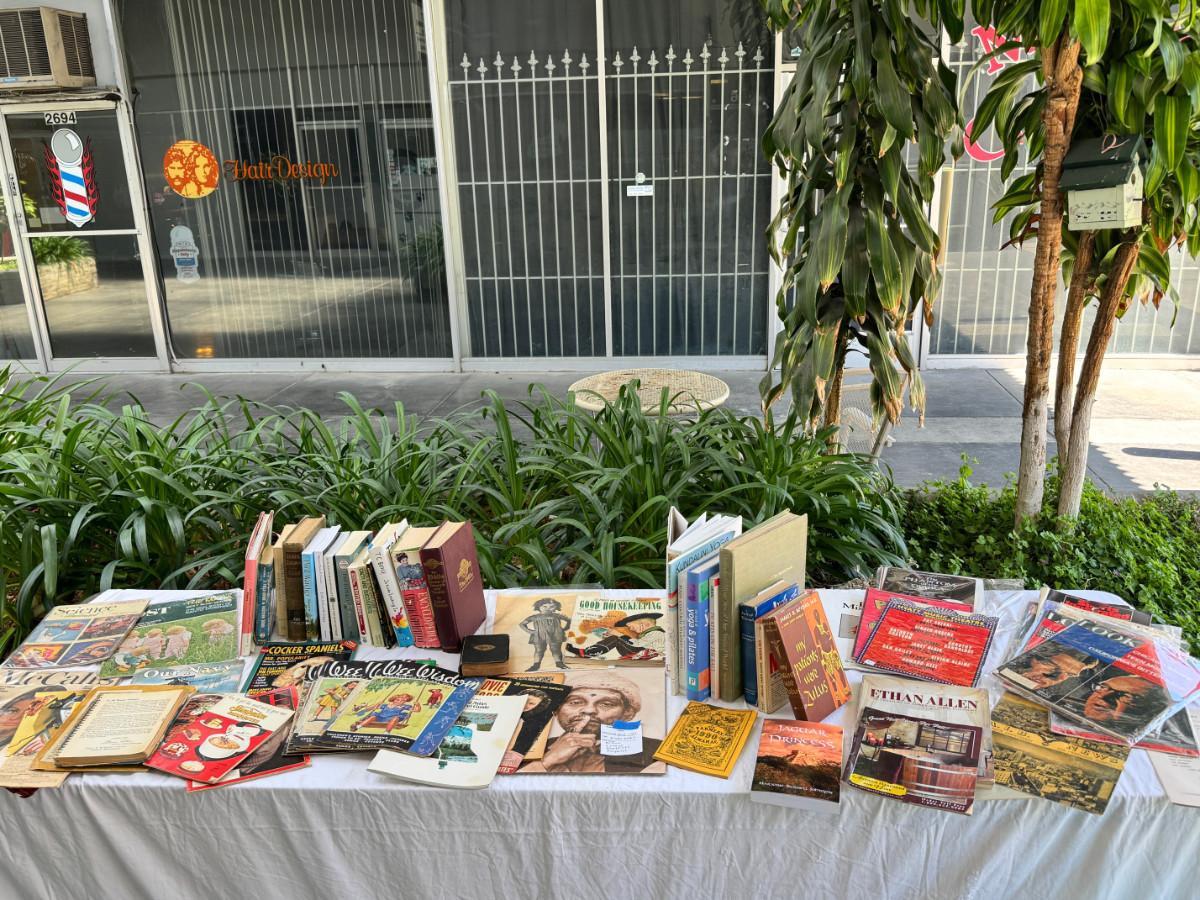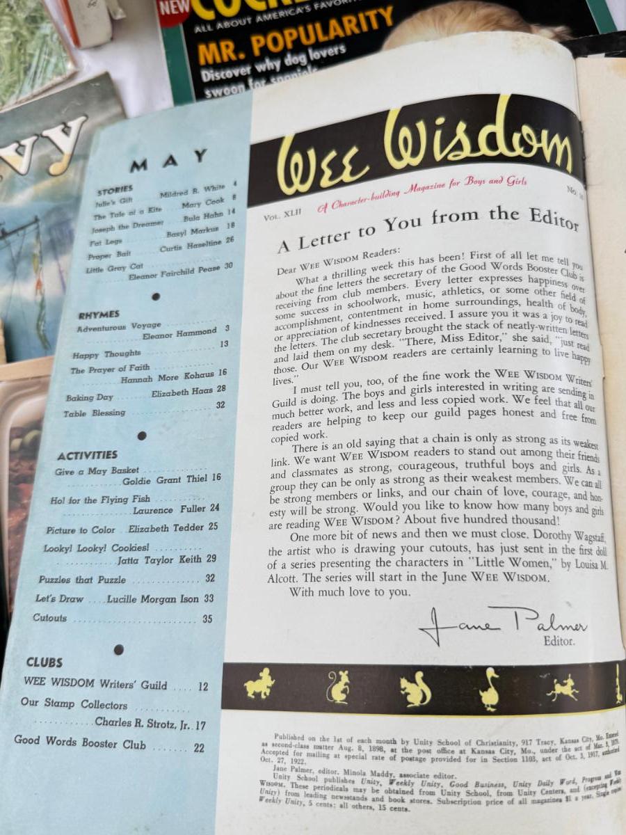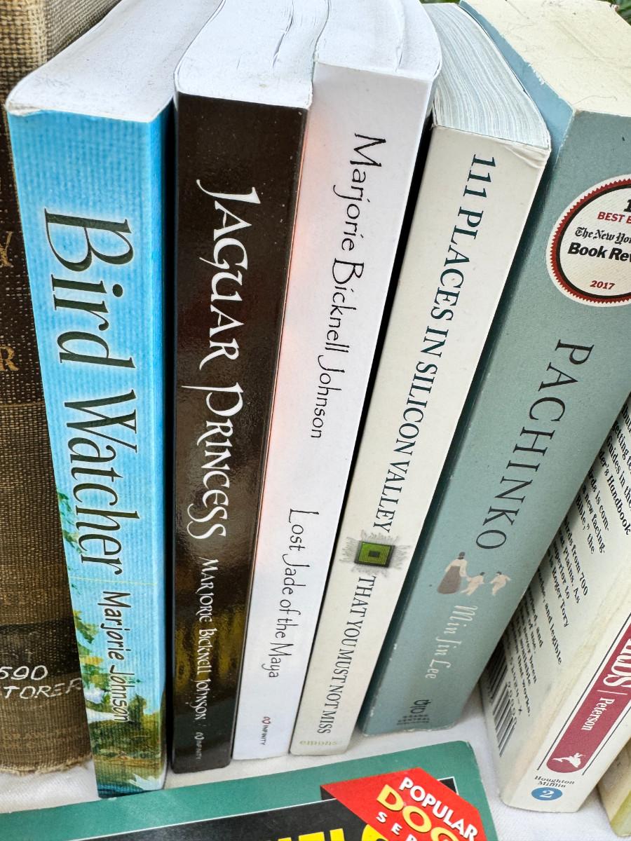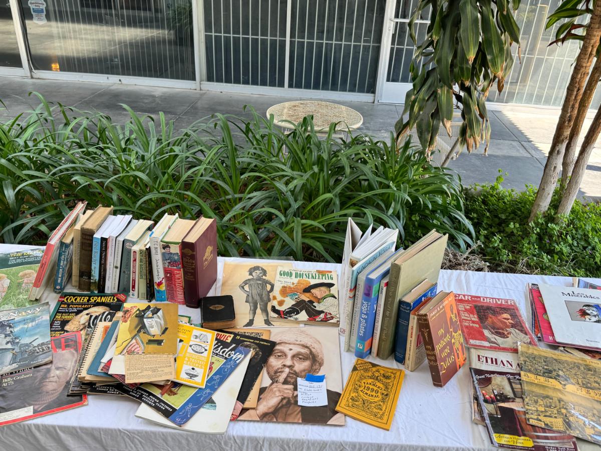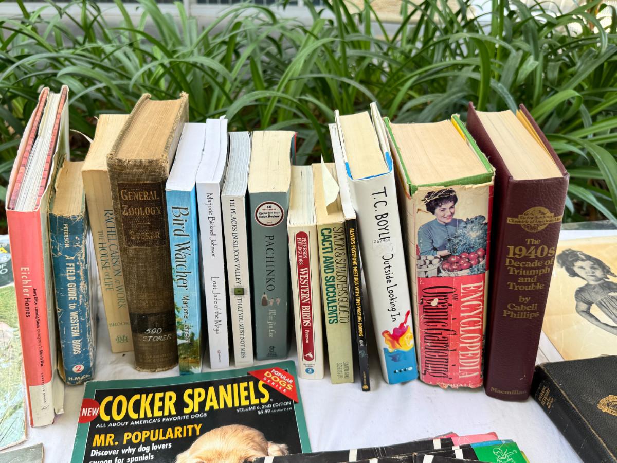 Pilates Yoga and fiction books. Vintage magazines, Guru photo, Shirley temple cut out, cook books.