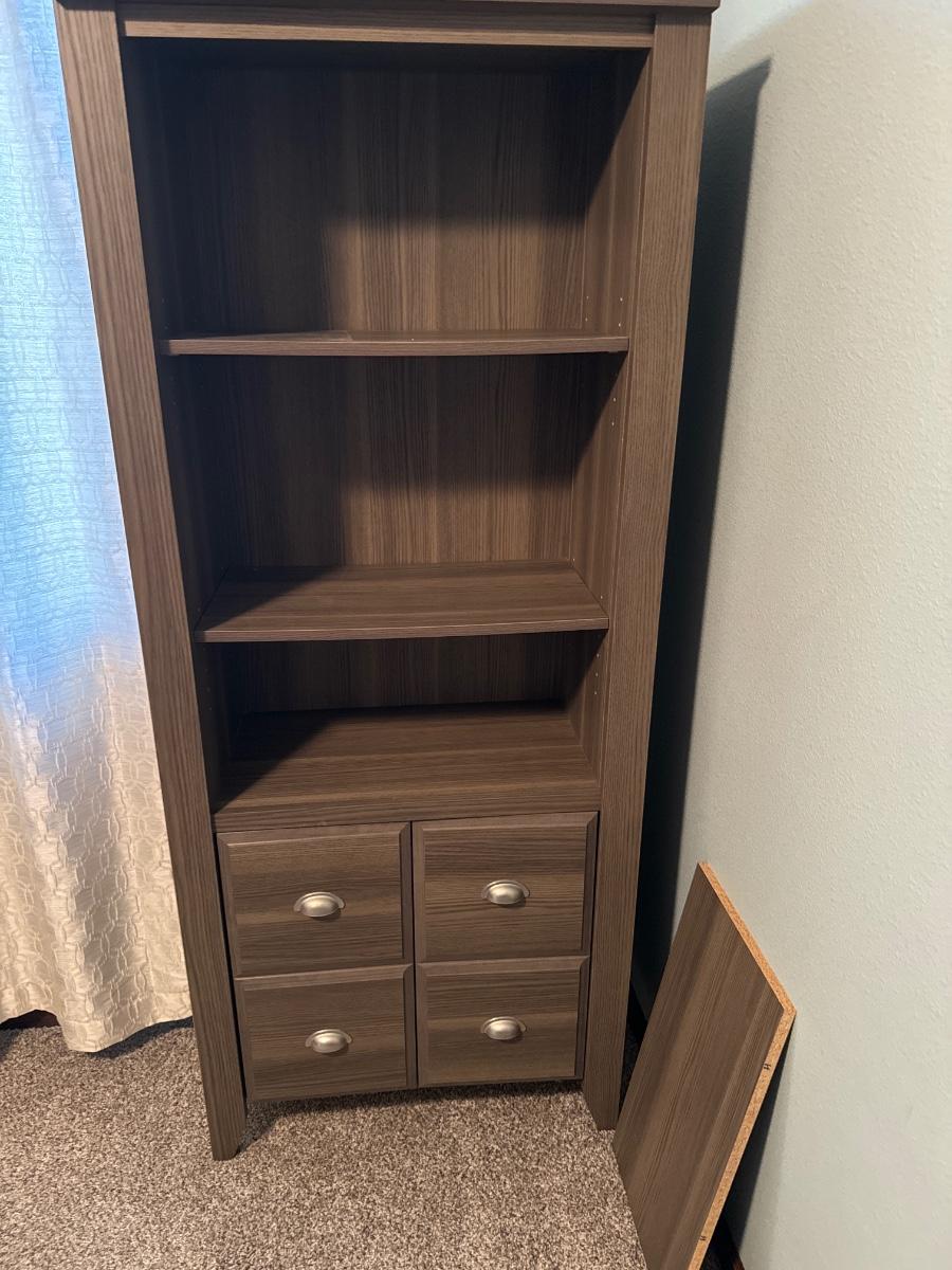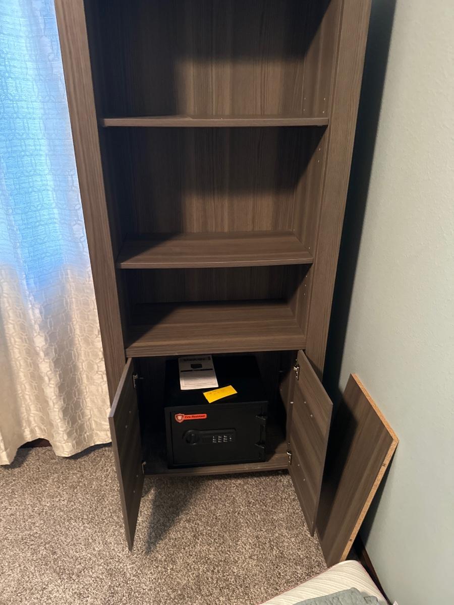Very nice with extra shelf off to the right side of the picture. Black fire resistant safe not included. Dimensions are 68 1/2 inches tall by 28 1/2 inches wide by 14 1/2 inches deep.