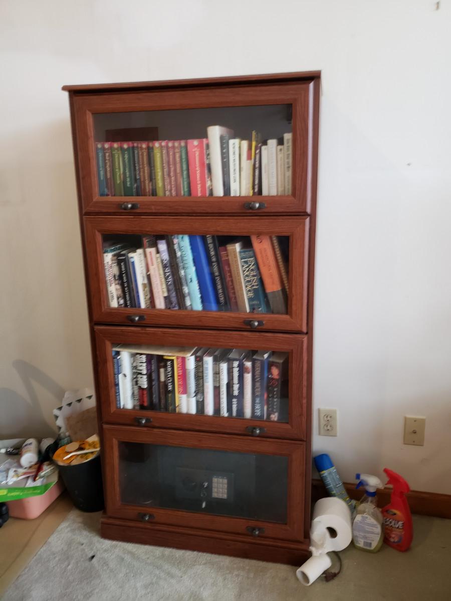 This bookcase is styled like a barrister's book case, but it's one solid piece and does not come apart in separate sections. Contents not included. Measures 21x12x58