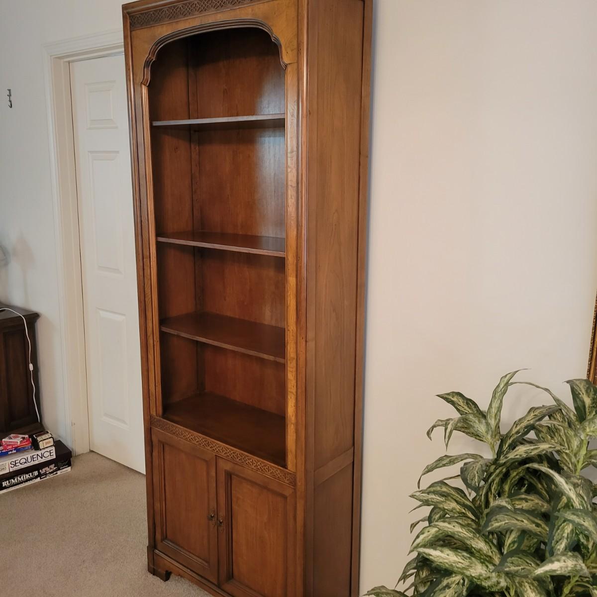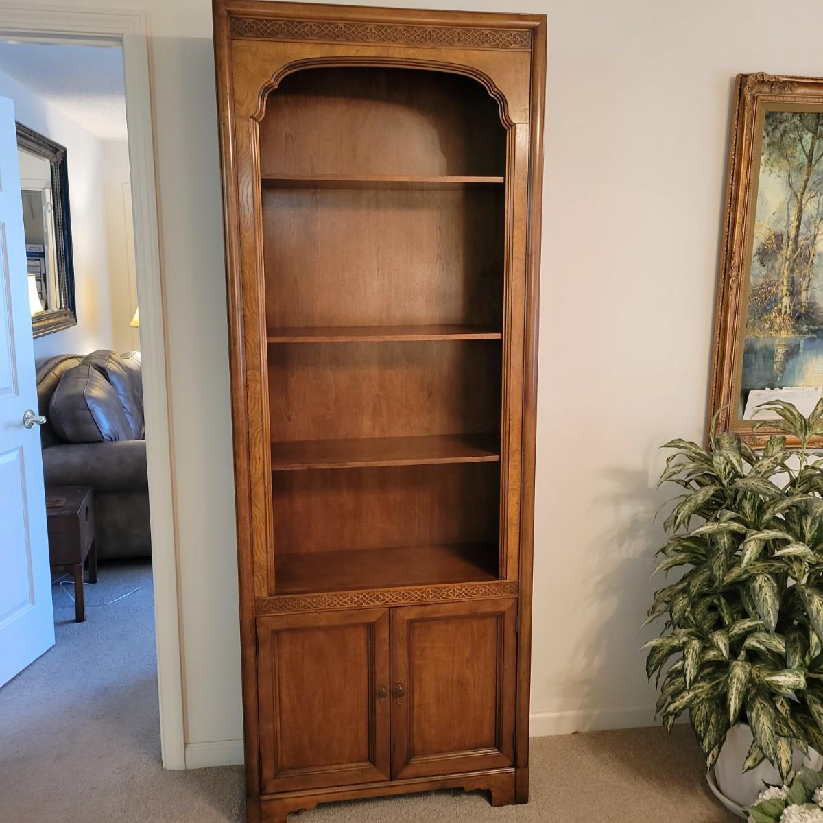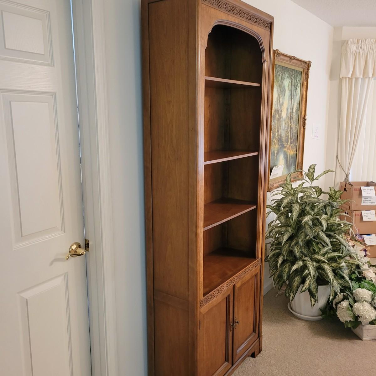 A wooden bookshelf with a cabinet on the bottom. This bookshelf features three adjustable shelves with decorative carvings and an ornate scrolled outer frame. Measures approximately 30" x 12" x 80.5"H. Local pickup only. Winning bidder must bring assistance to help move and load this item due to its weight and/or size.