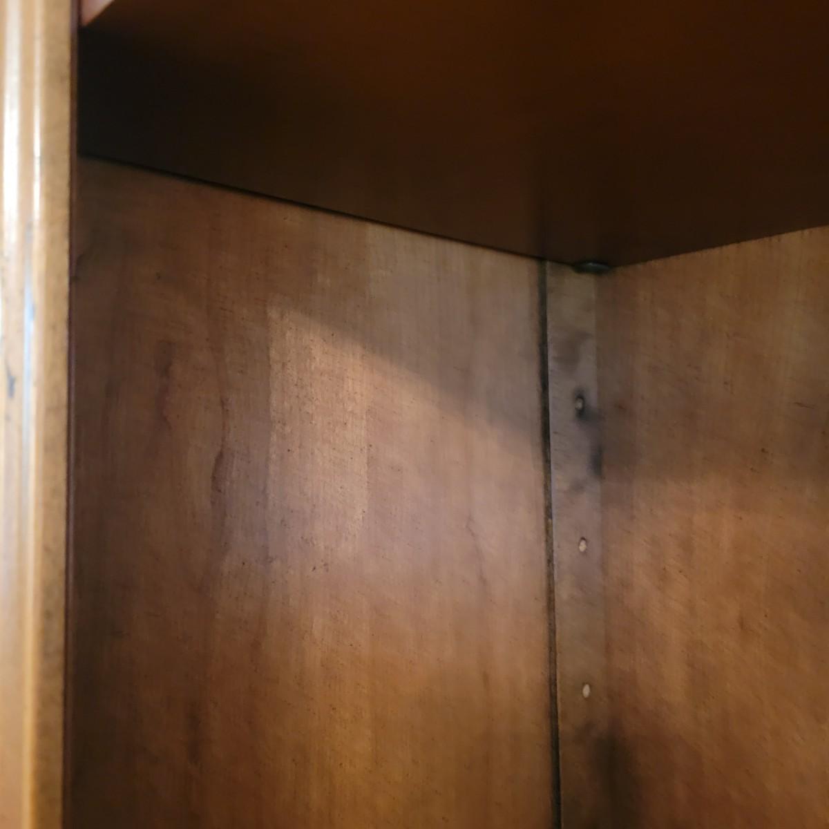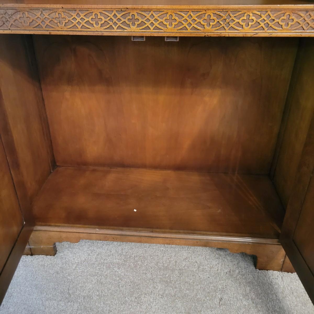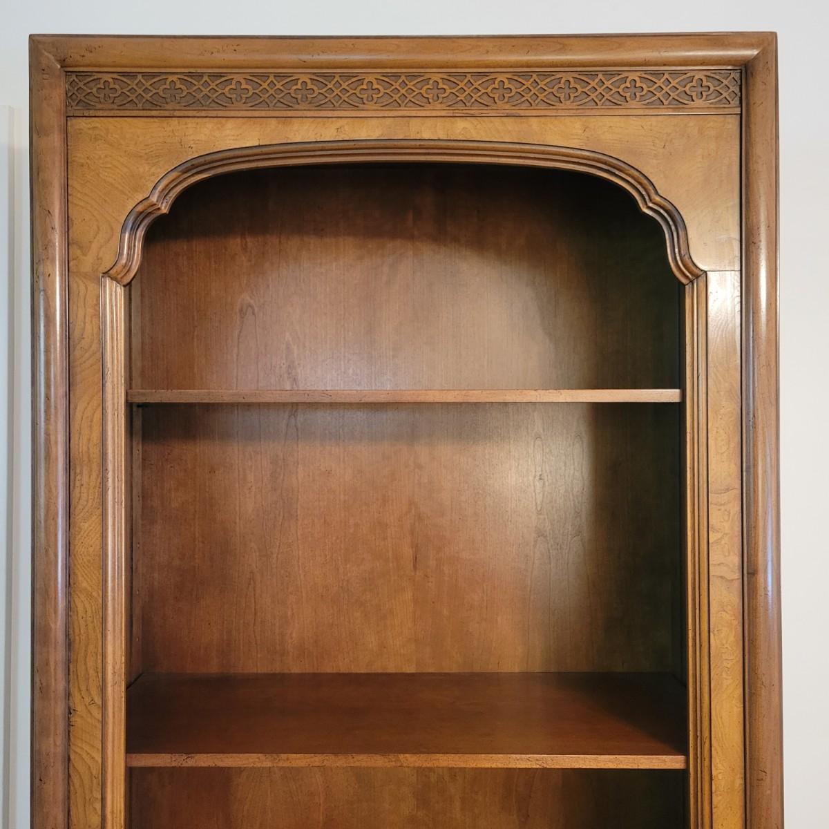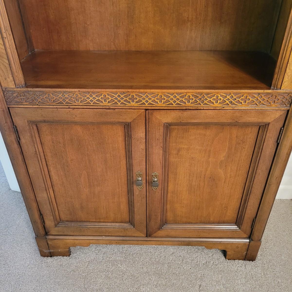 A wooden bookshelf with a cabinet on the bottom. This bookshelf features three adjustable shelves with decorative carvings and an ornate scrolled outer frame. Measures approximately 30" x 12" x 80.5"H. Local pickup only. Winning bidder must bring assistance to help move and load this item due to its weight and/or size.