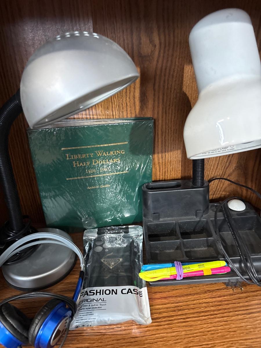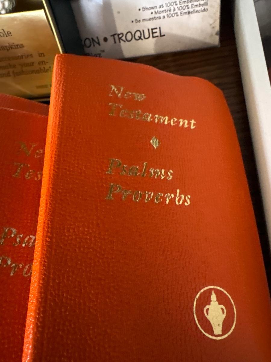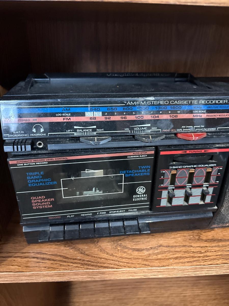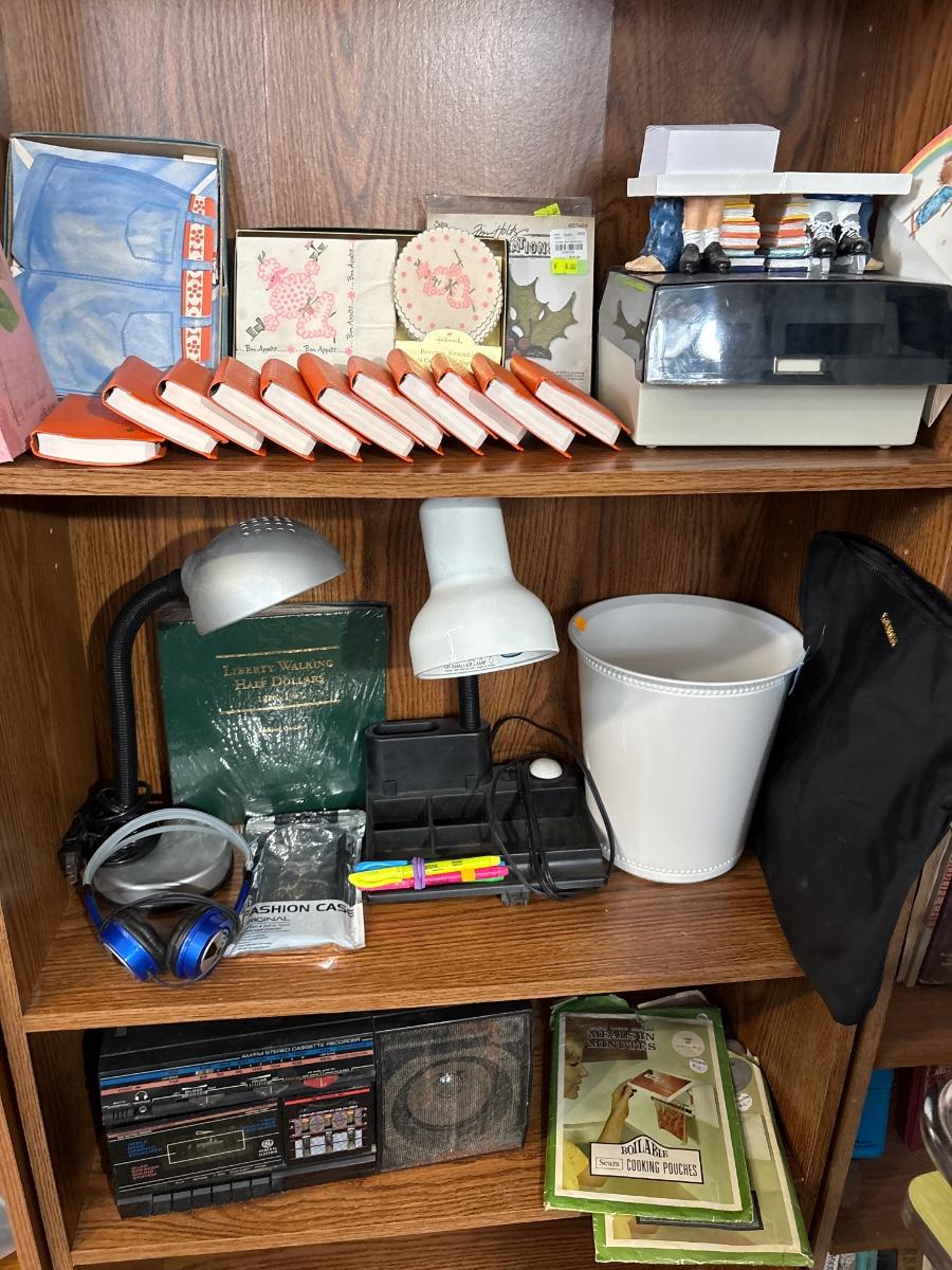 Boombox, desk, lamps, New Testament, vintage beverage set