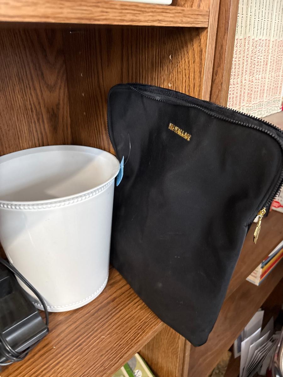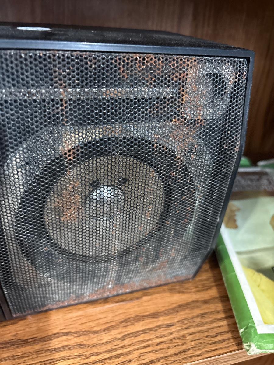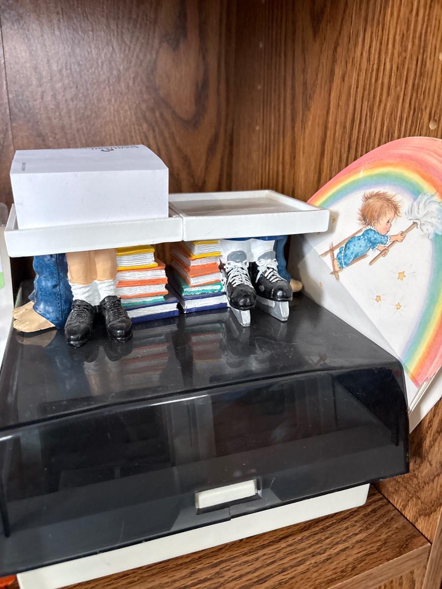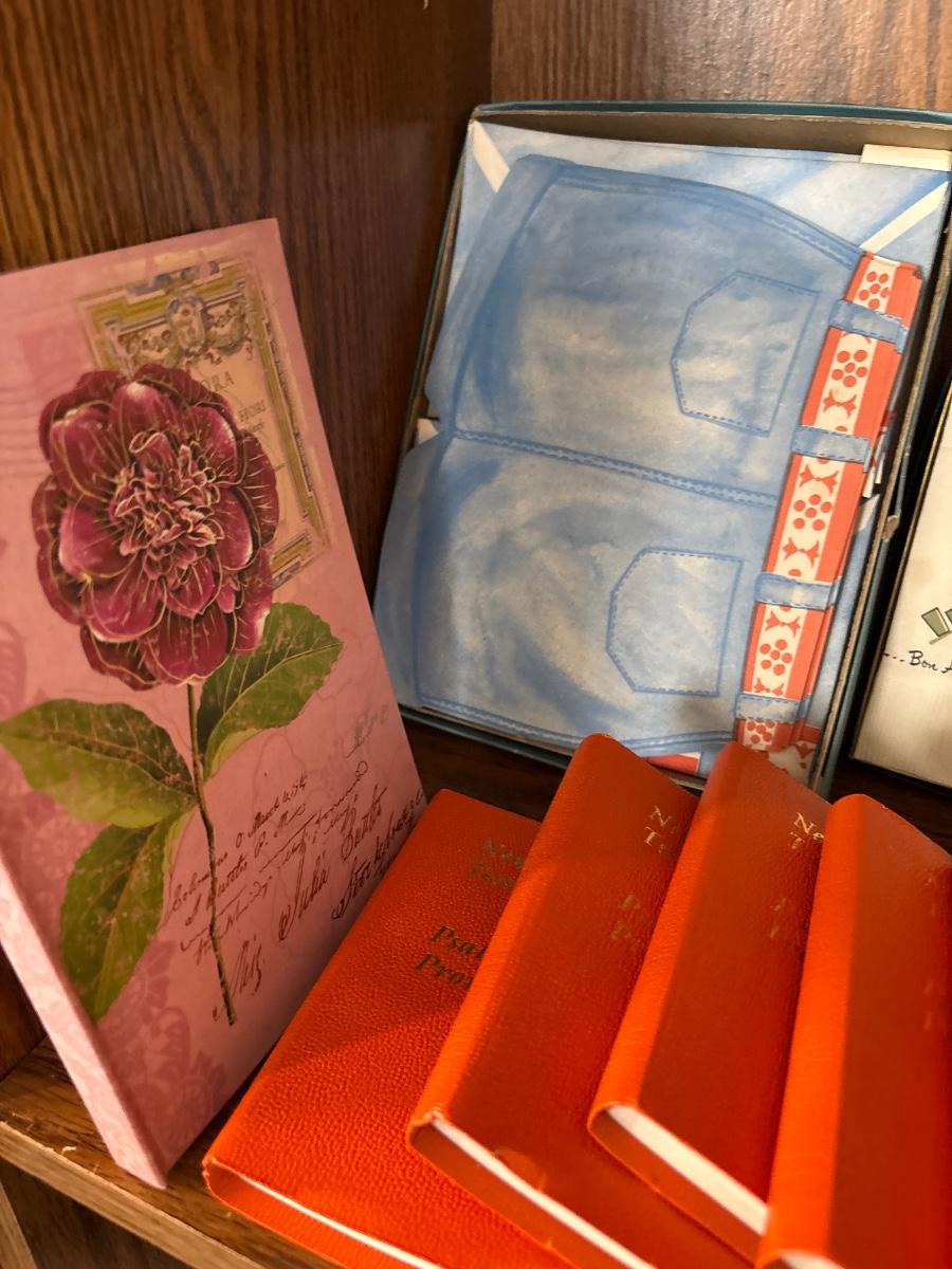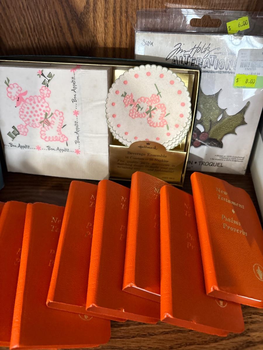 Boombox, desk, lamps, New Testament, vintage beverage set