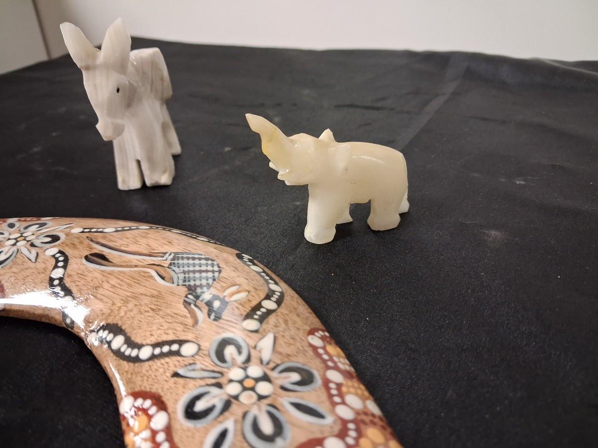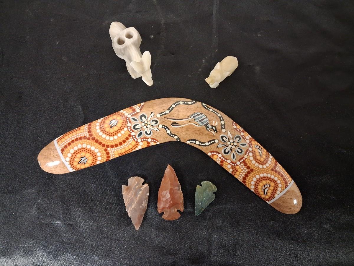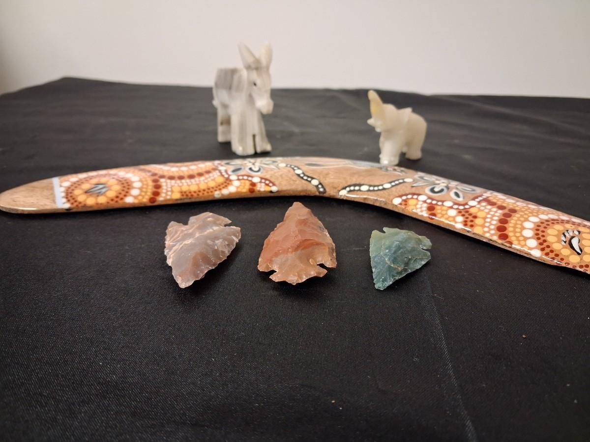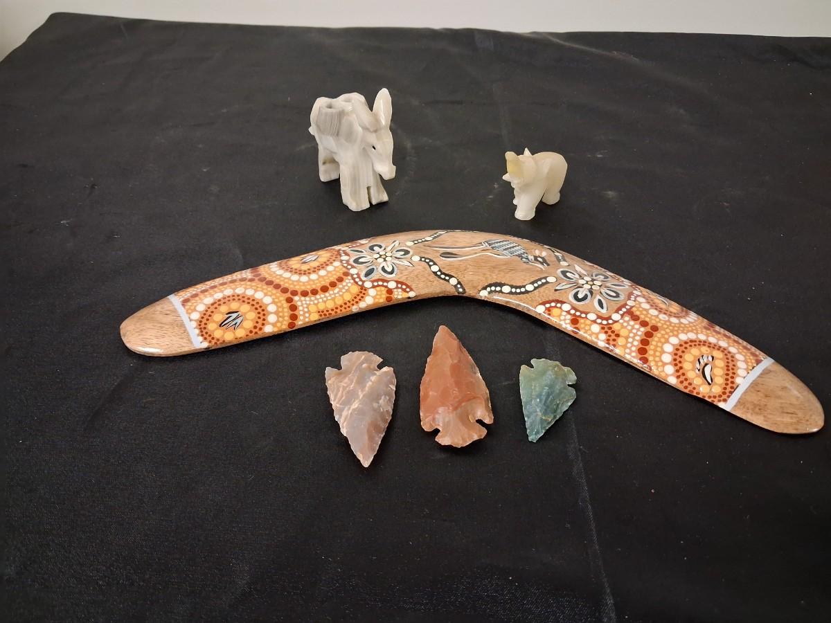 BOOMERANG, MARBLE ELEPHANTS AND STONE ARROWHEADS