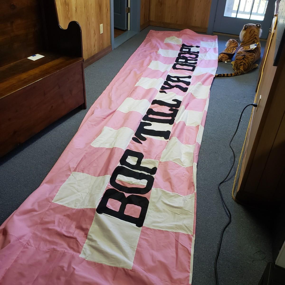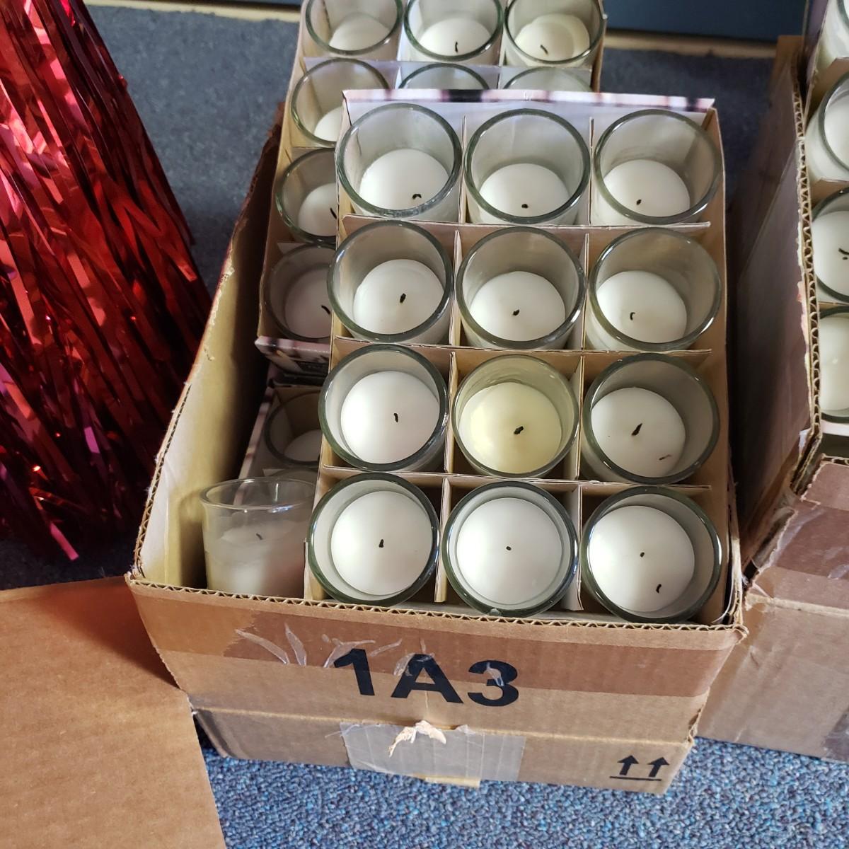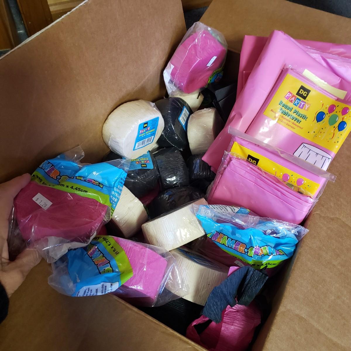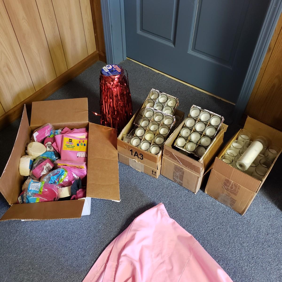 Pink, black and white Bop Til Ya Drop banner measures 16feet x 90" and is hand-sewn out of cotton material. There is a box of streamers and a red sparkly tower. There are multiple boxes of votive candles (have been lit previously) and one box of 8" white candles in clear glass jars.