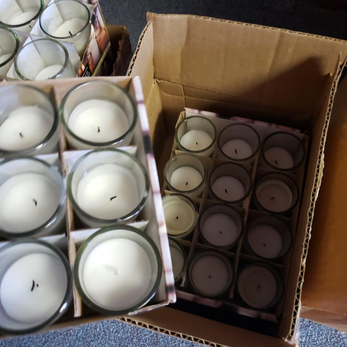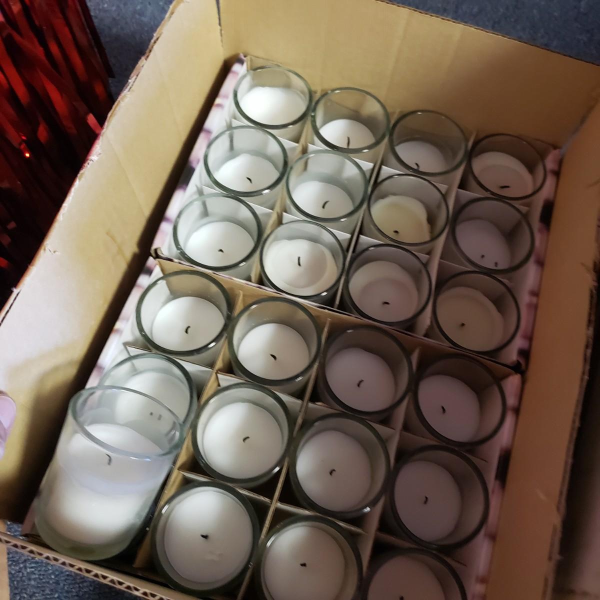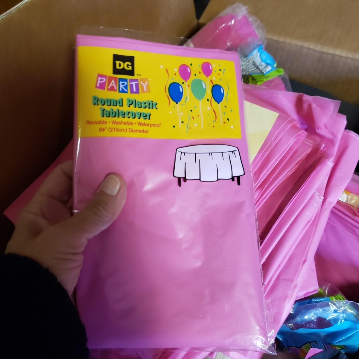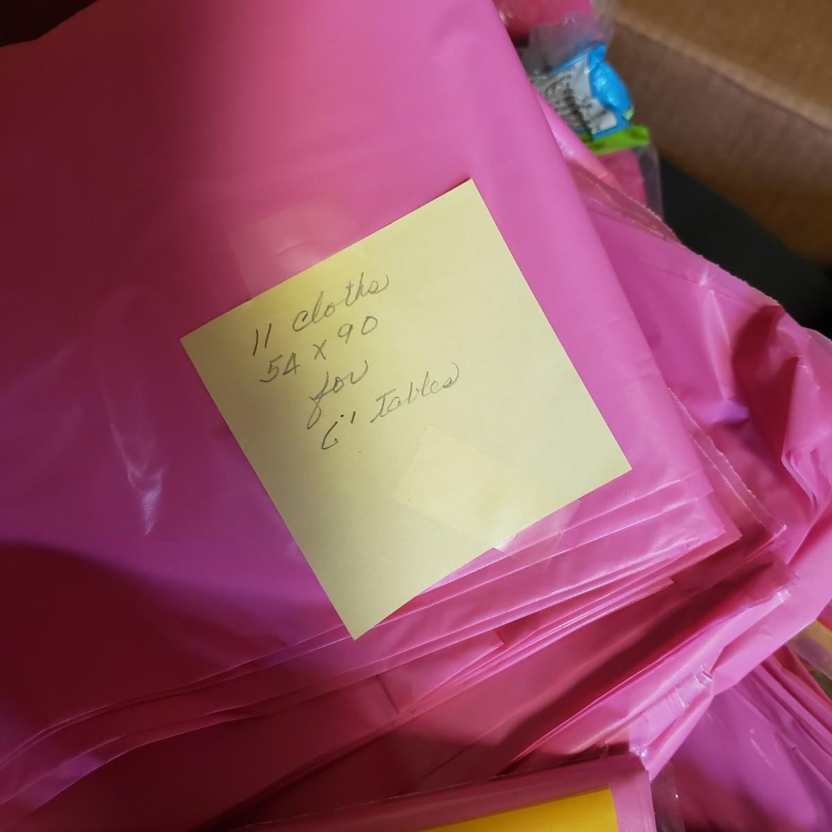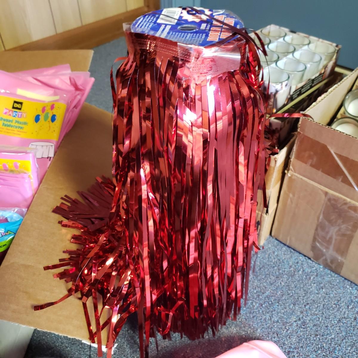 Pink, black and white Bop Til Ya Drop banner measures 16feet x 90" and is hand-sewn out of cotton material. There is a box of streamers and a red sparkly tower. There are multiple boxes of votive candles (have been lit previously) and one box of 8" white candles in clear glass jars.