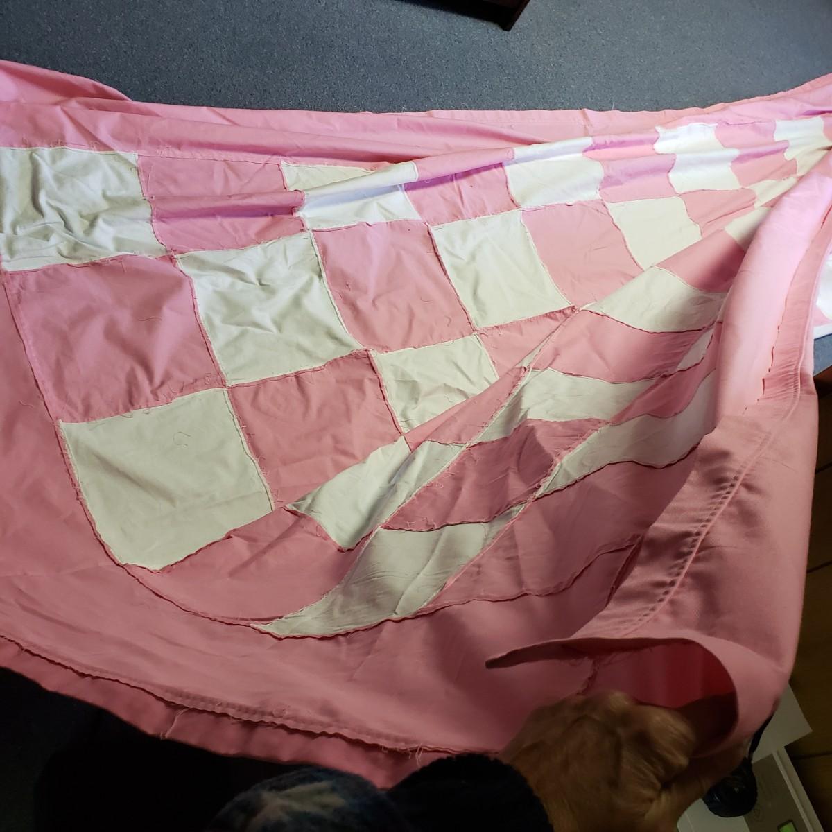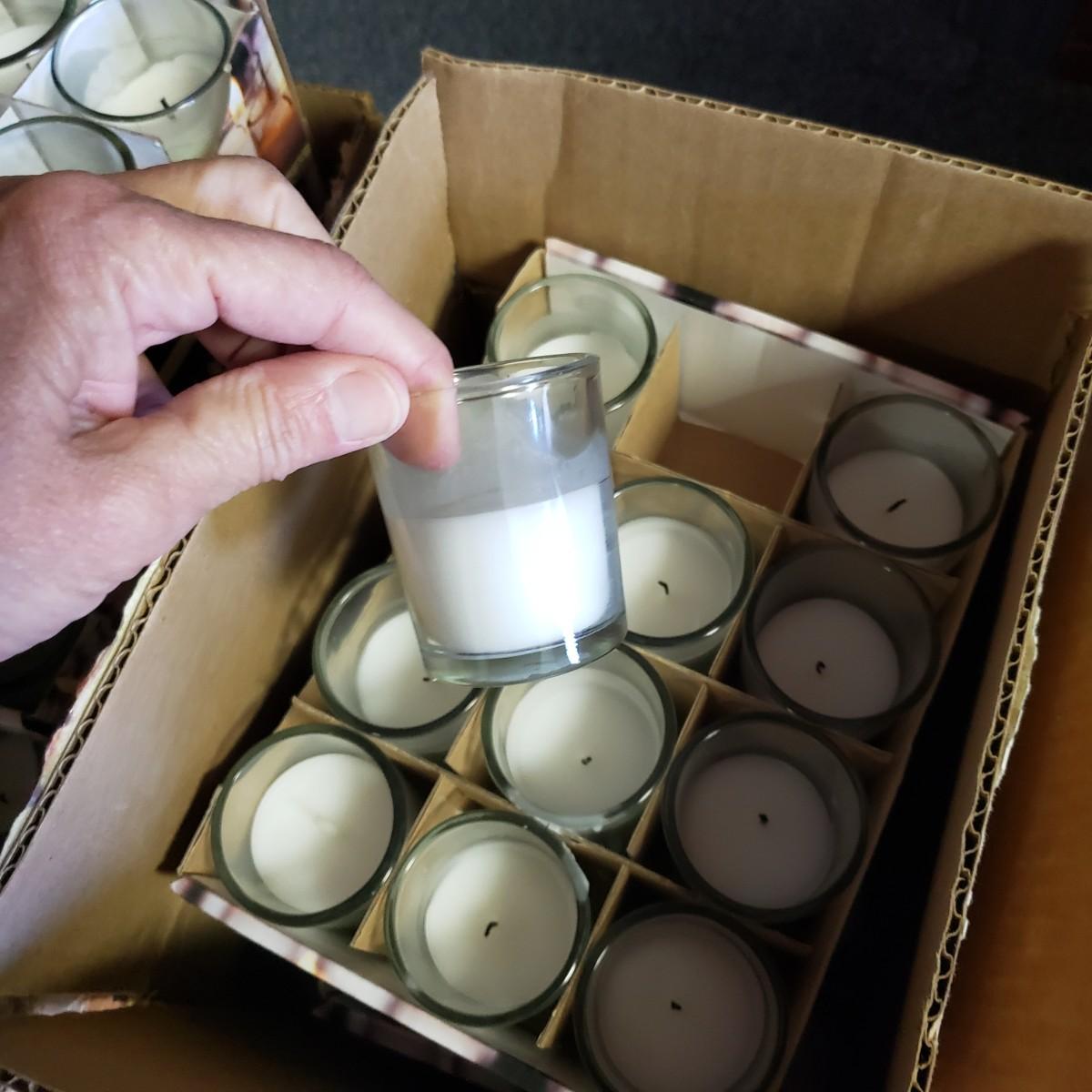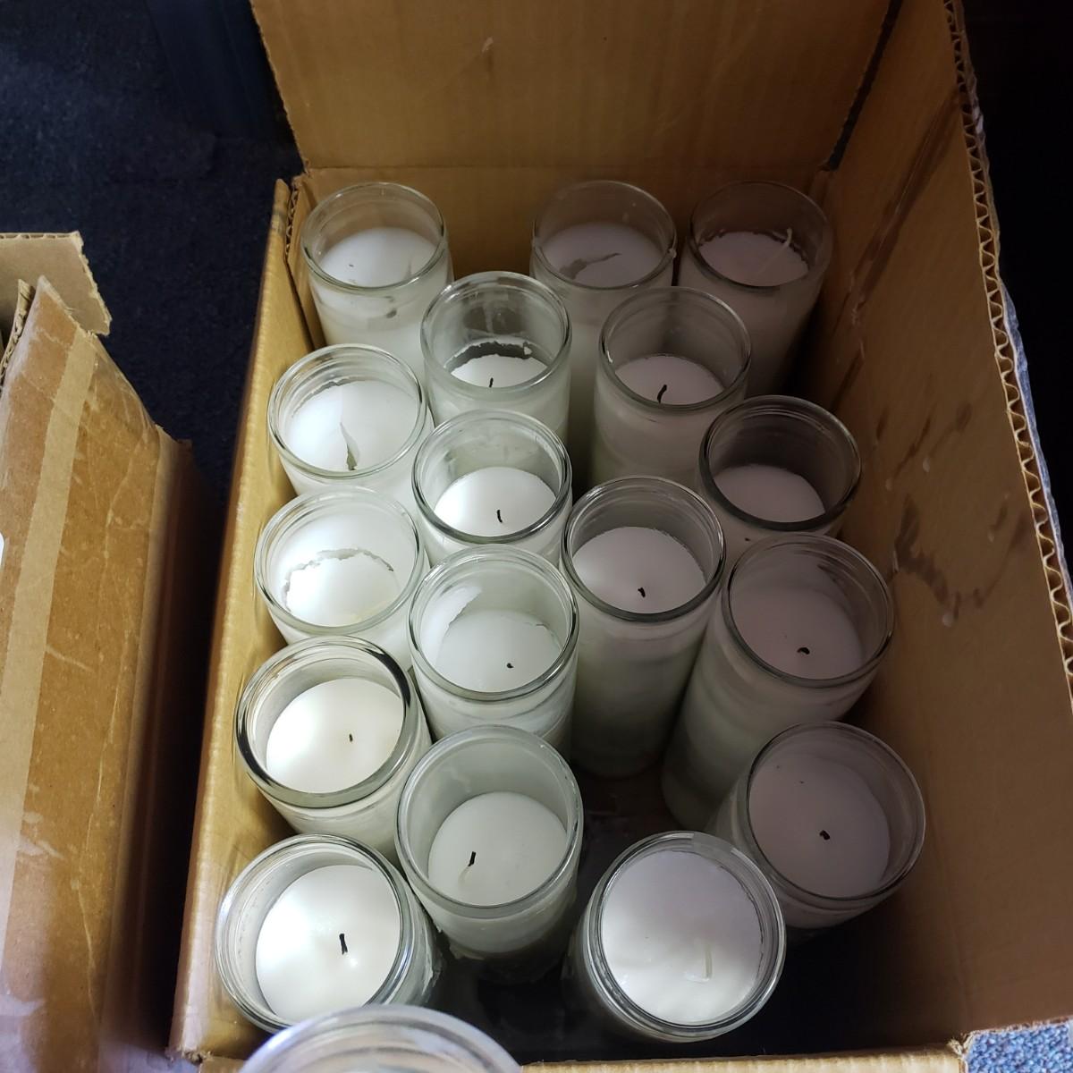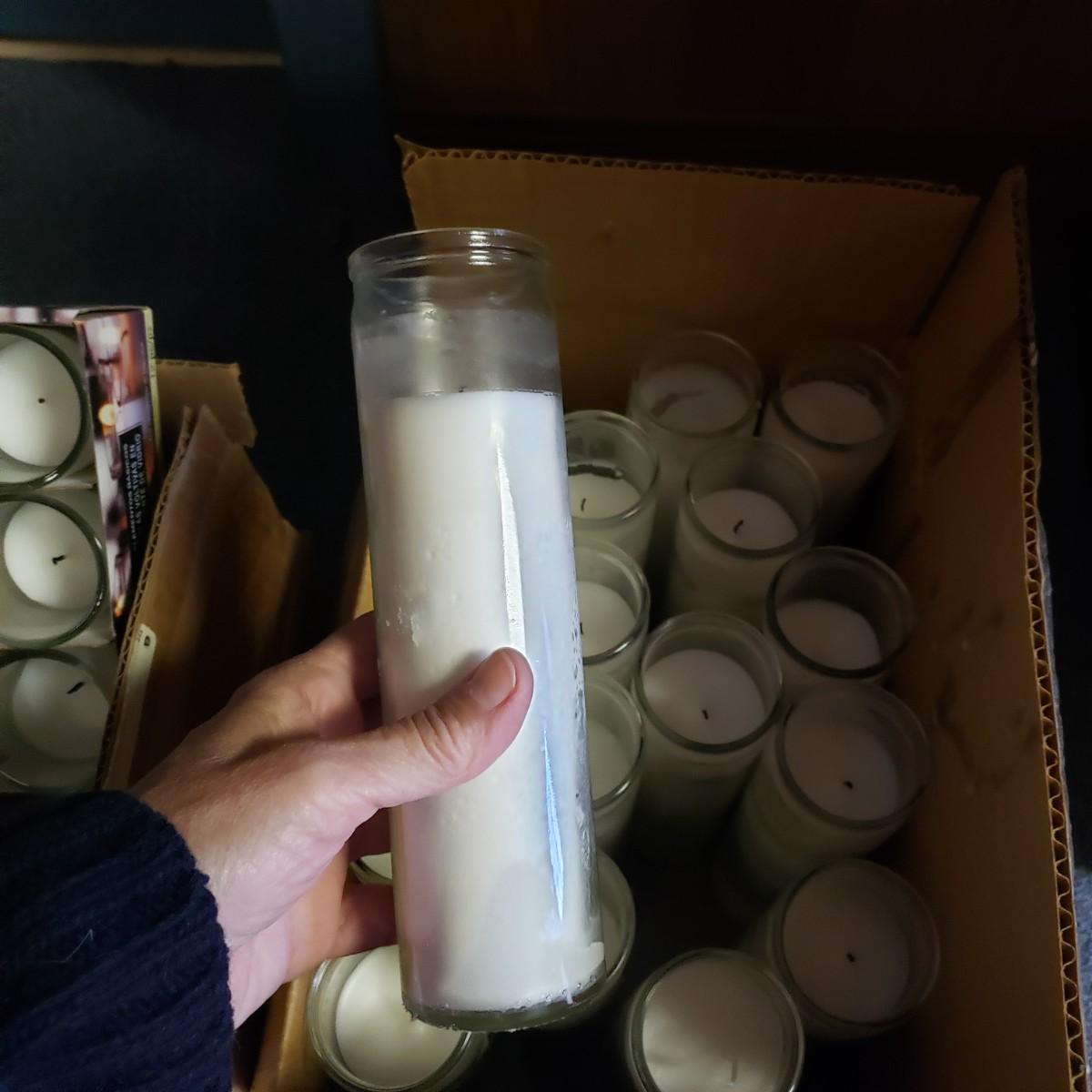 Pink, black and white Bop Til Ya Drop banner measures 16feet x 90" and is hand-sewn out of cotton material. There is a box of streamers and a red sparkly tower. There are multiple boxes of votive candles (have been lit previously) and one box of 8" white candles in clear glass jars.